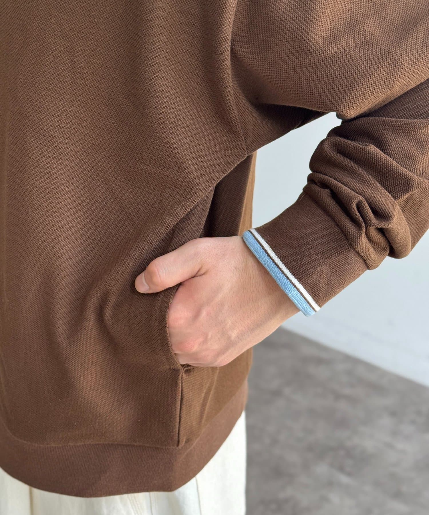 ・胸元にあしらわれたブランドロゴ刺繍が、着こなしに上質感を与える