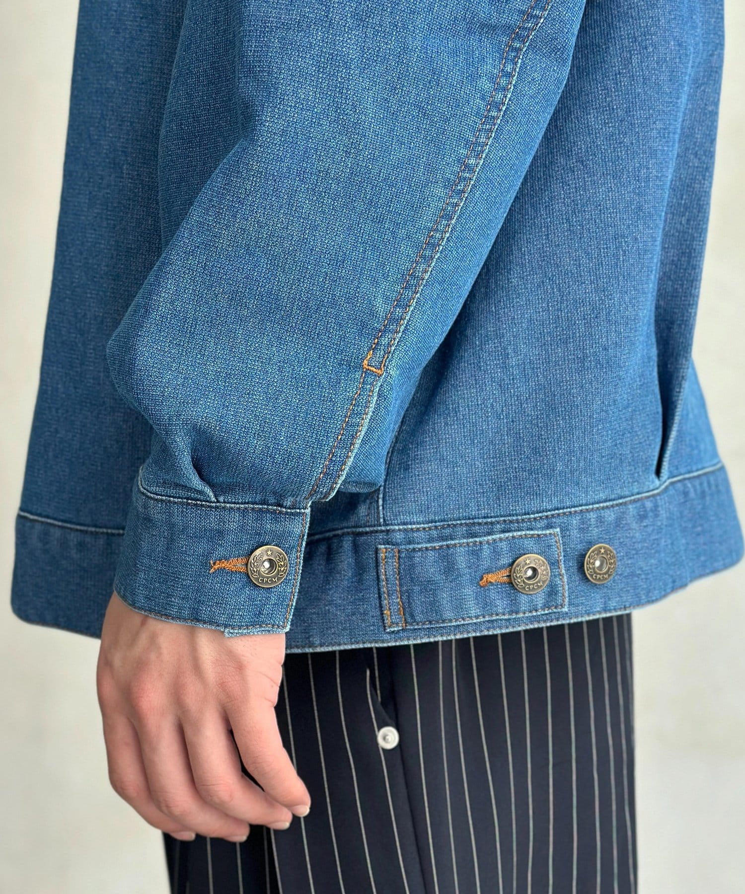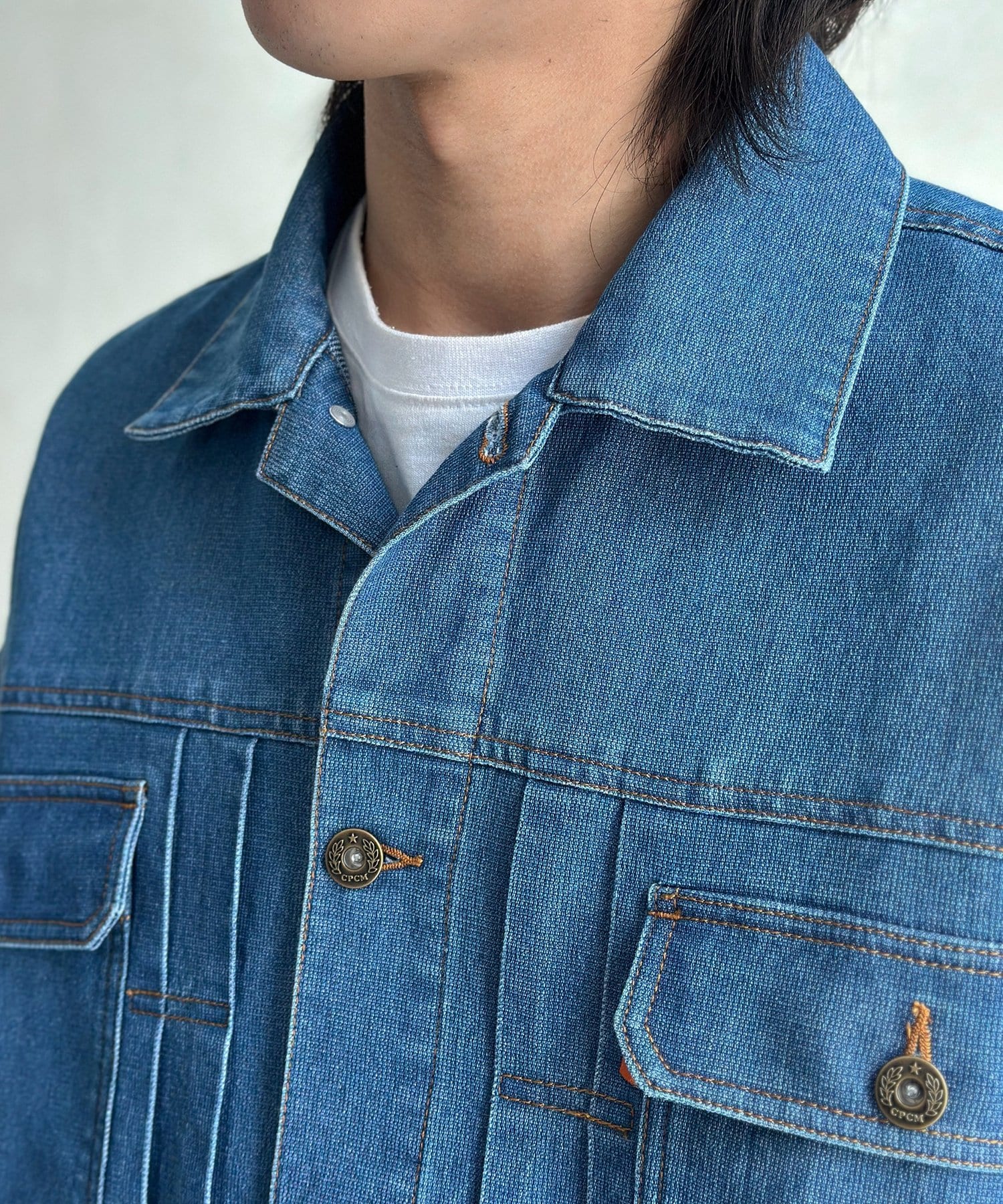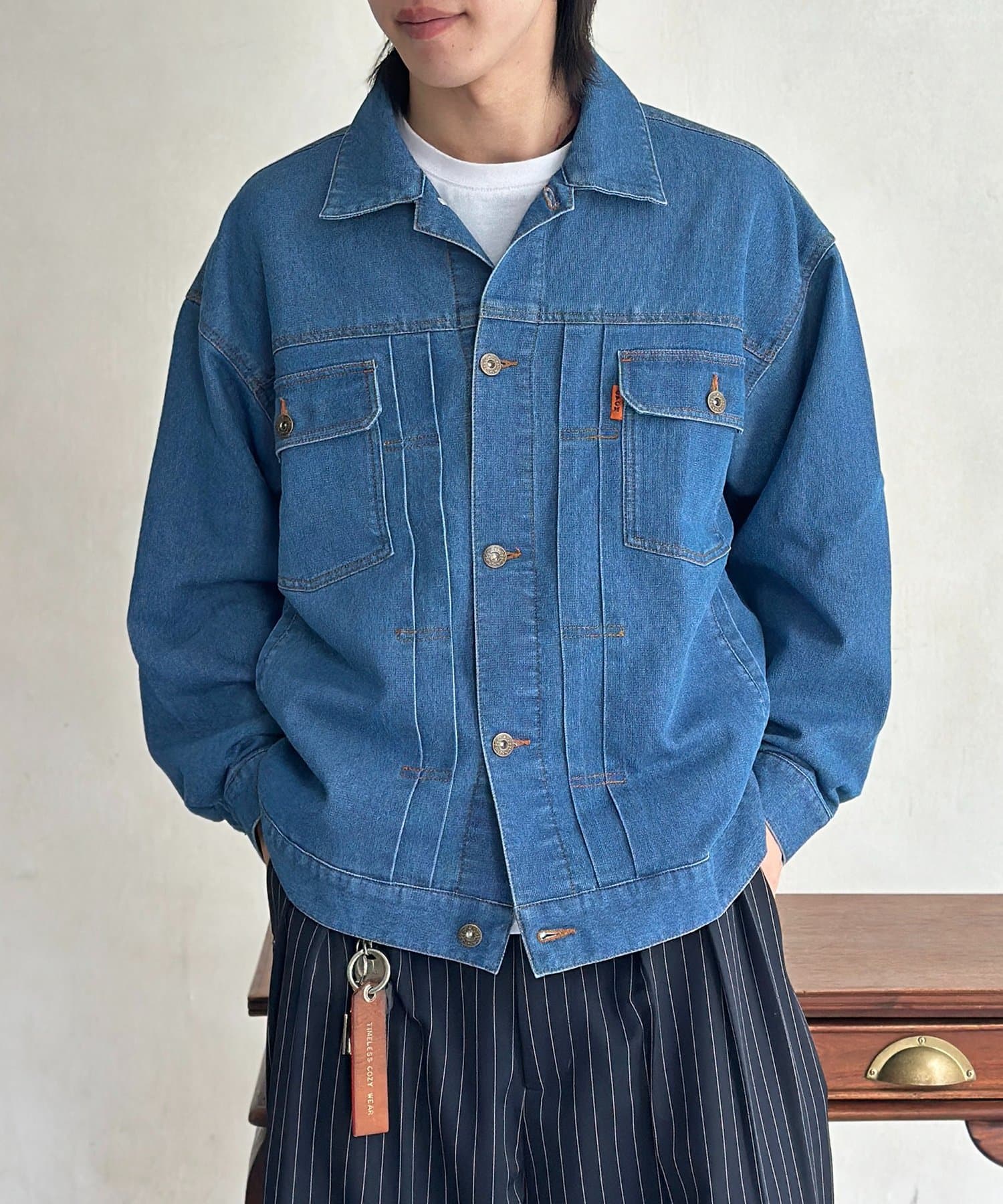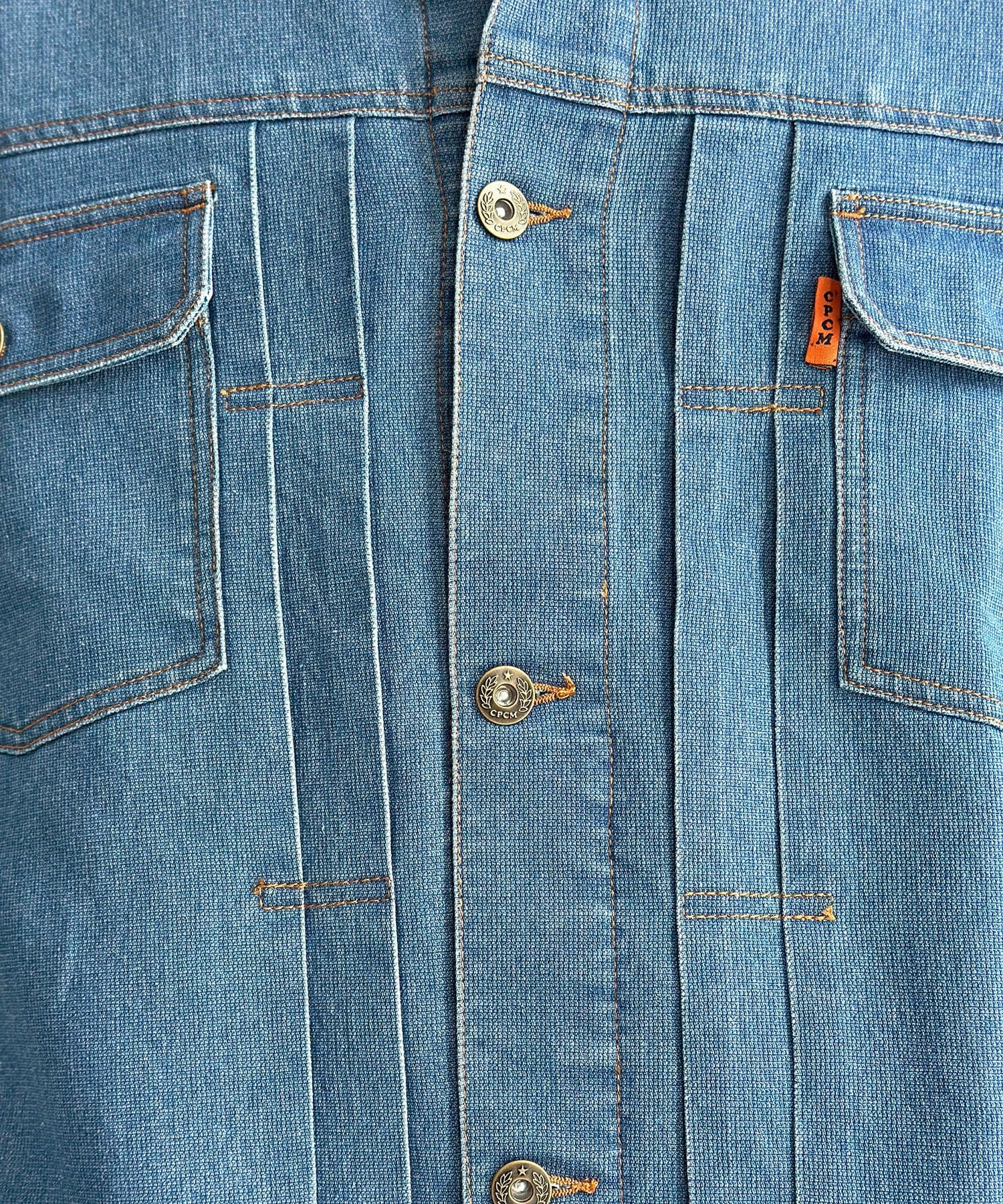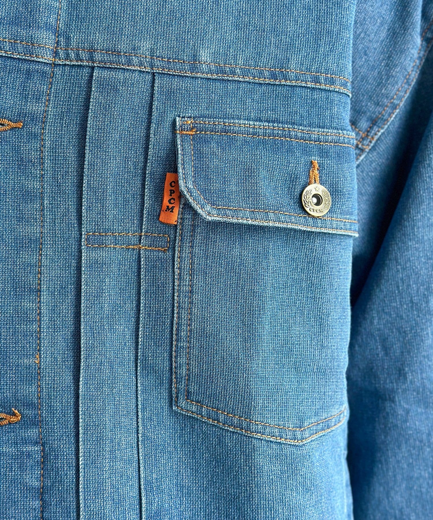 ・胸ポケットのオレンジタブやアンティーク調のボタンが、さりげないアクセントに。