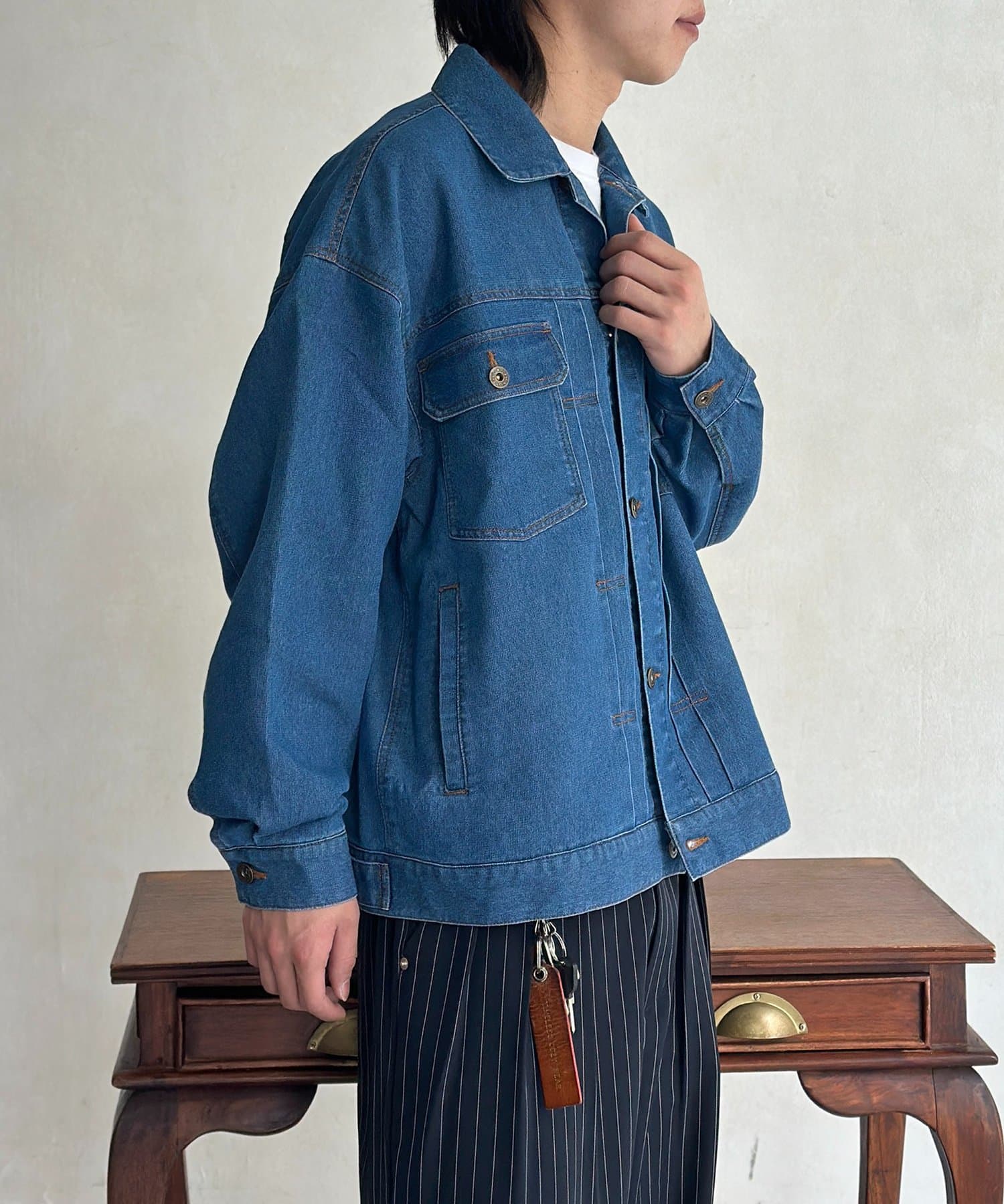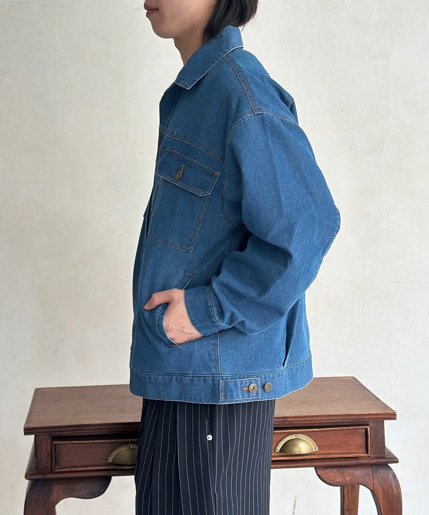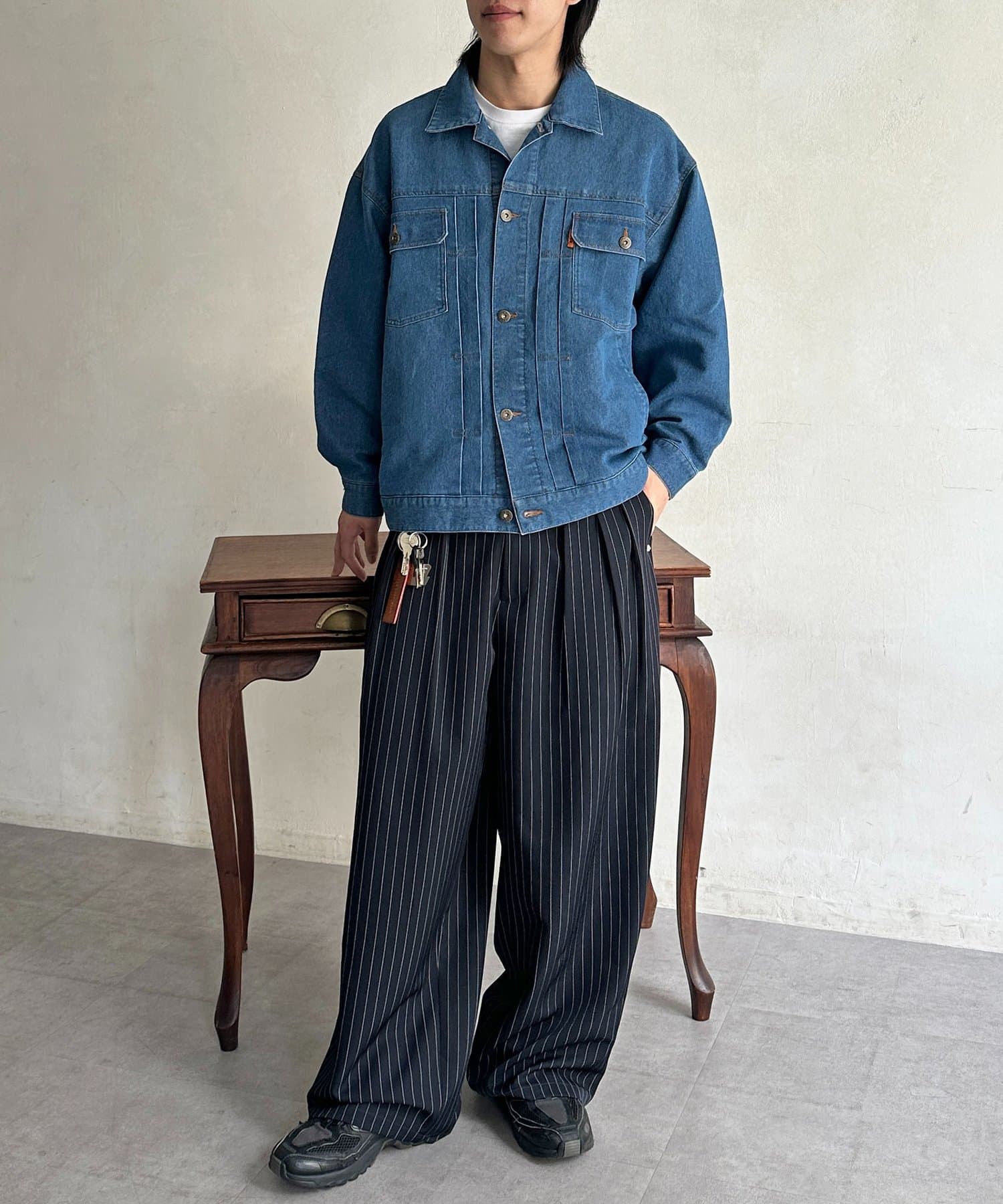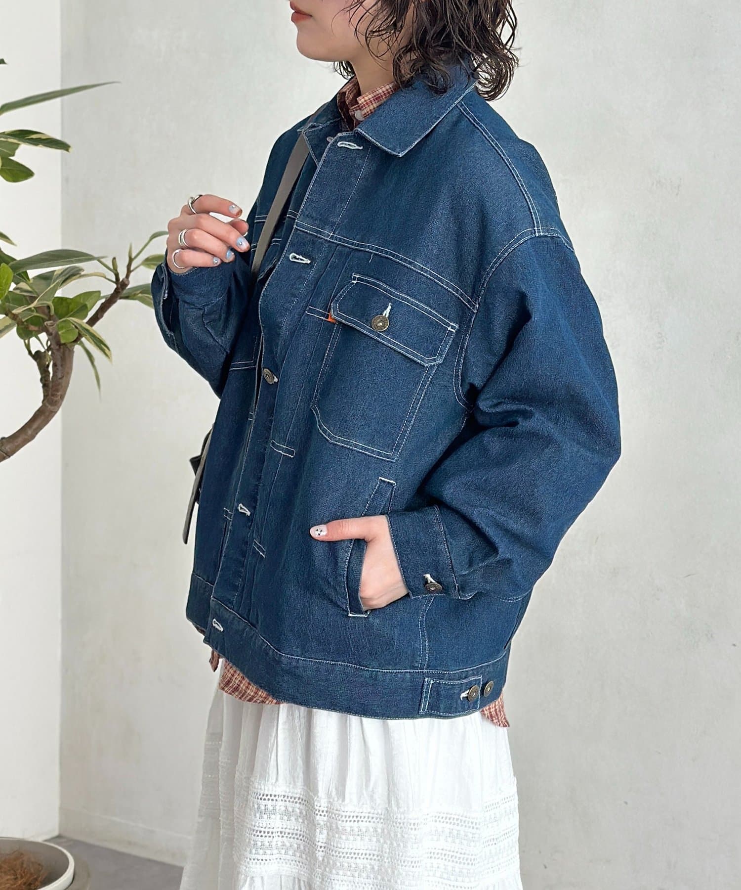 ・肩の落ちたドロップショルダーと、ゆとりのある身幅が作るこなれたシルエット。