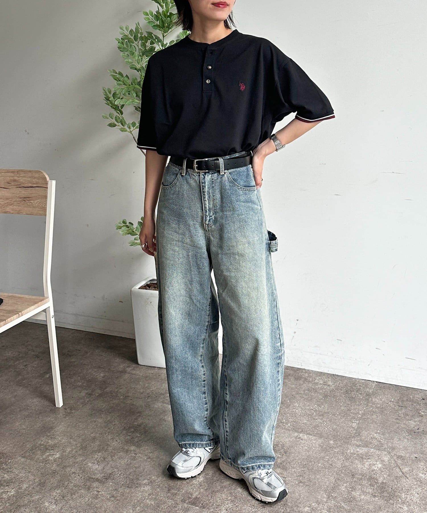 ・デニムやチノパンと合わせて、王道のカジュアルスタイルに。足元はスニーカーでアクティブな印象に。