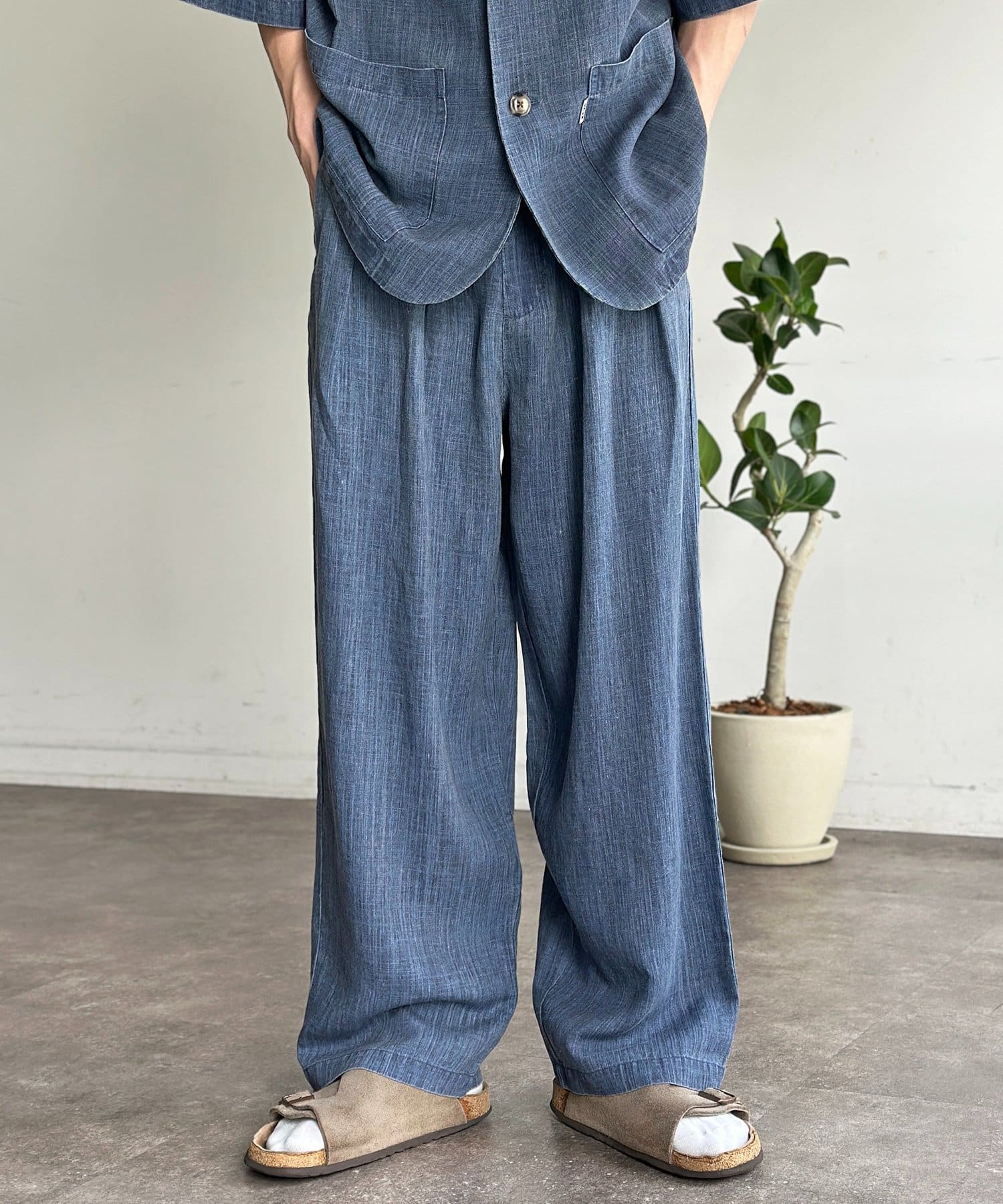 ・無地のTシャツやリネンシャツをタックインし、レザーサンダルやローファーを合わせたきれいめカジュアルスタイル。同素材のジャケットとのセットアップもおすすめです。