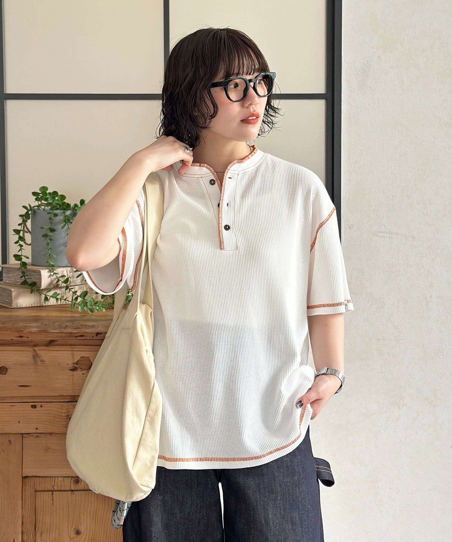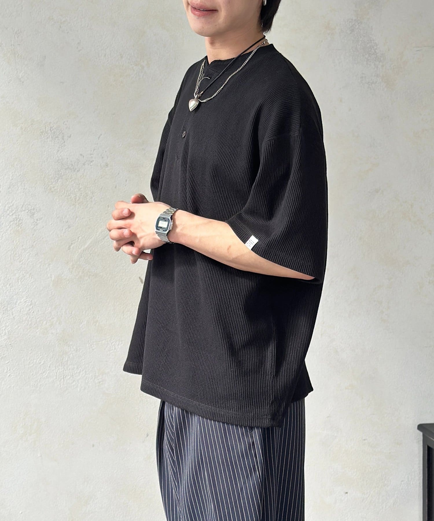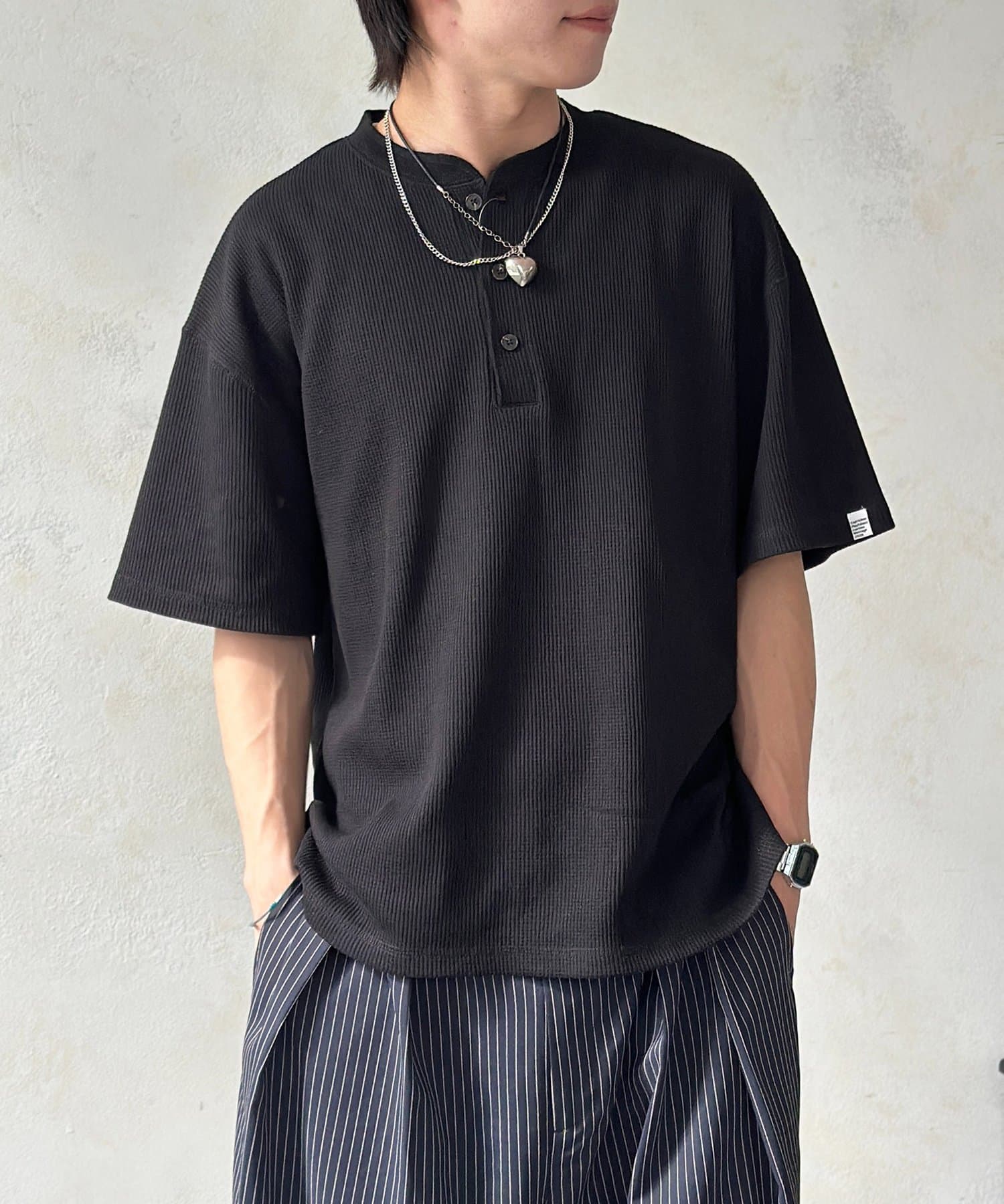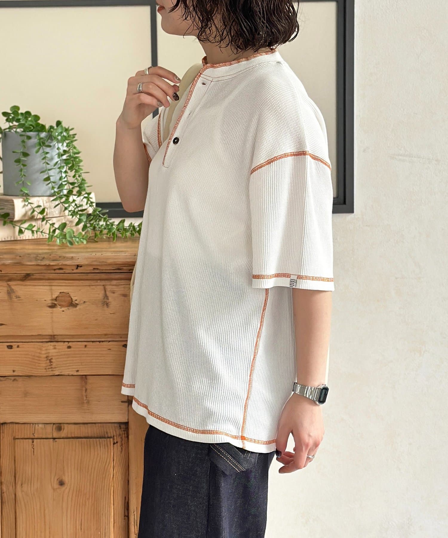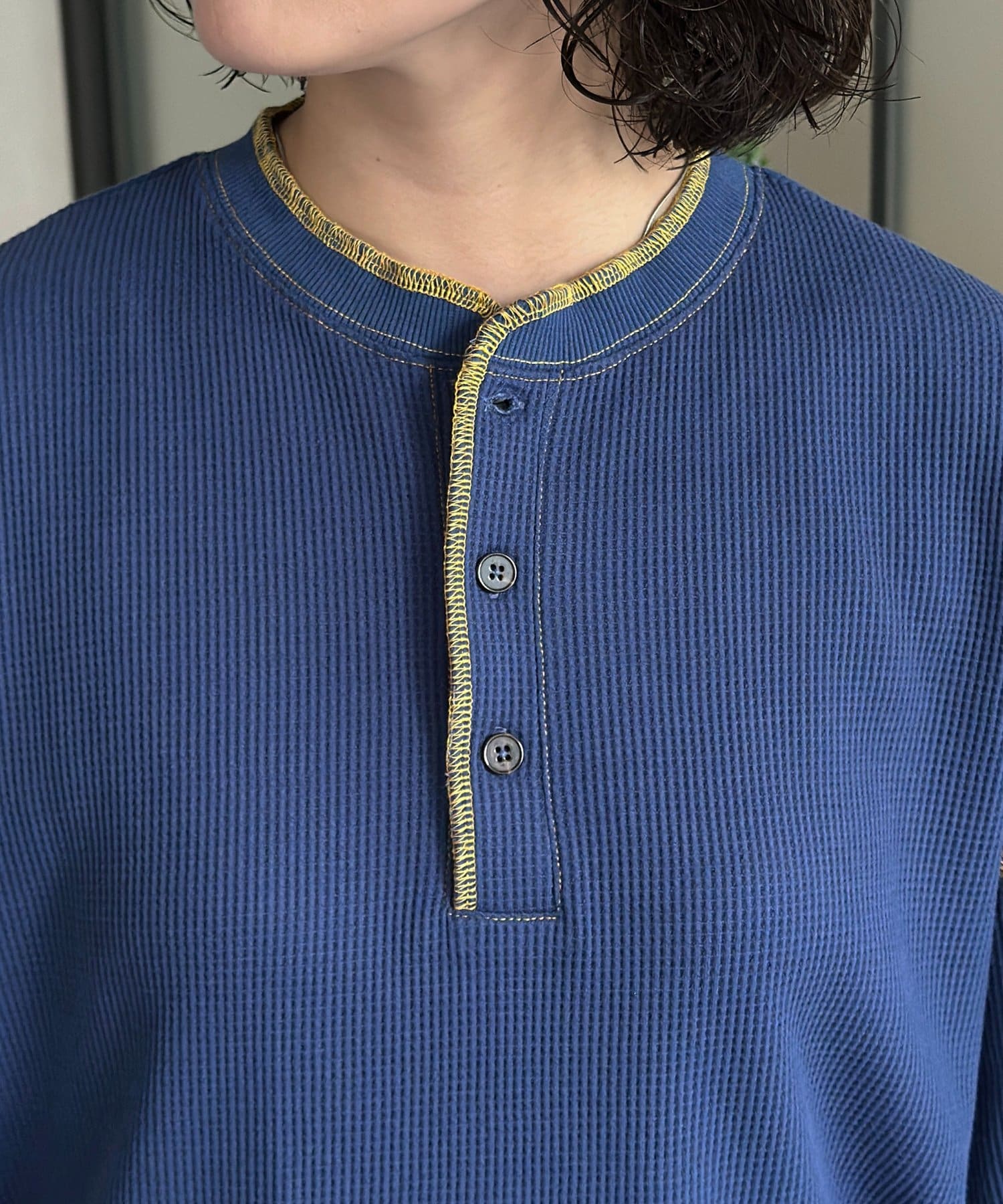 ・表情豊かなワッフル素材と、首元に抜け感をプラスするヘンリーネックデザイン