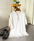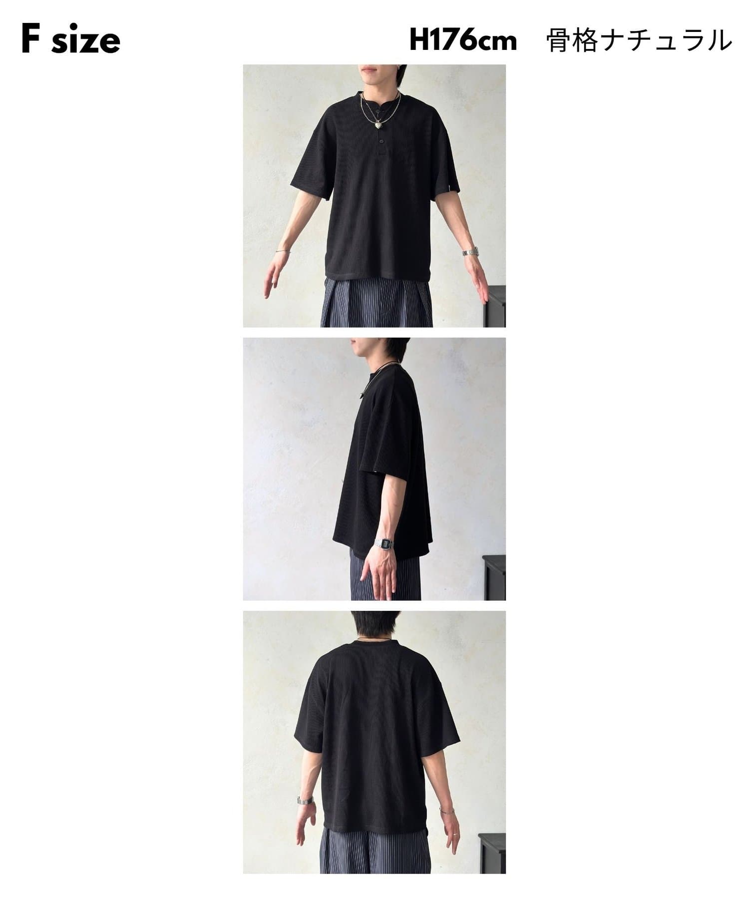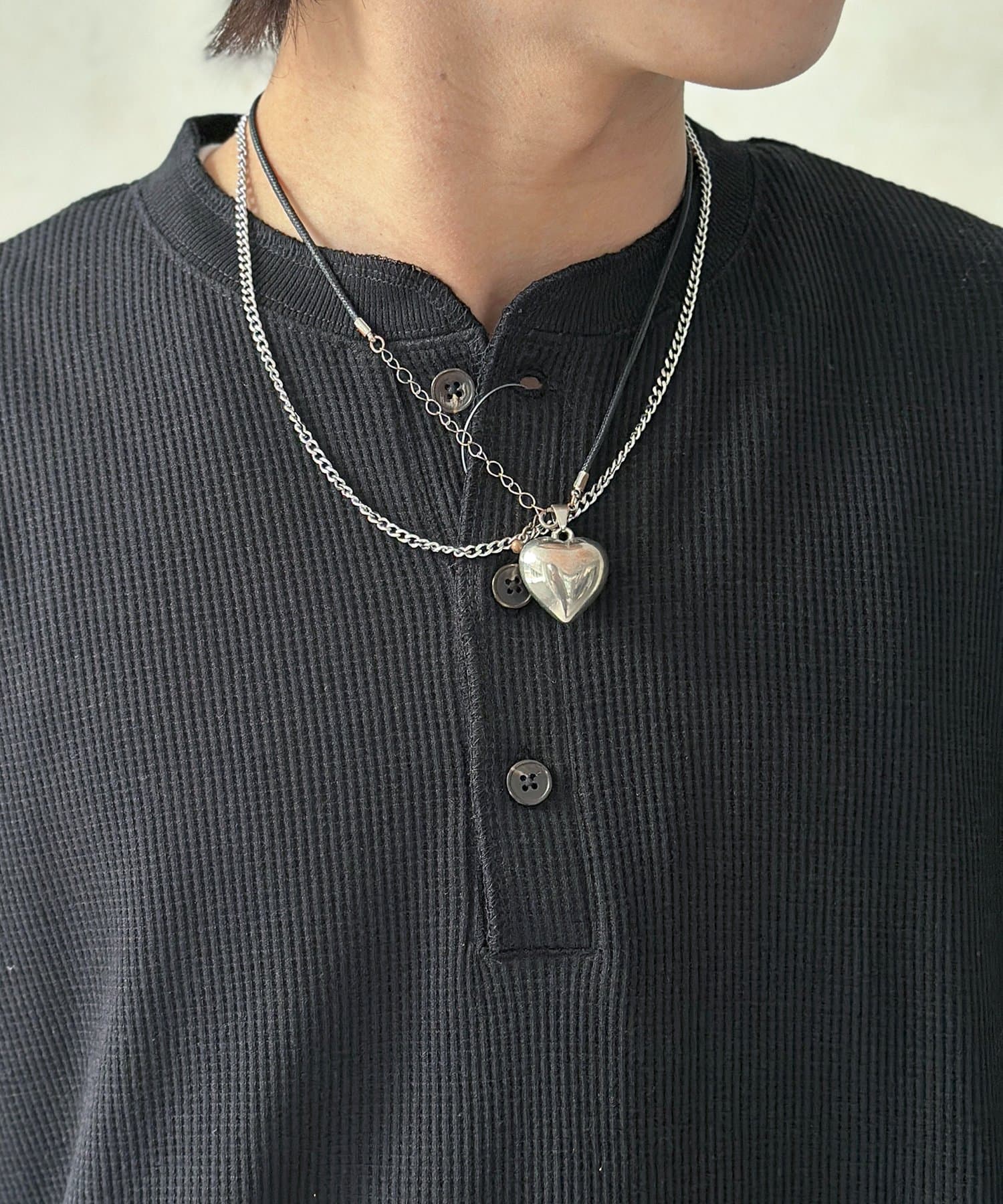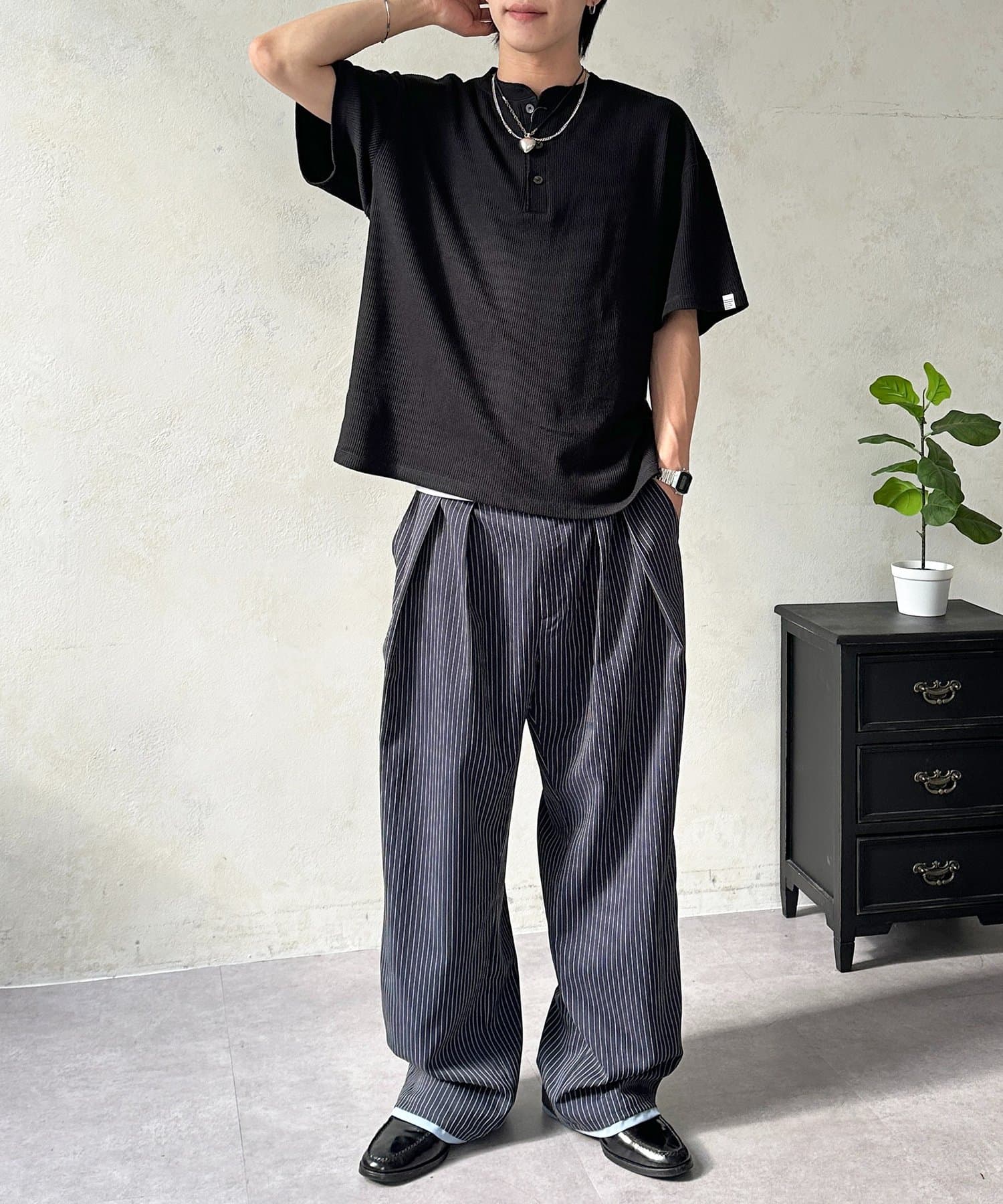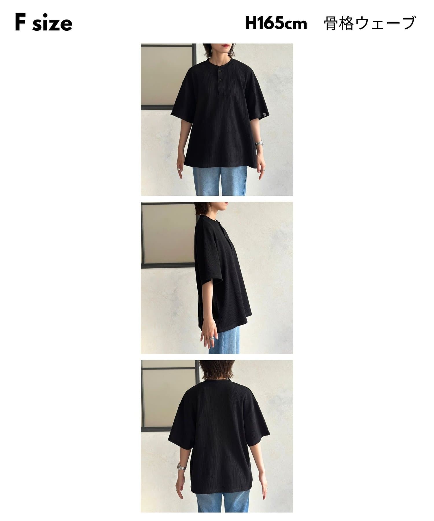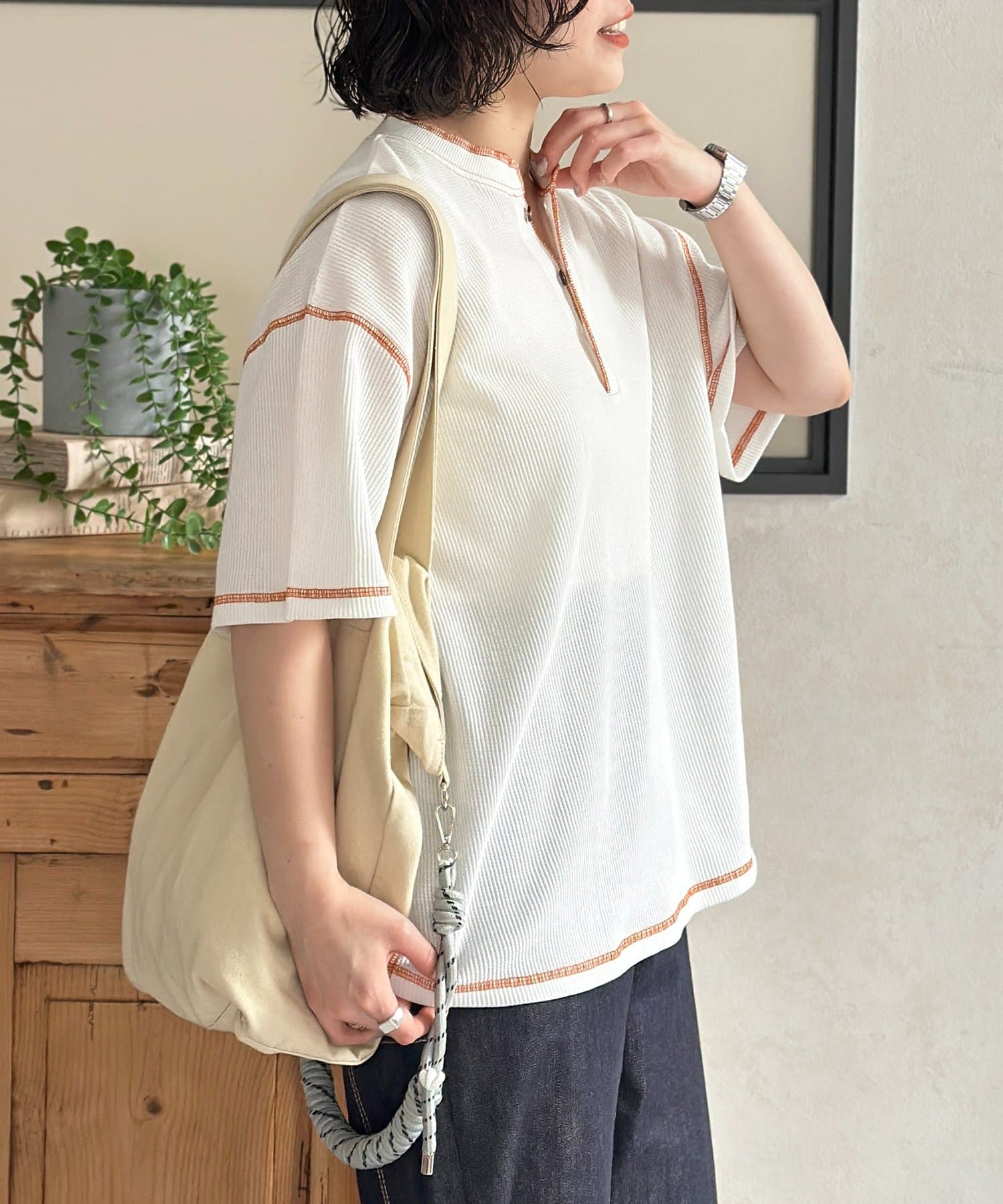 ・表情豊かなワッフル素材と、首元に抜け感をプラスするヘンリーネックデザイン