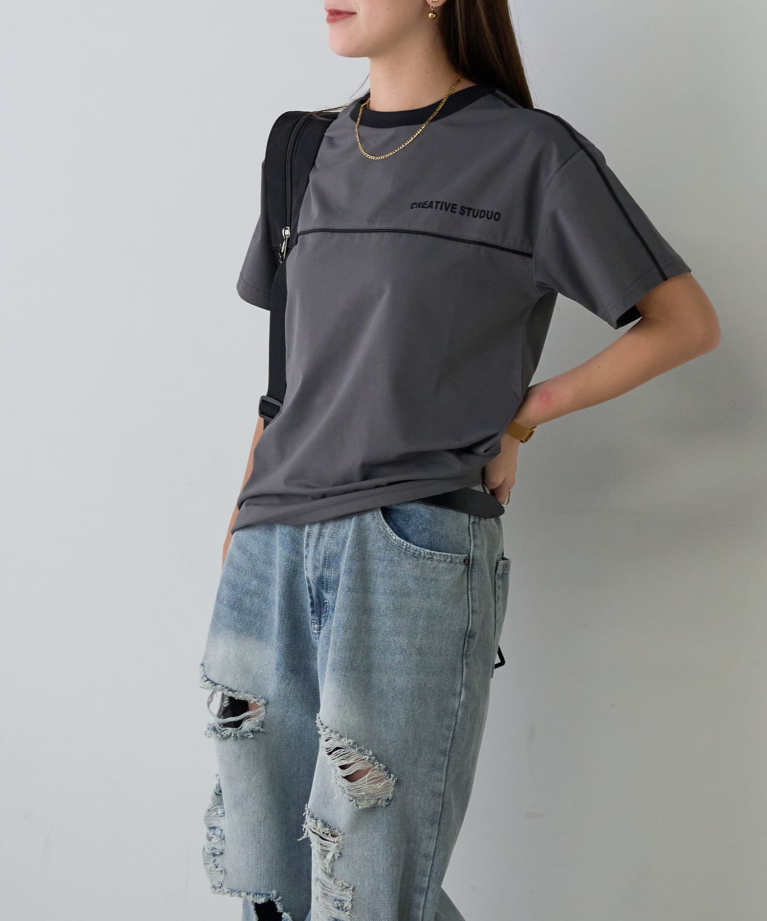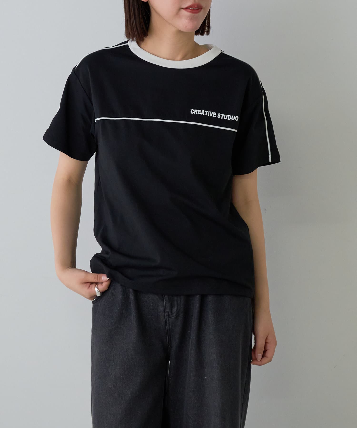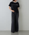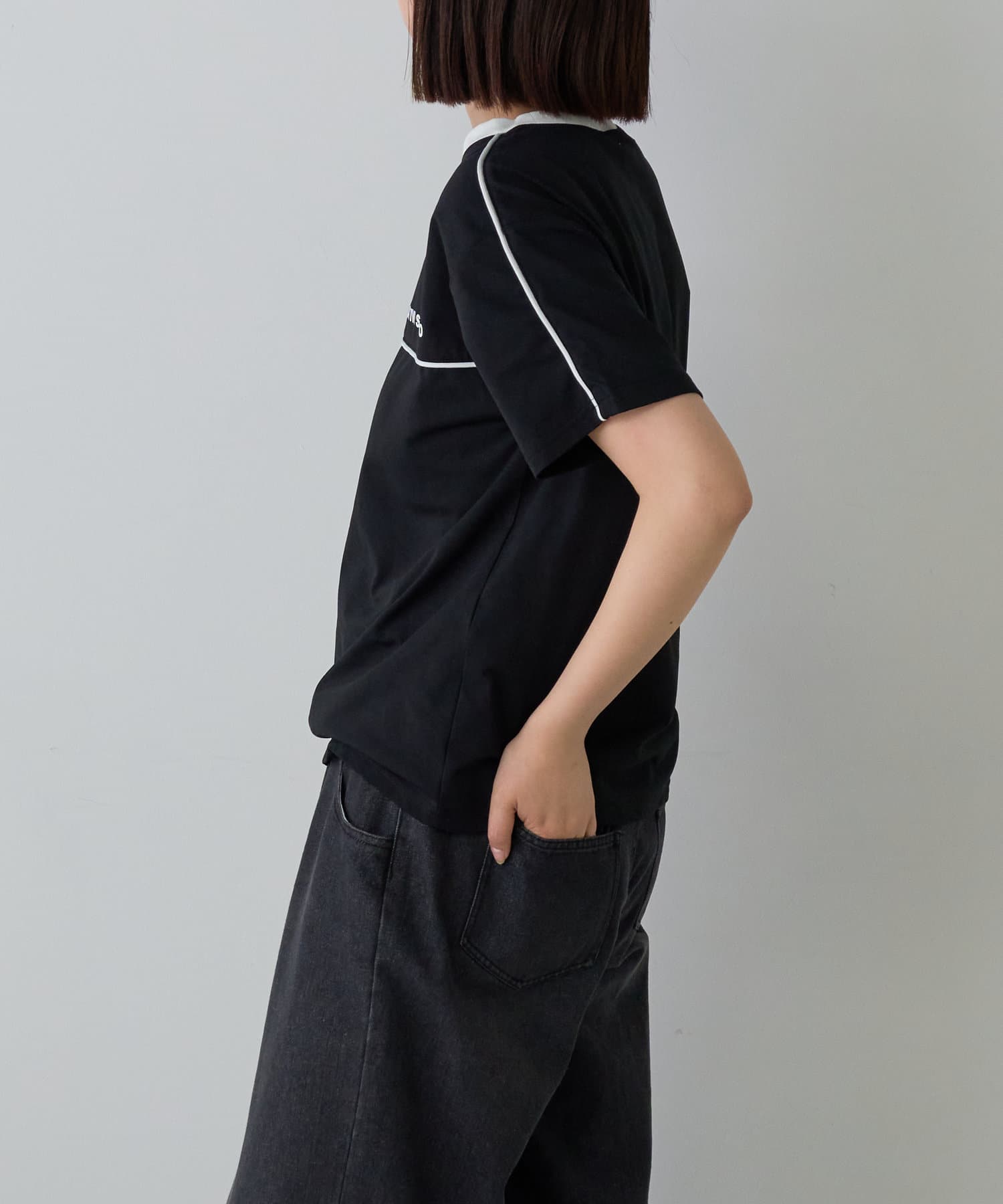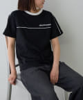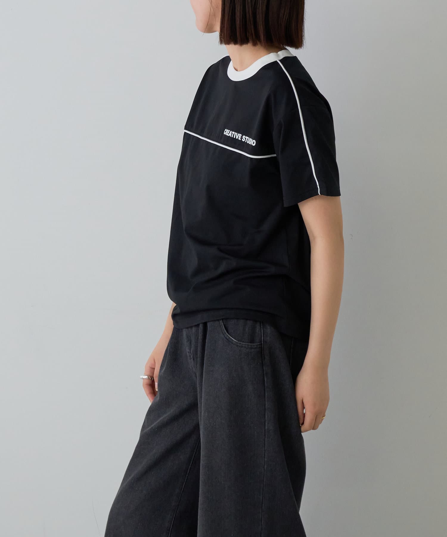 ・黒のパイピングが施されたTシャツにで荷を合わせてモード感のあるストリートスタイルに◎