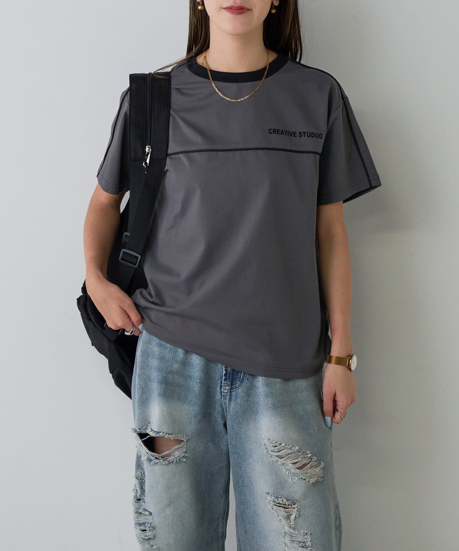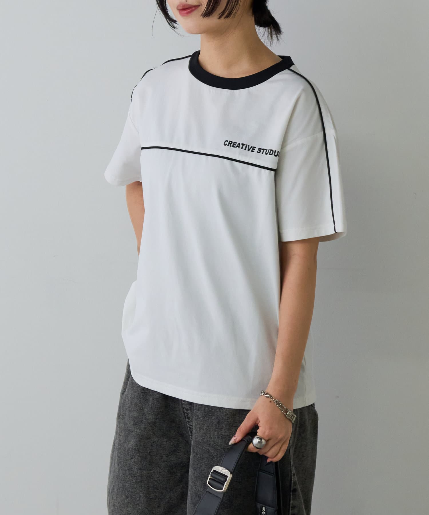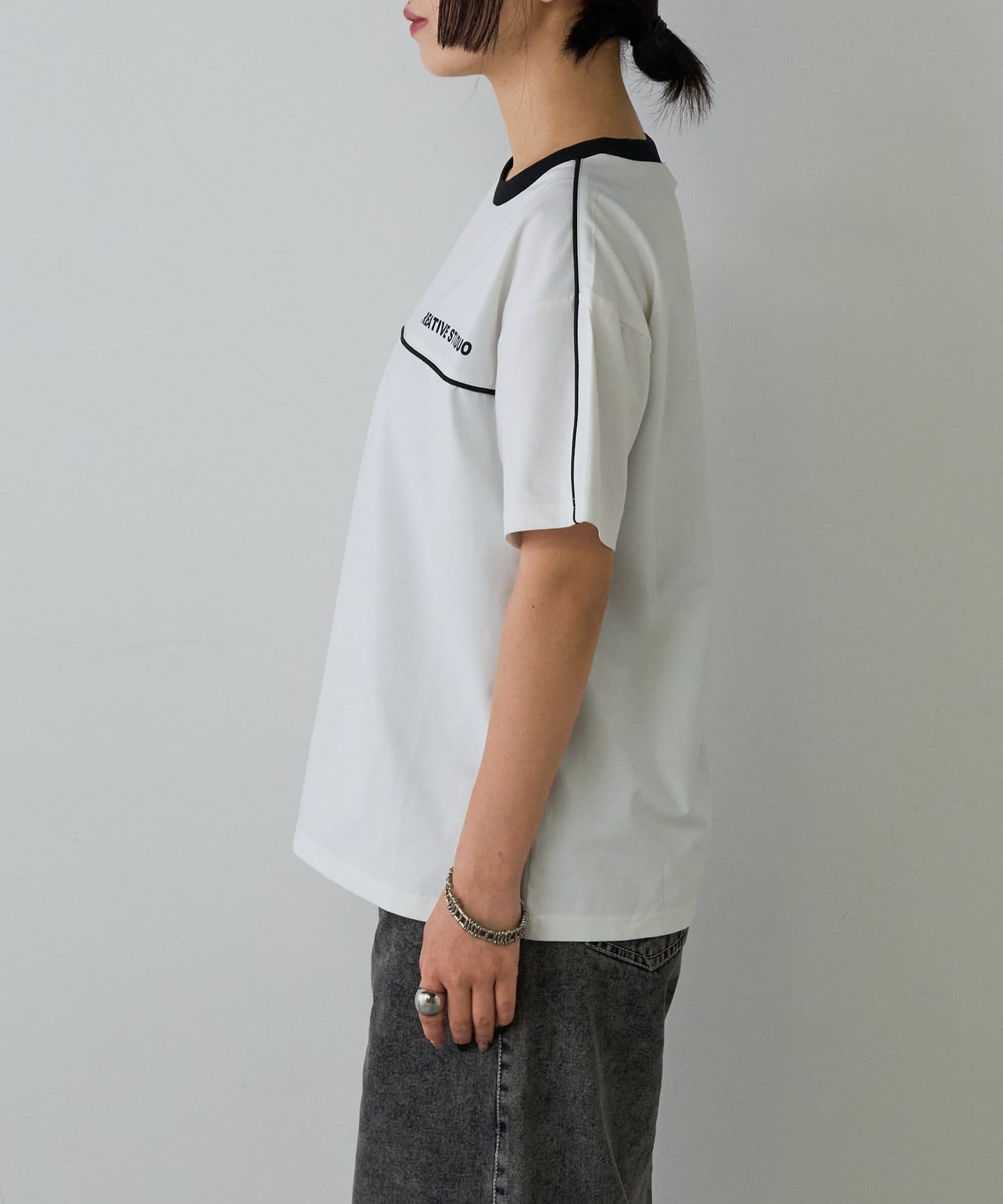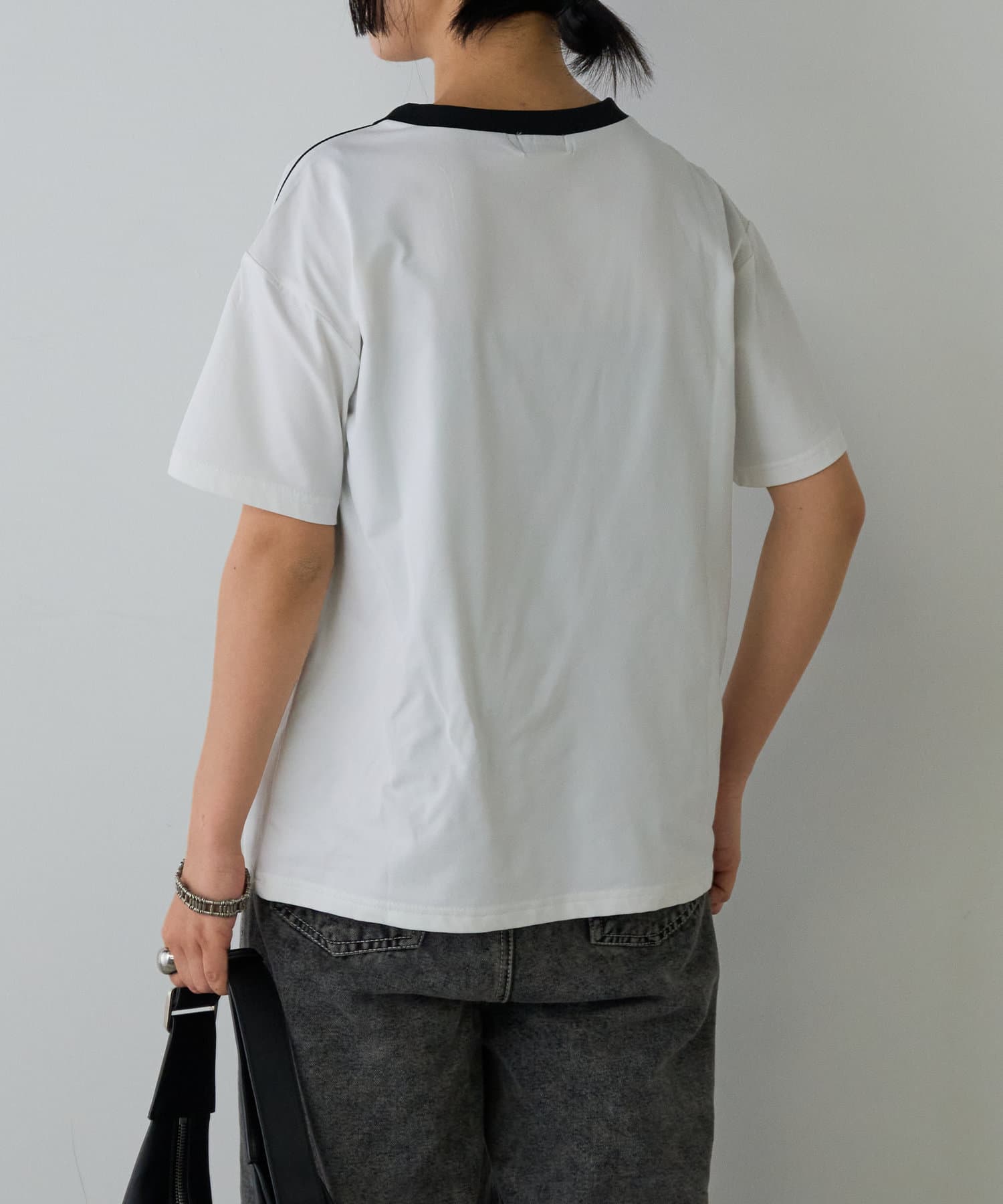 ・黒のパイピングが施されたTシャツにで荷を合わせてモード感のあるストリートスタイルに◎