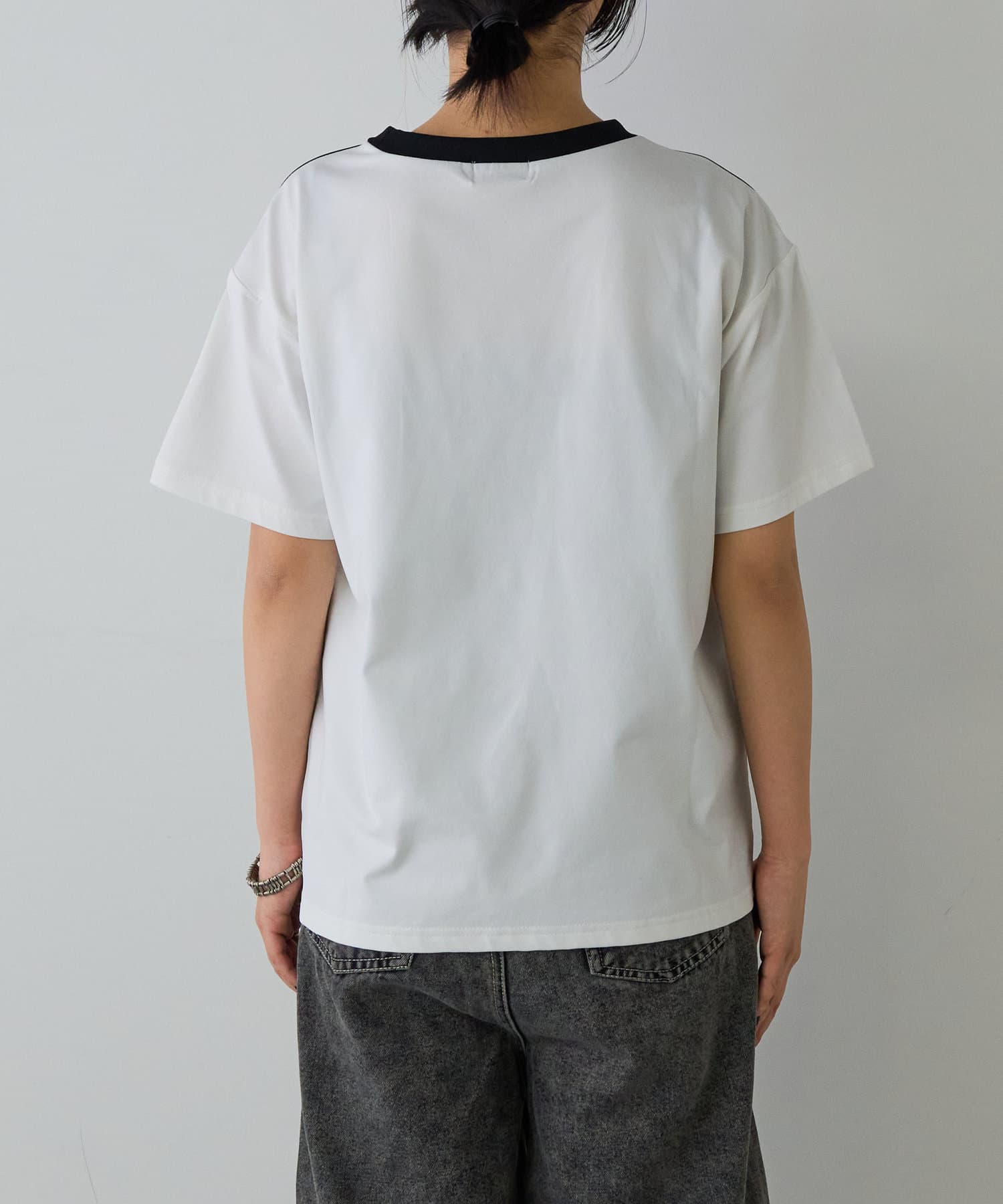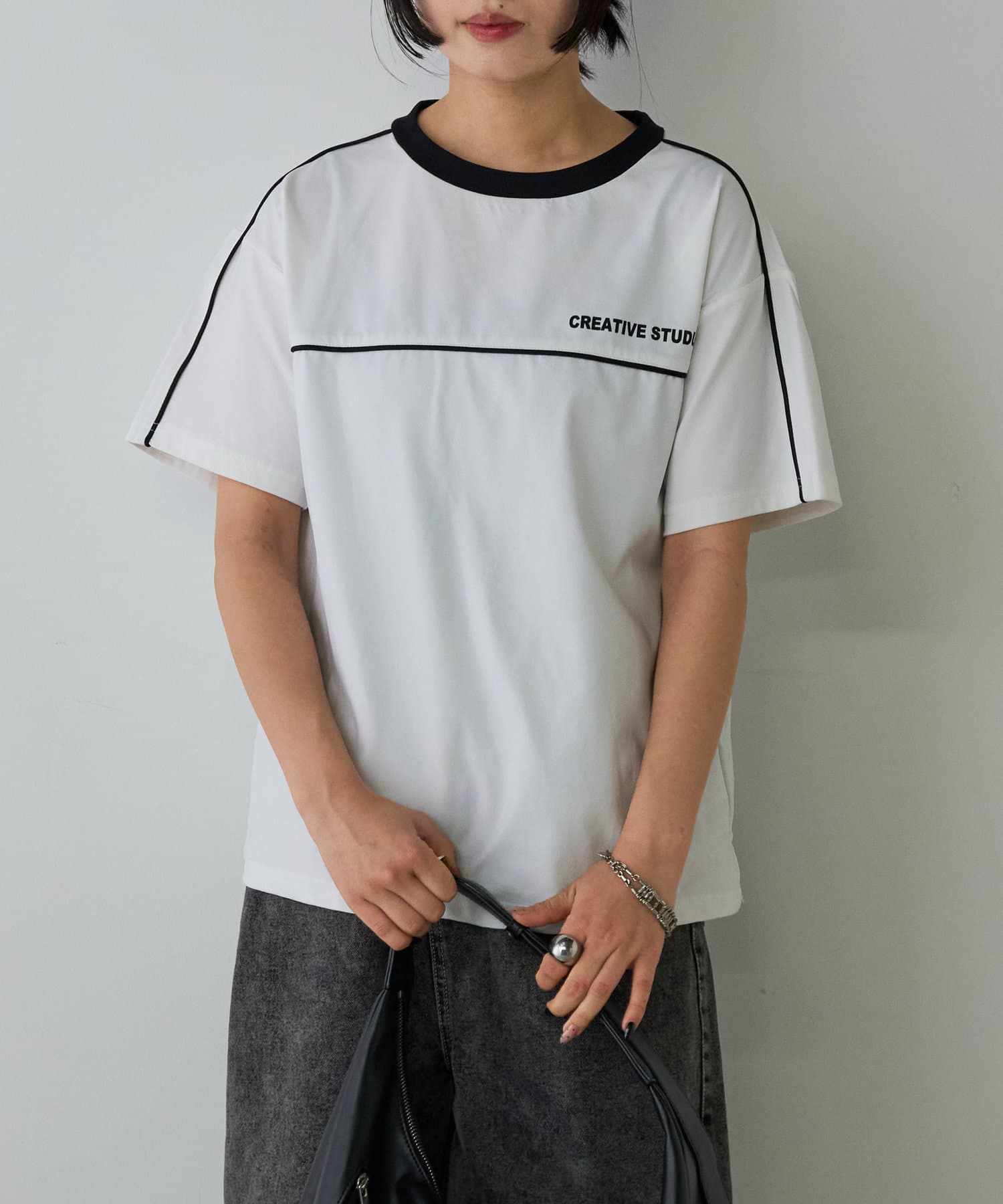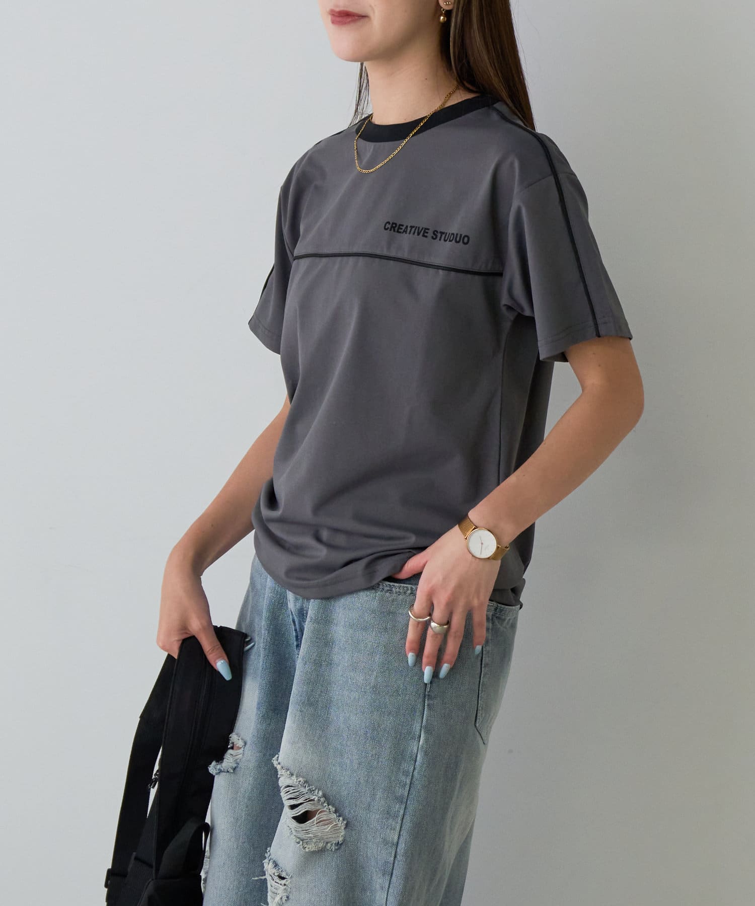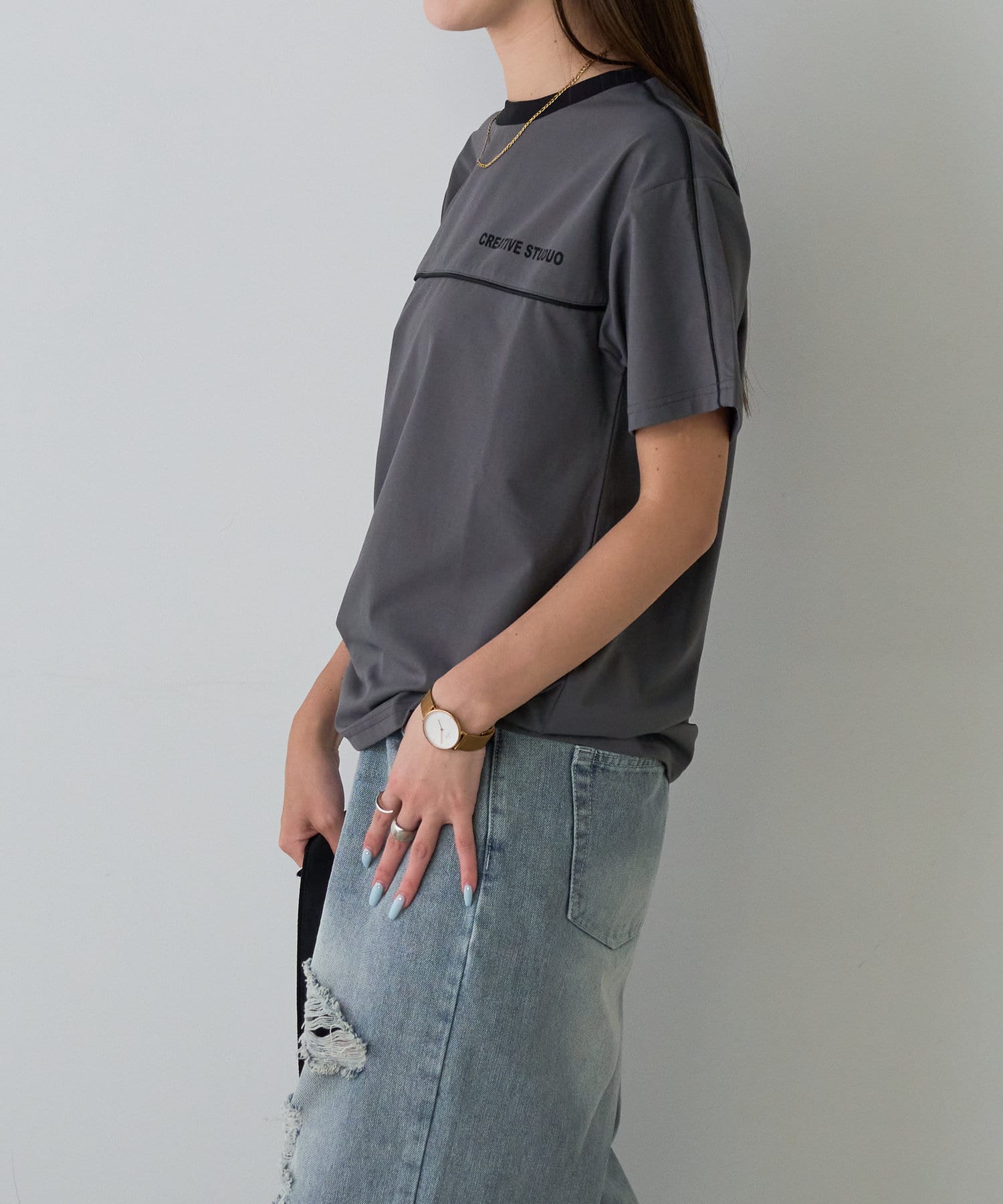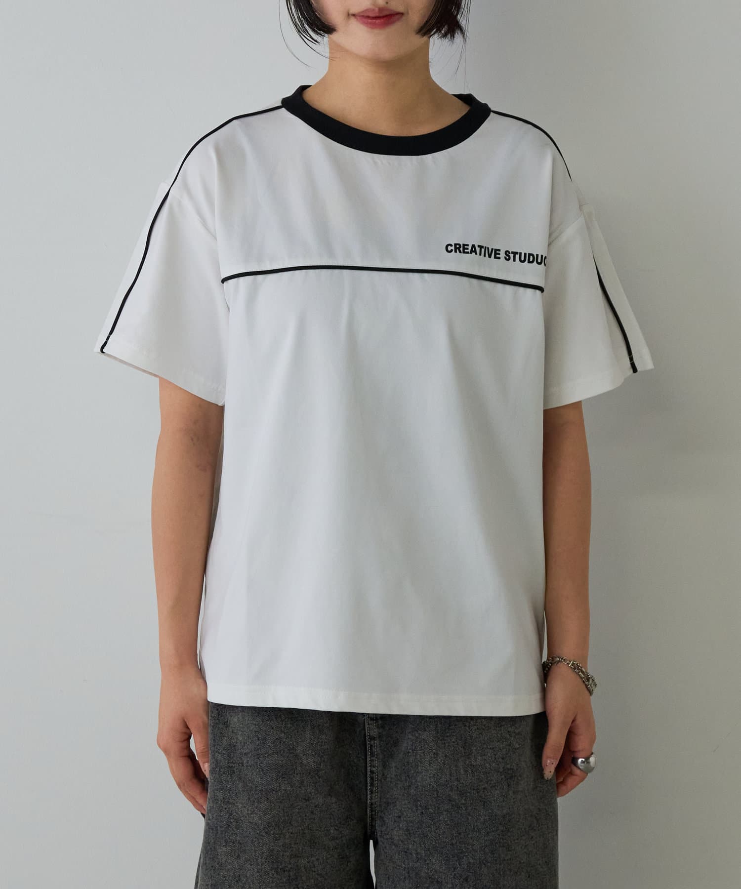 ・黒のパイピングが施されたTシャツにで荷を合わせてモード感のあるストリートスタイルに◎