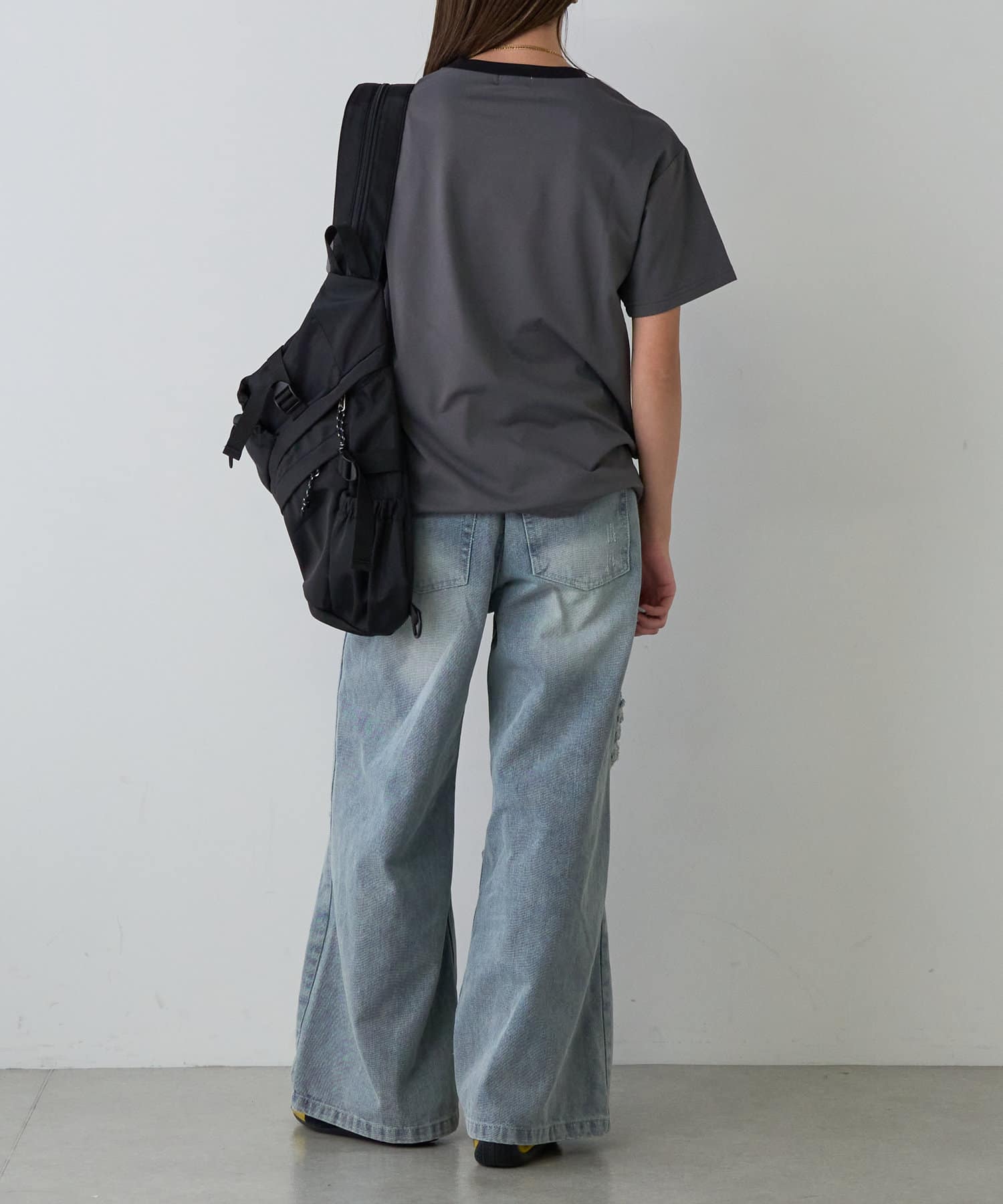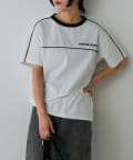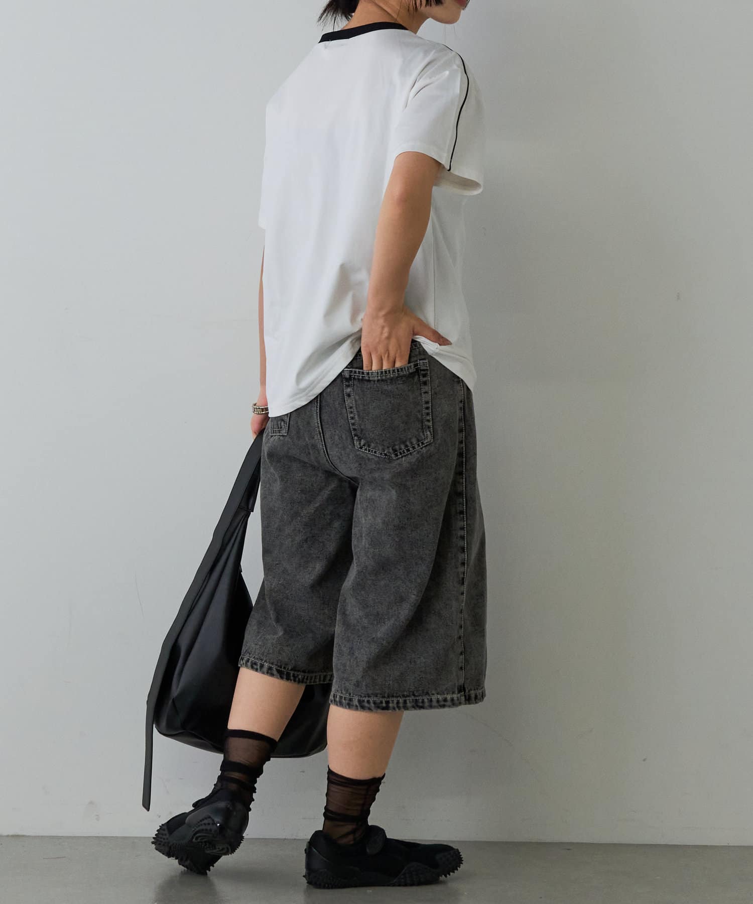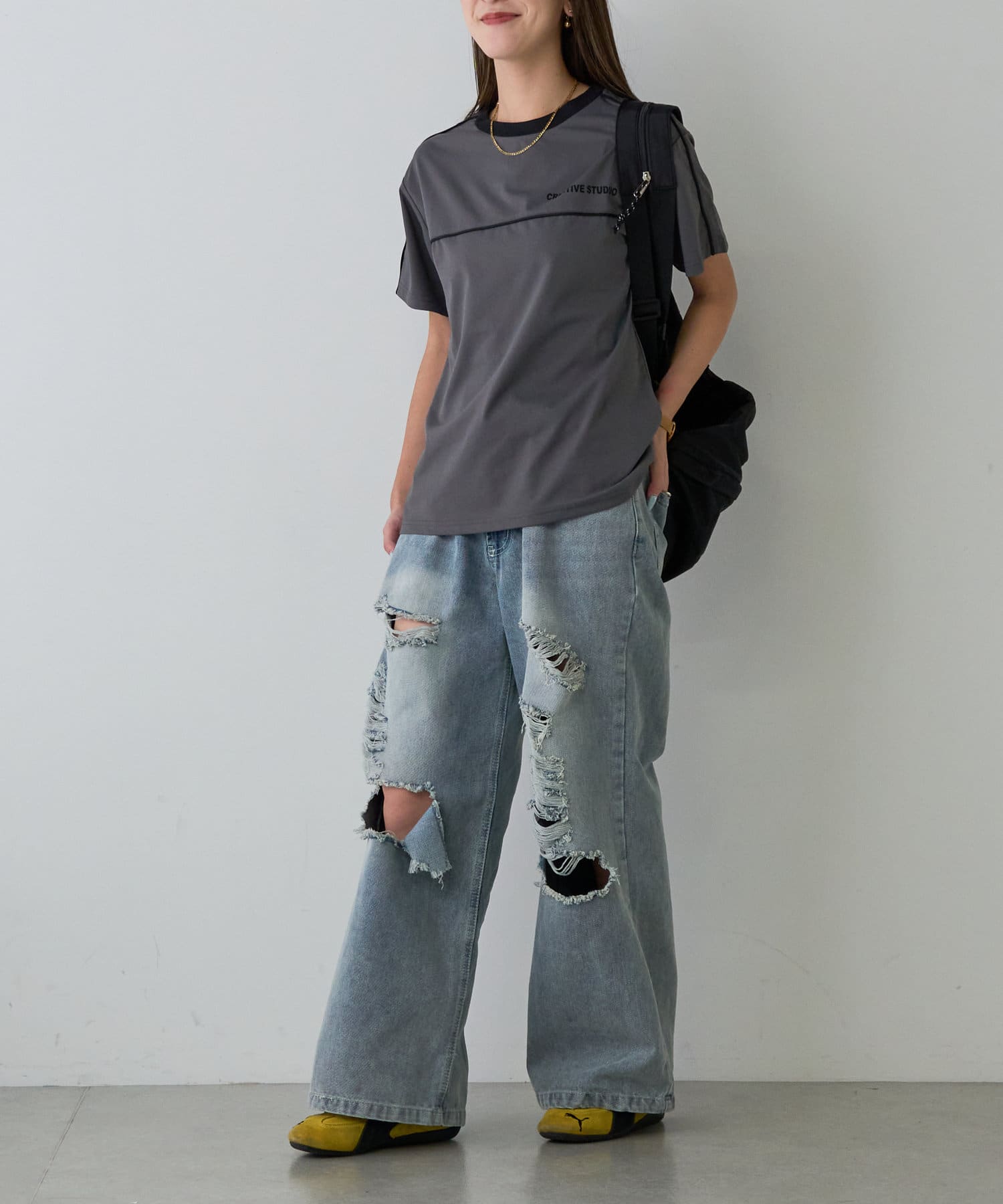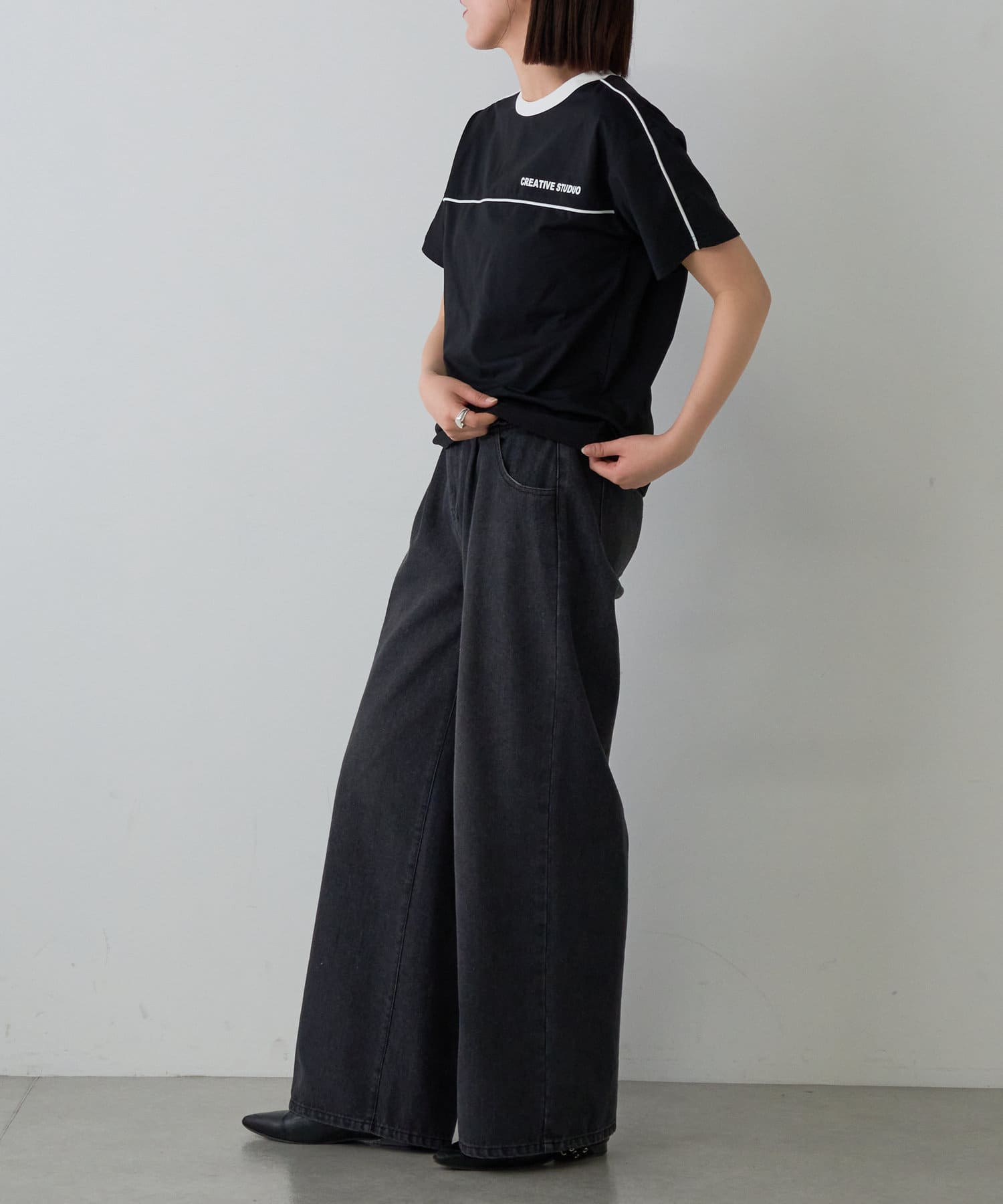 ・黒のパイピングが施されたTシャツにで荷を合わせてモード感のあるストリートスタイルに◎