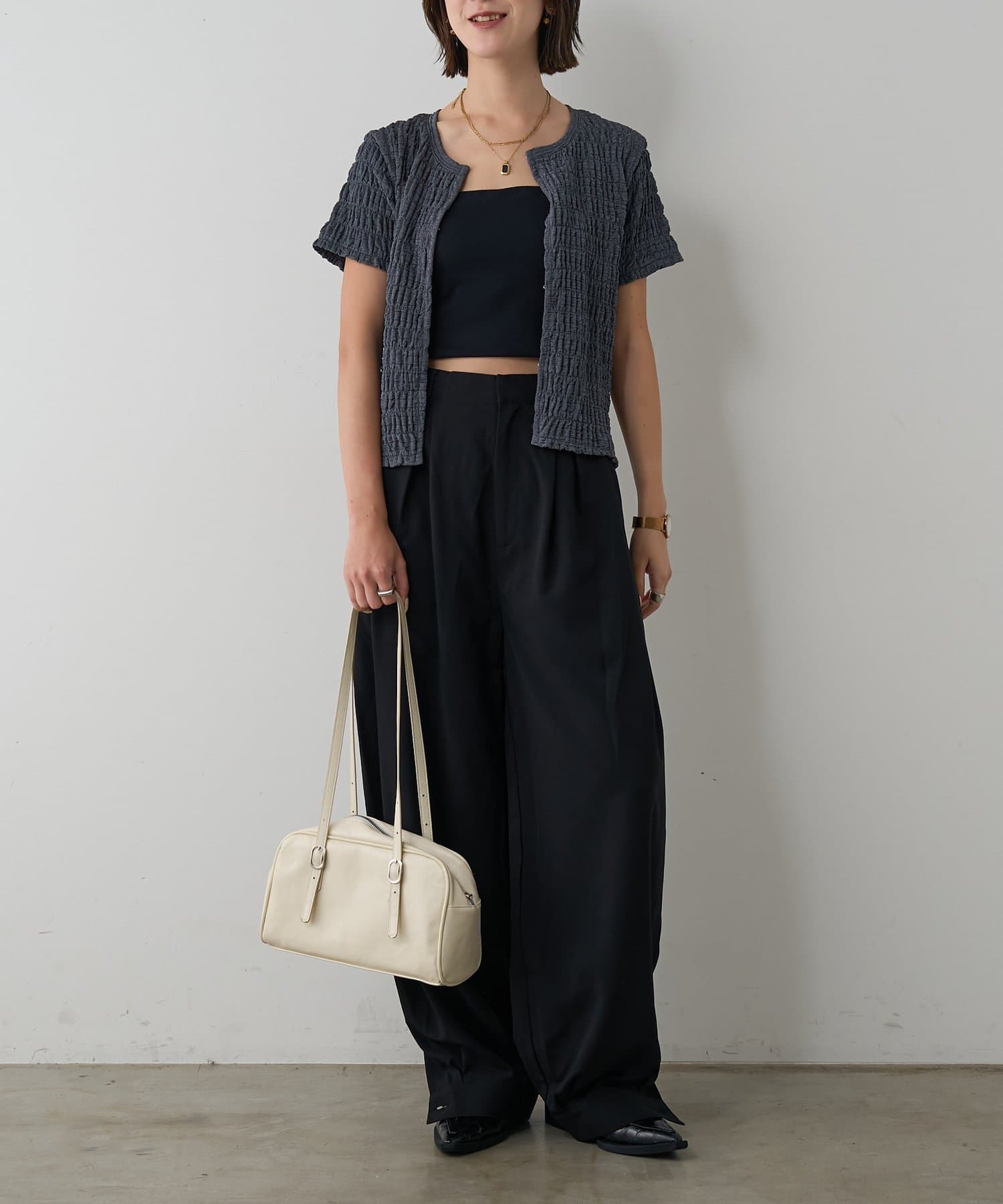 ・ホックを開けてインナーを見せて抜け感を出して着用するのがおすすめ。