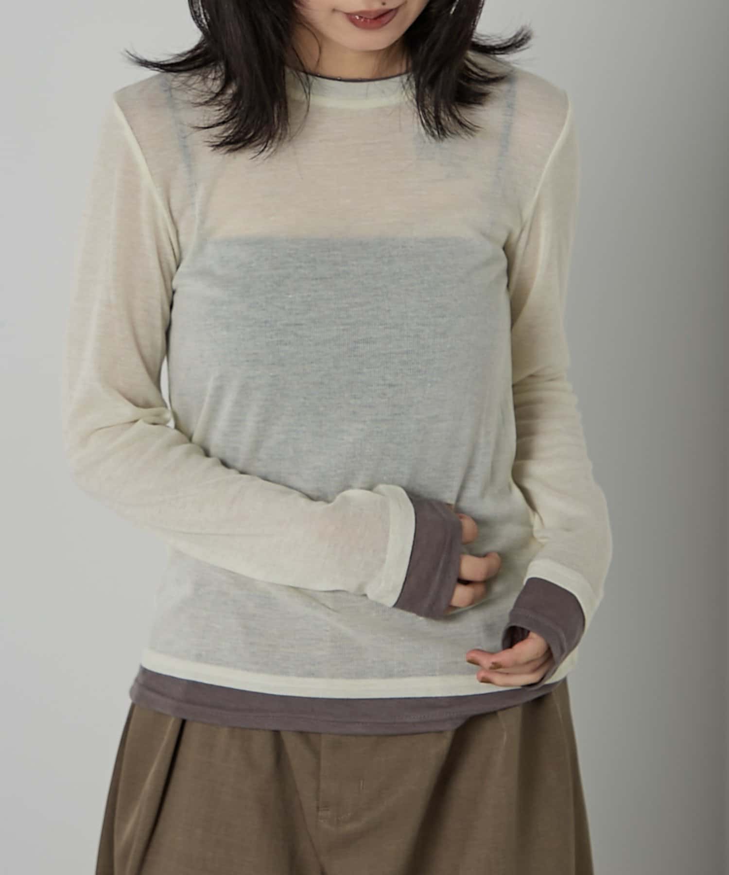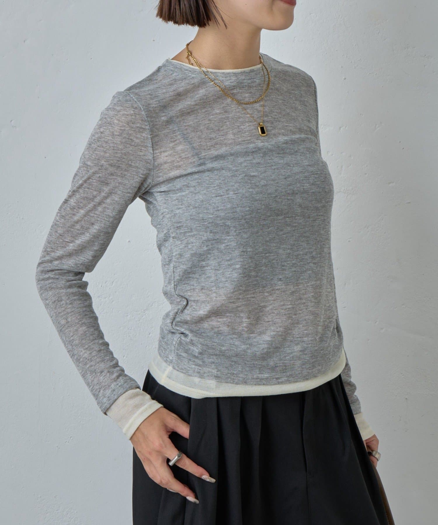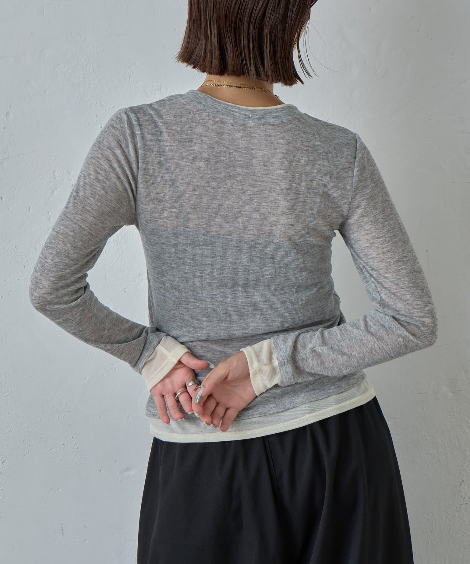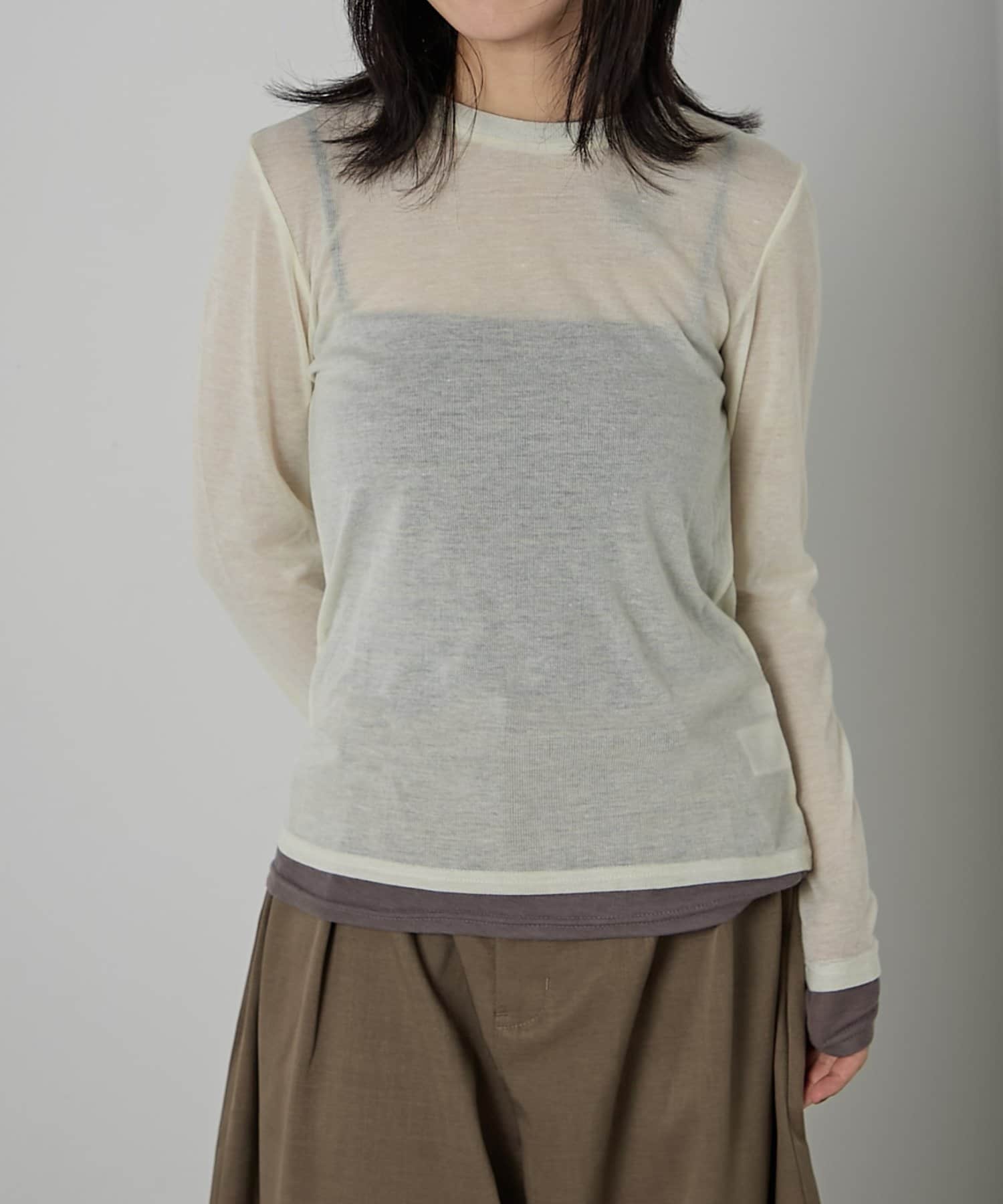 AWらしい程よいシアー感が抜け感のあるスタイリングを演出する、配色重ね着風シアーロンT
