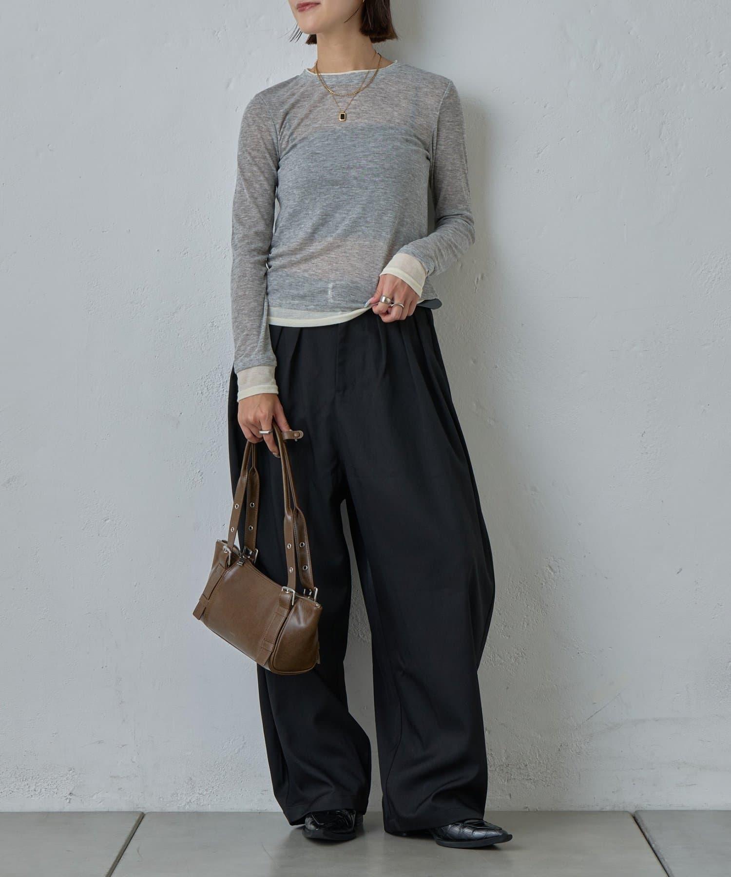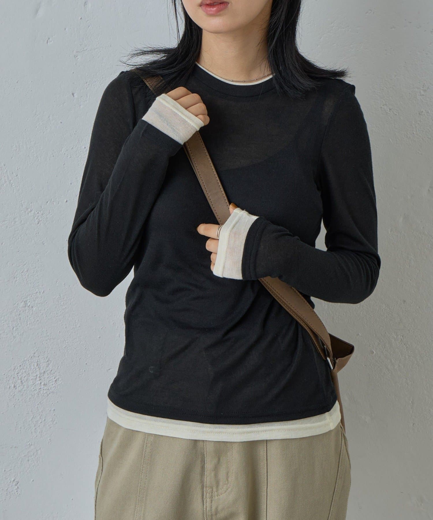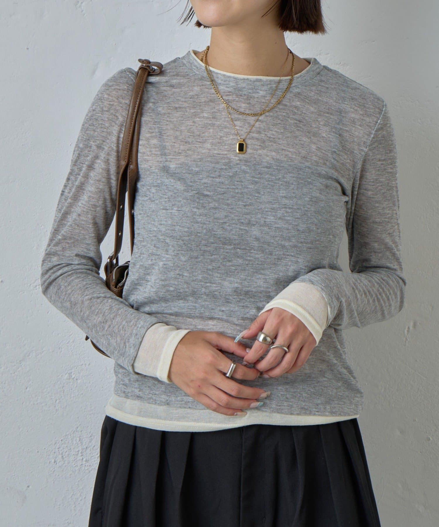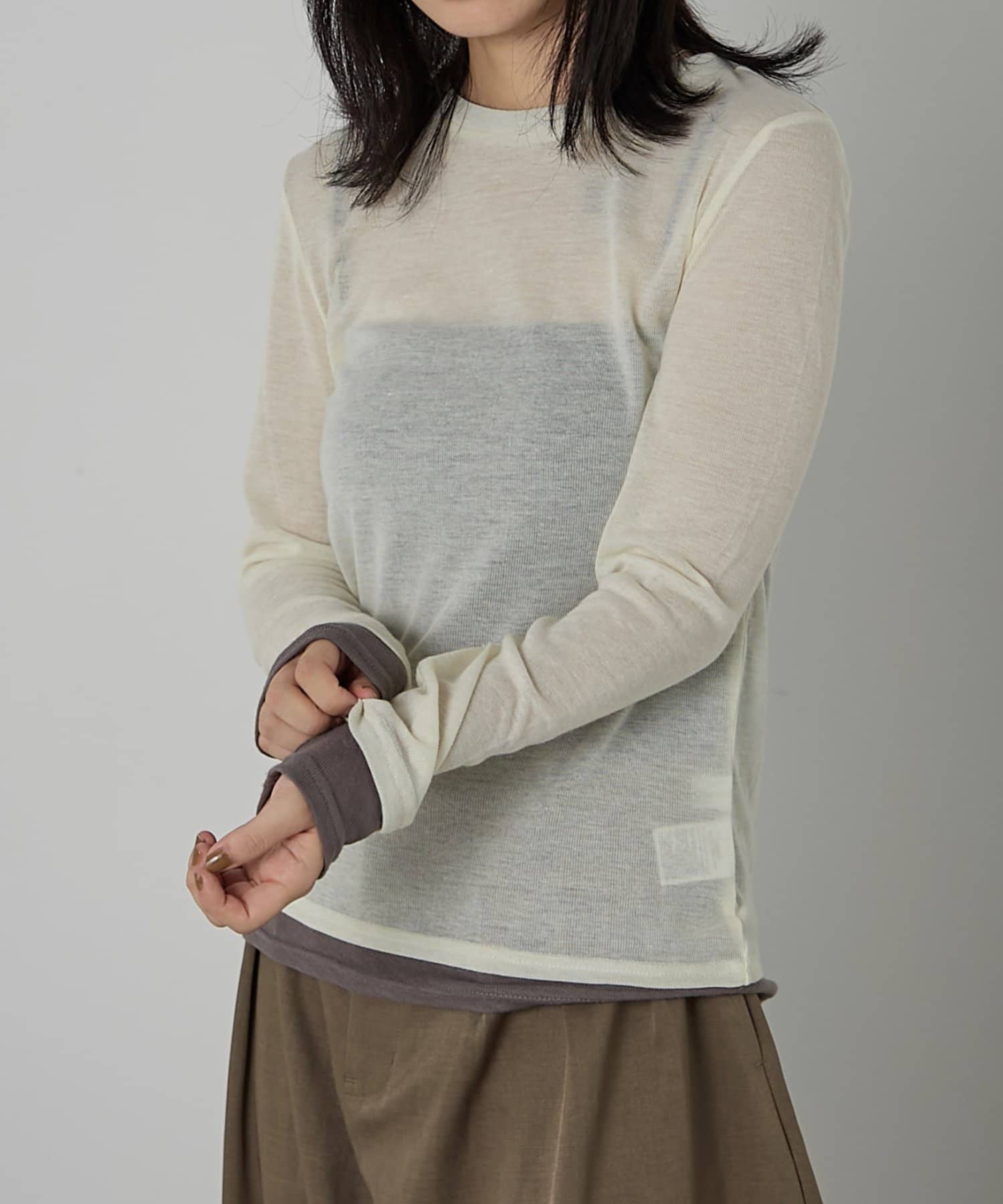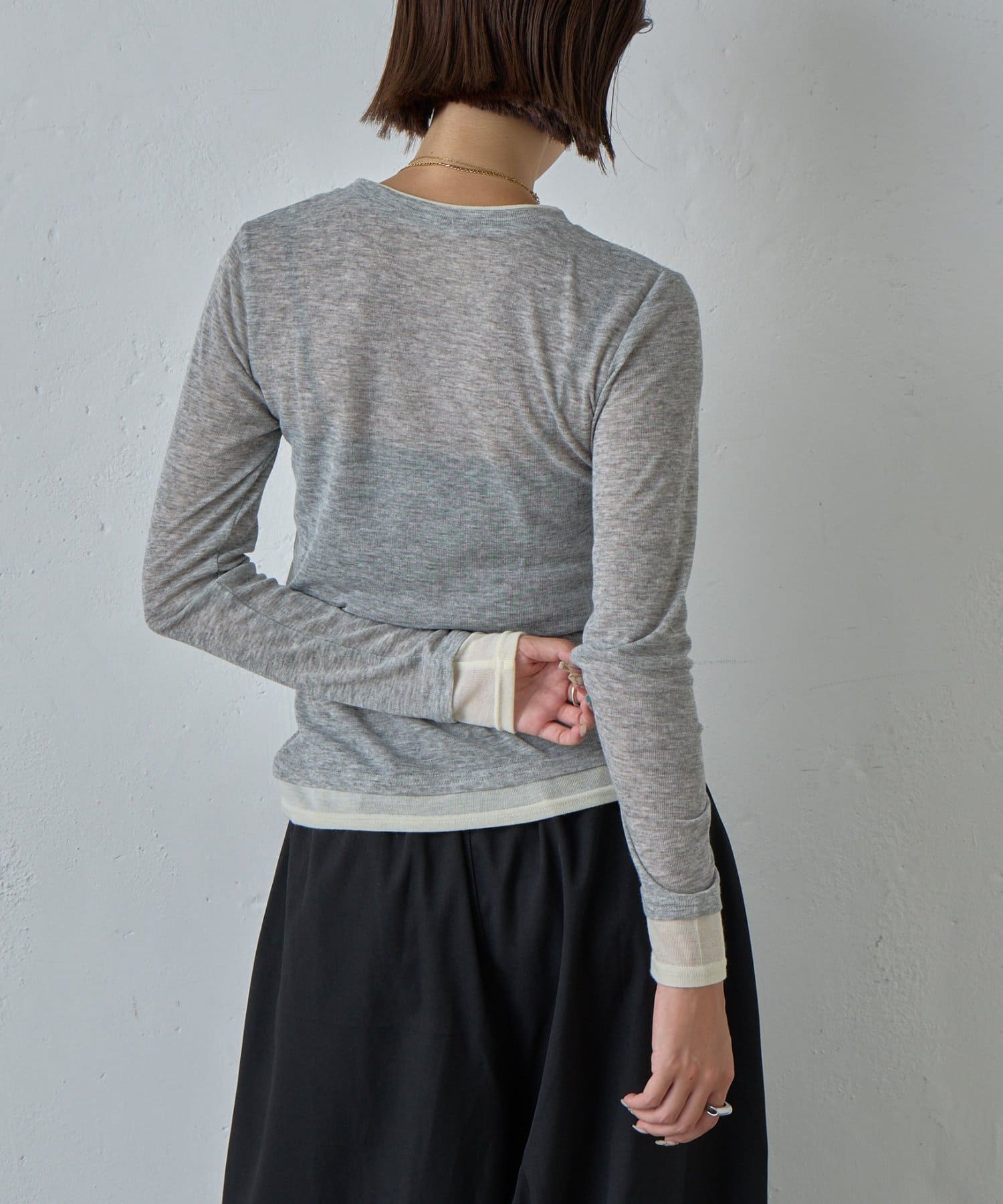 AWらしい程よいシアー感が抜け感のあるスタイリングを演出する、配色重ね着風シアーロンT