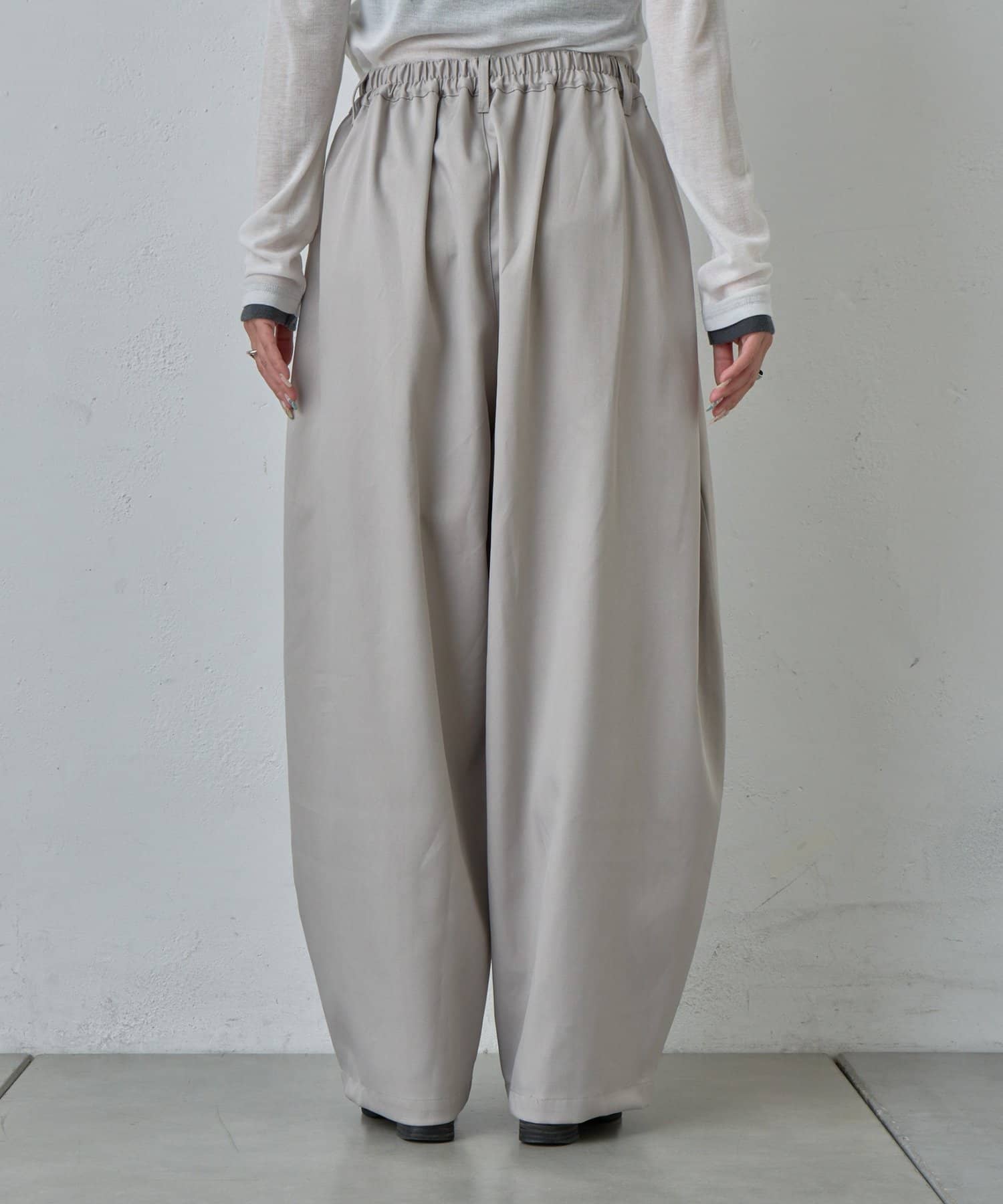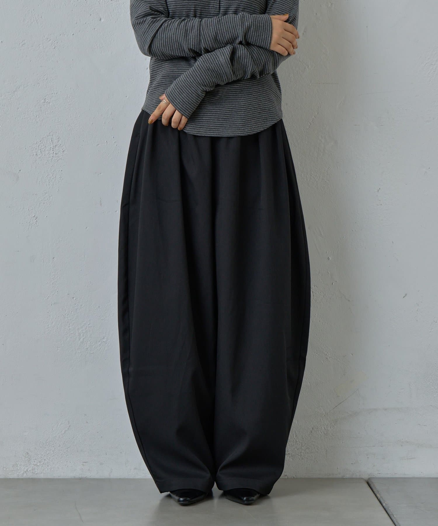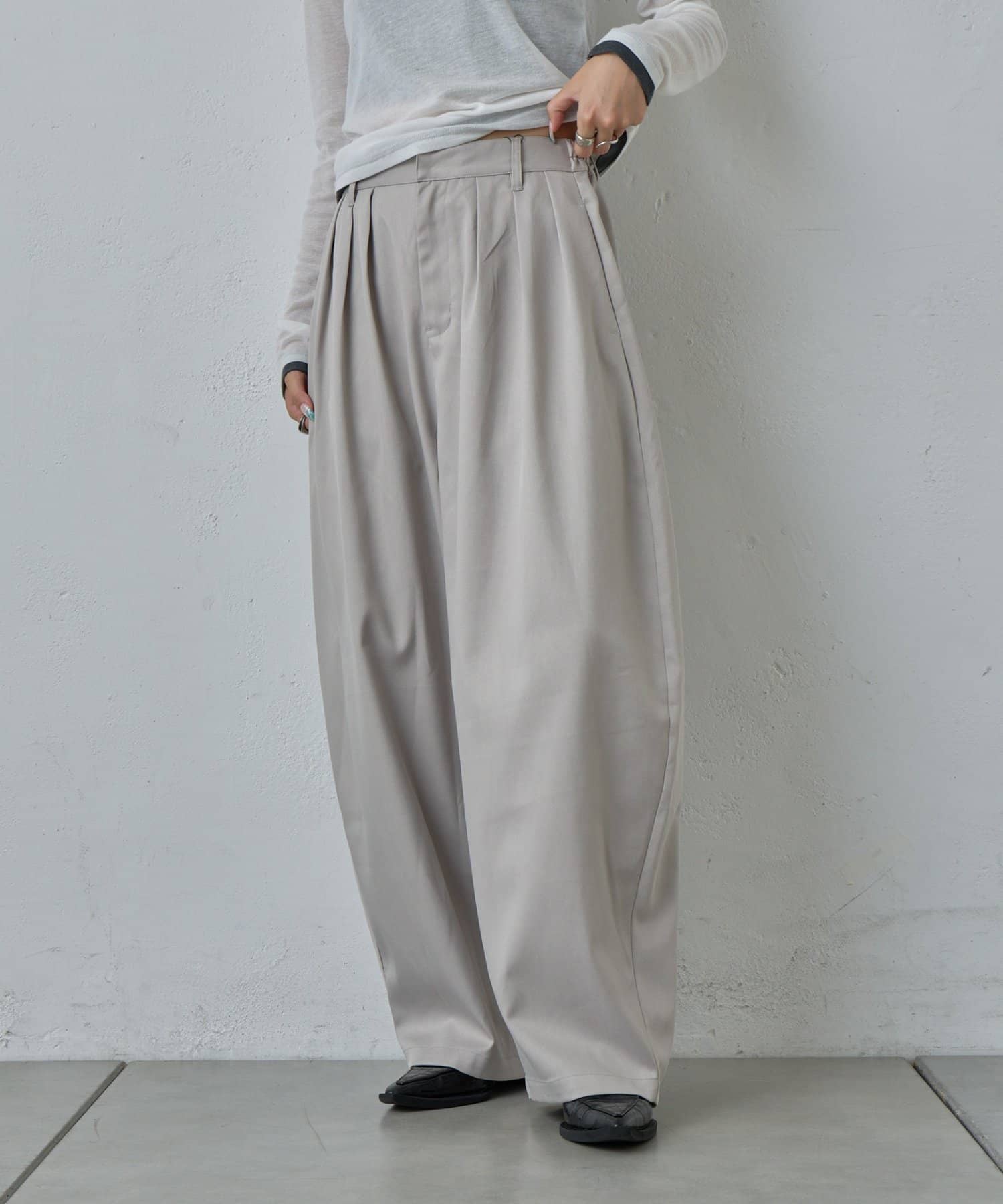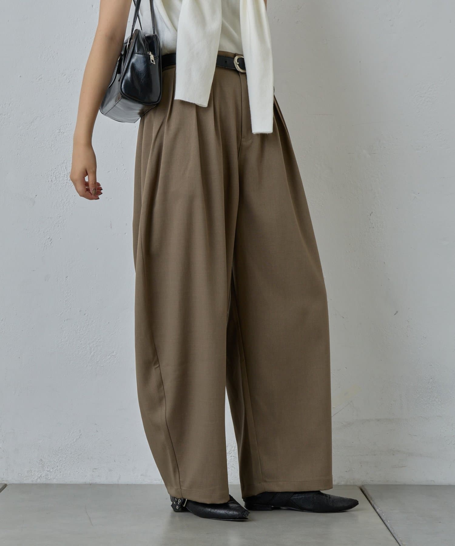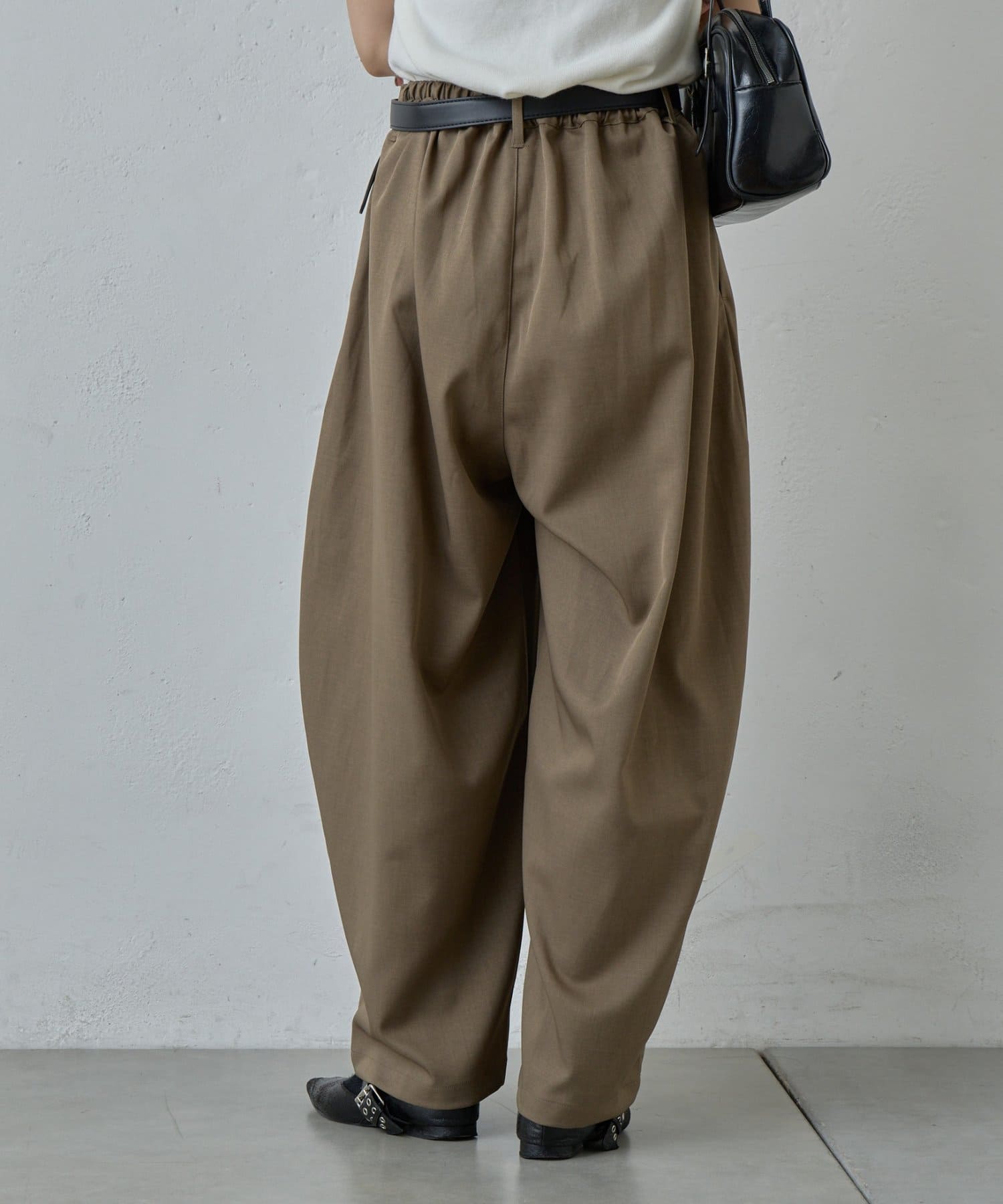 抜け感を引き立たせる丸みのあるタックコクーンパンツ