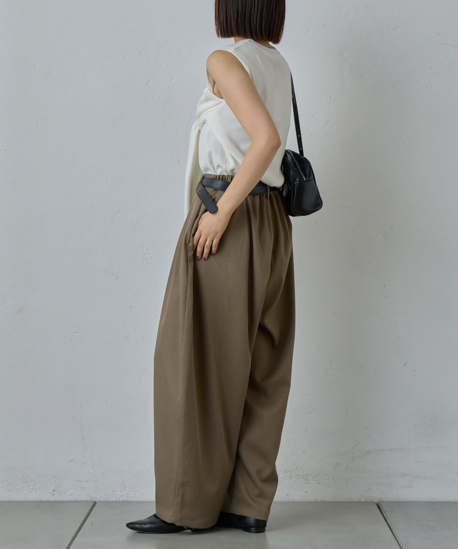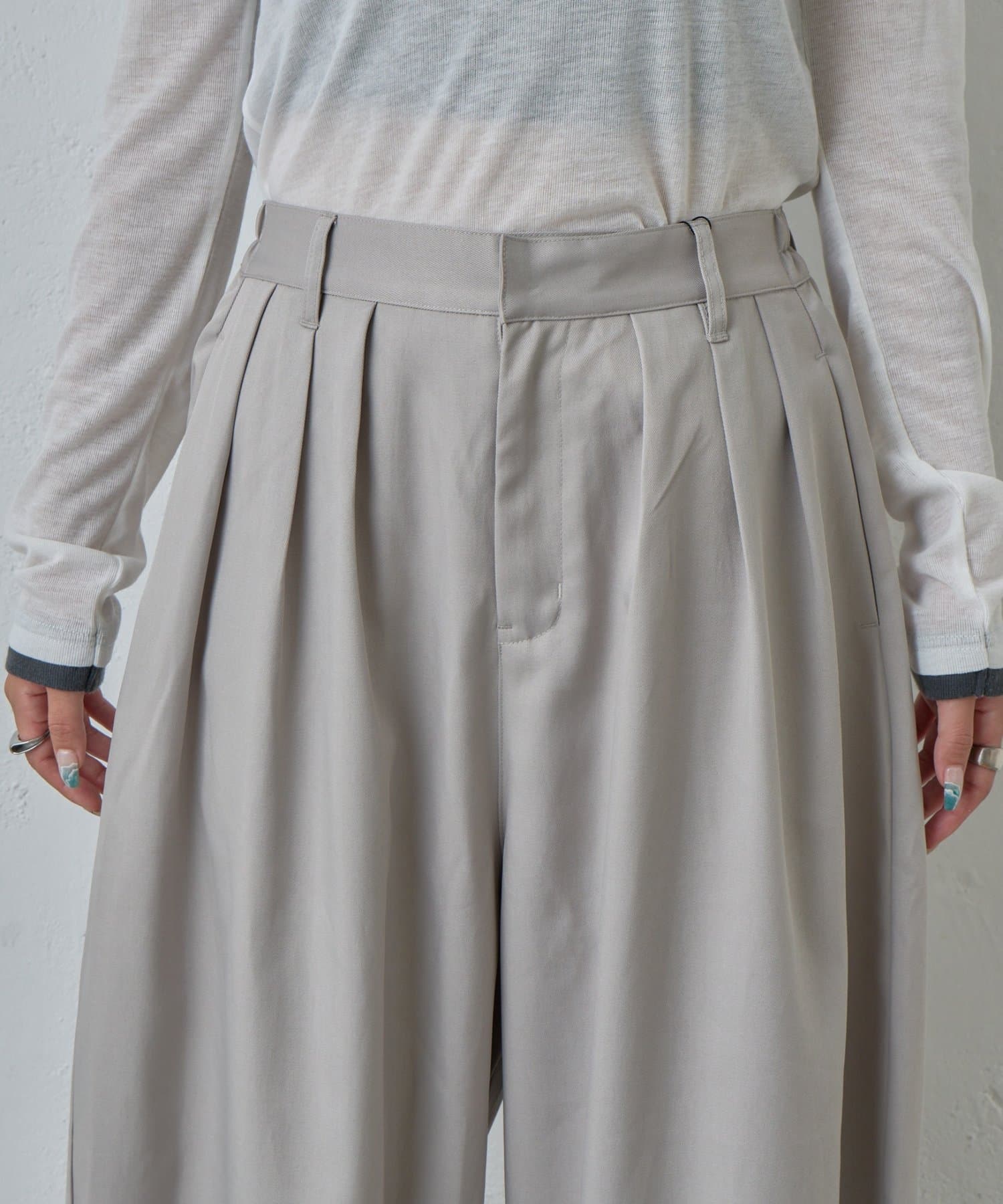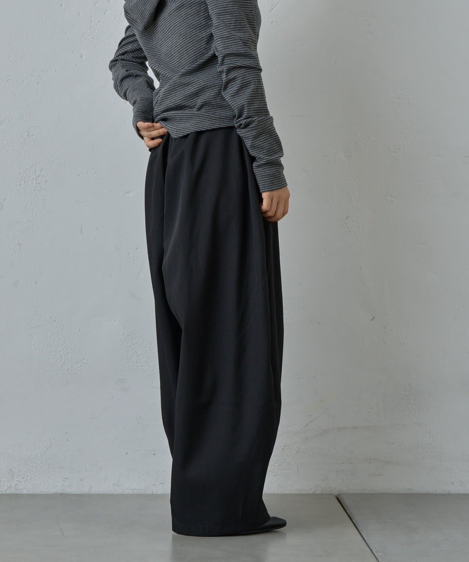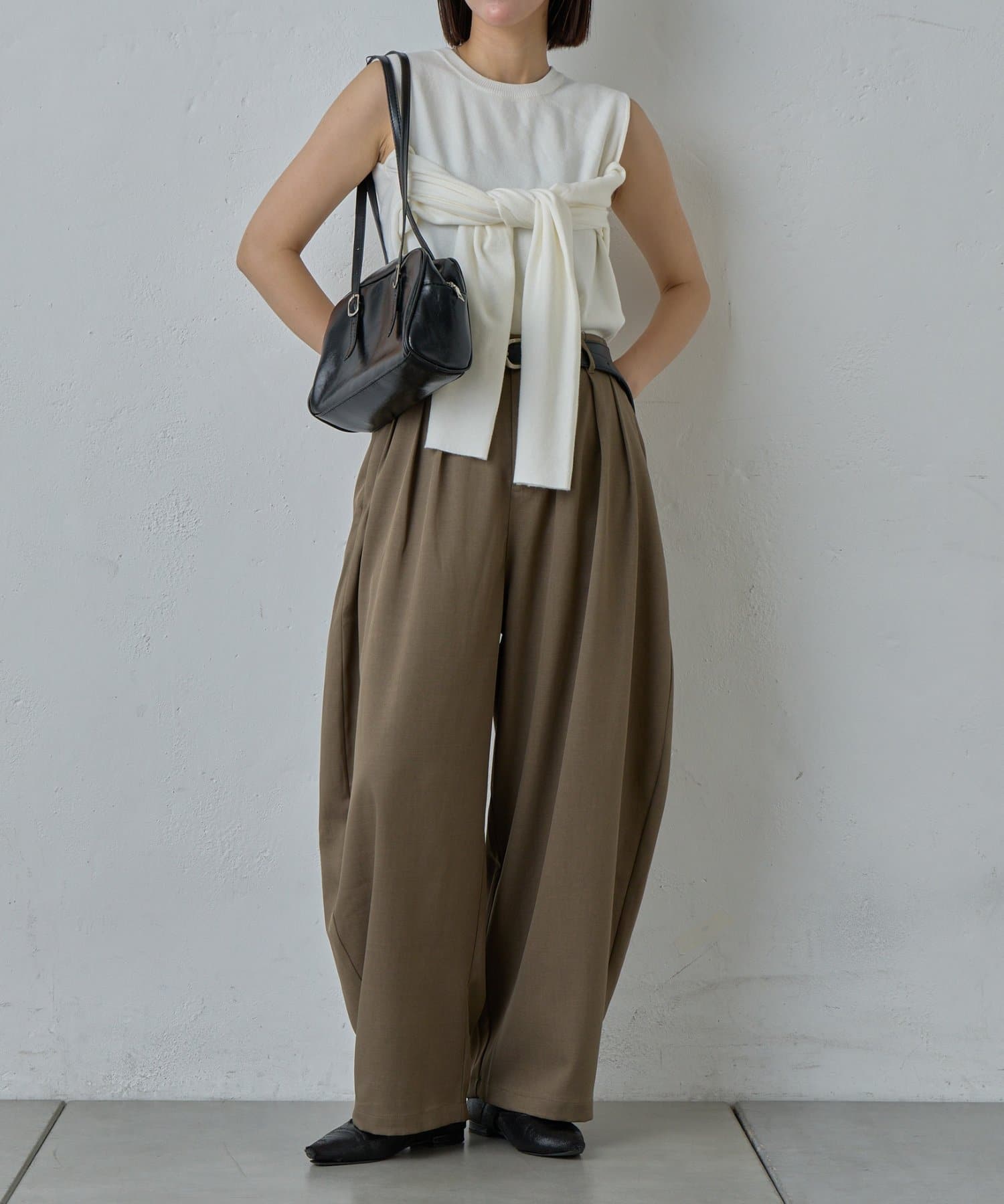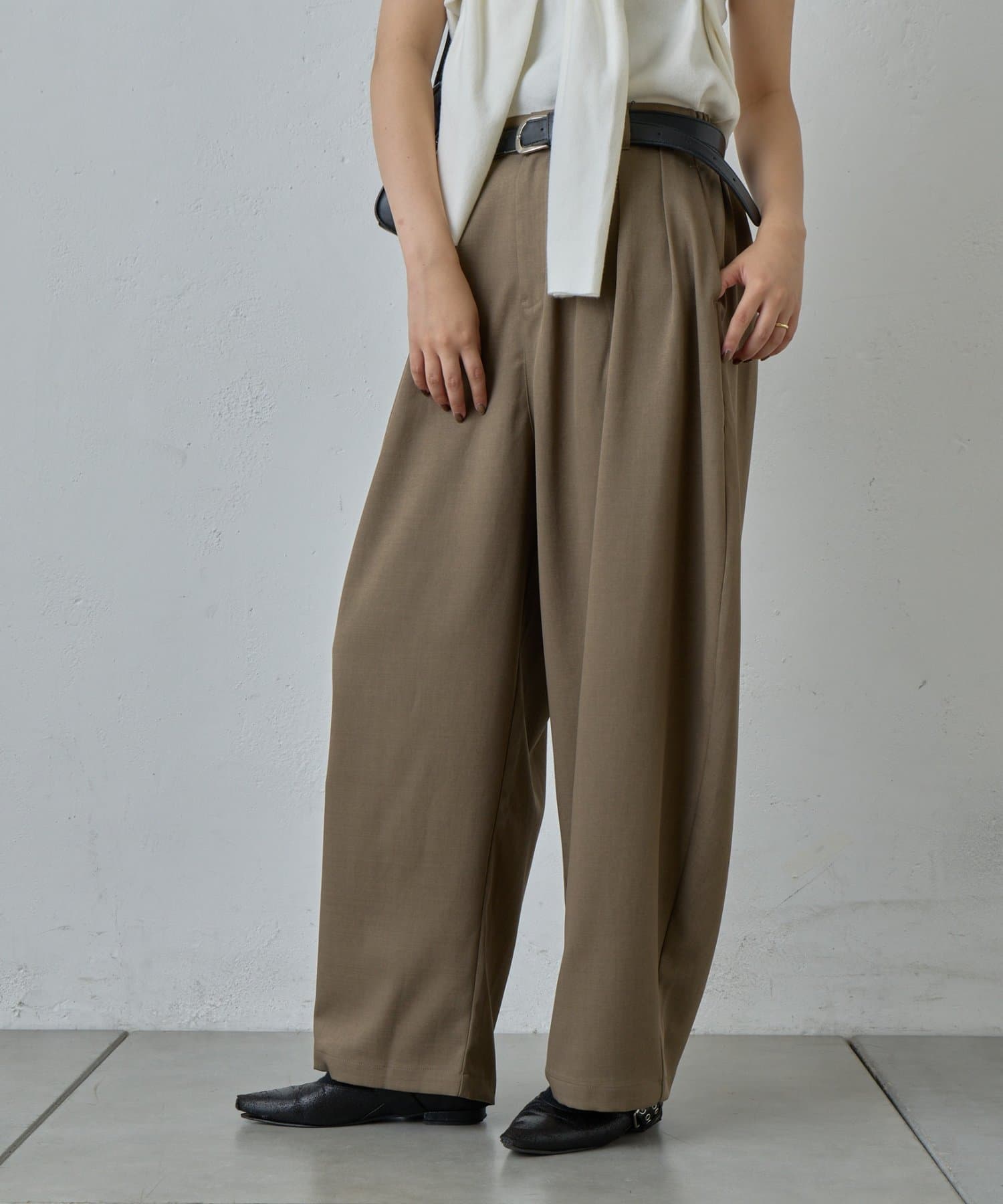 抜け感を引き立たせる丸みのあるタックコクーンパンツ