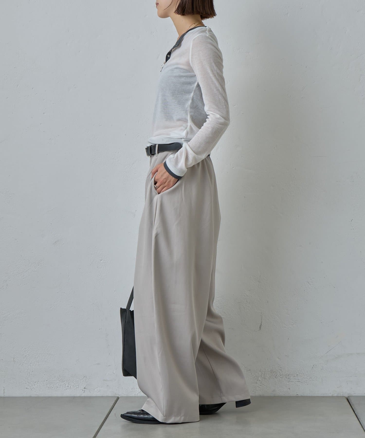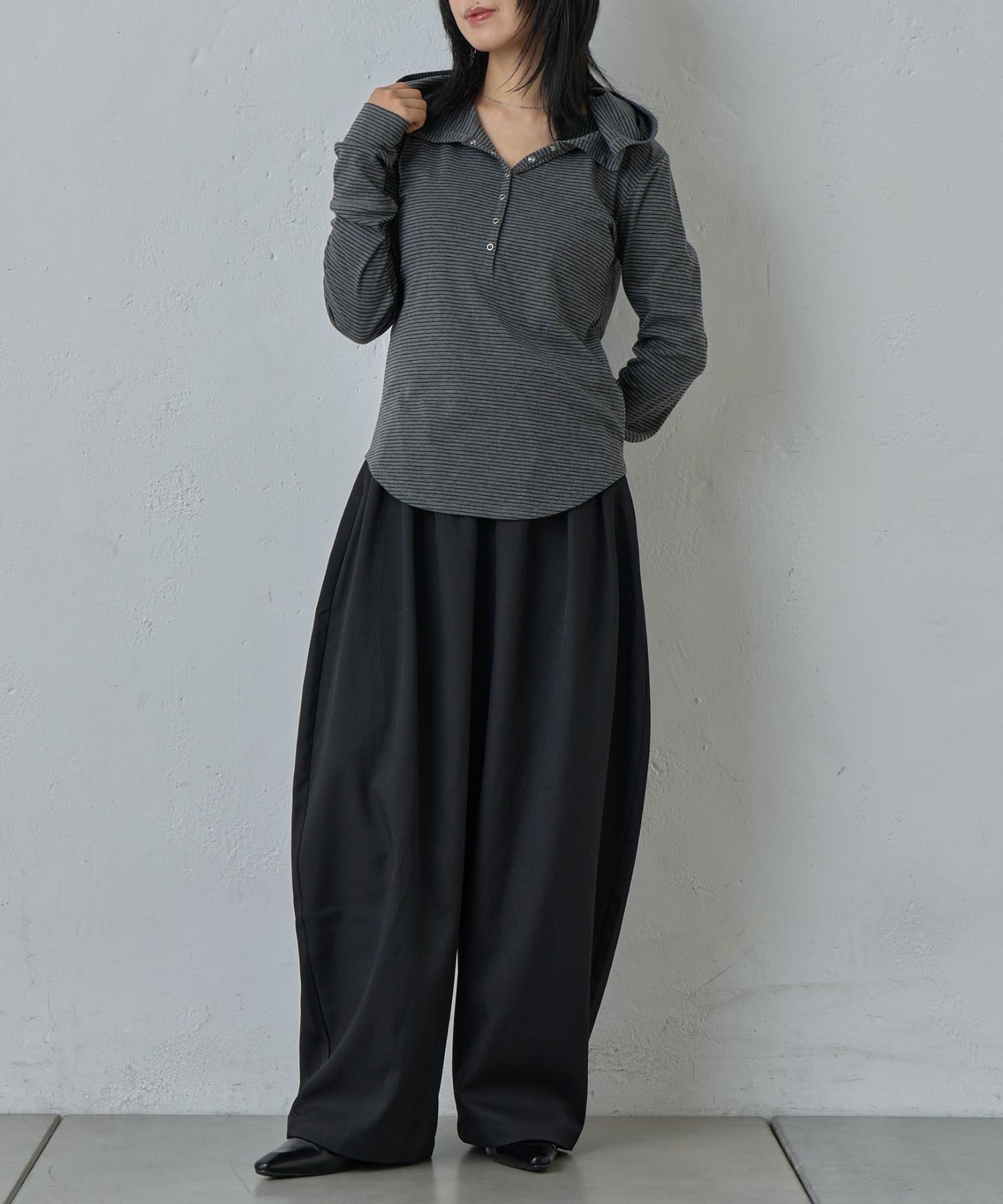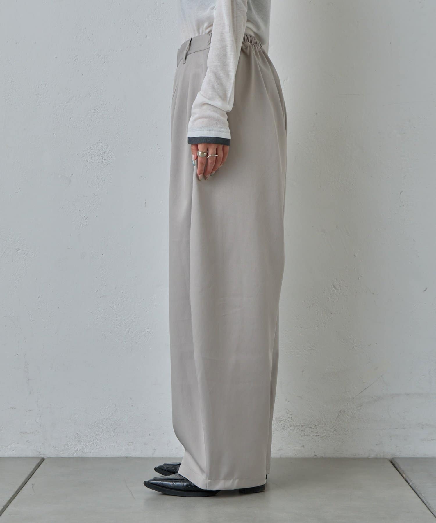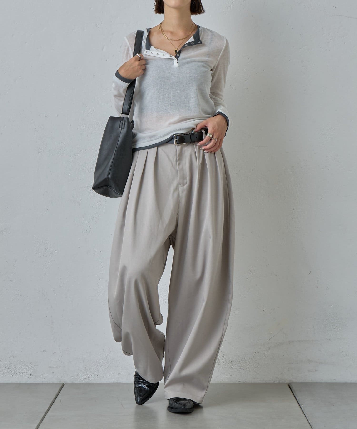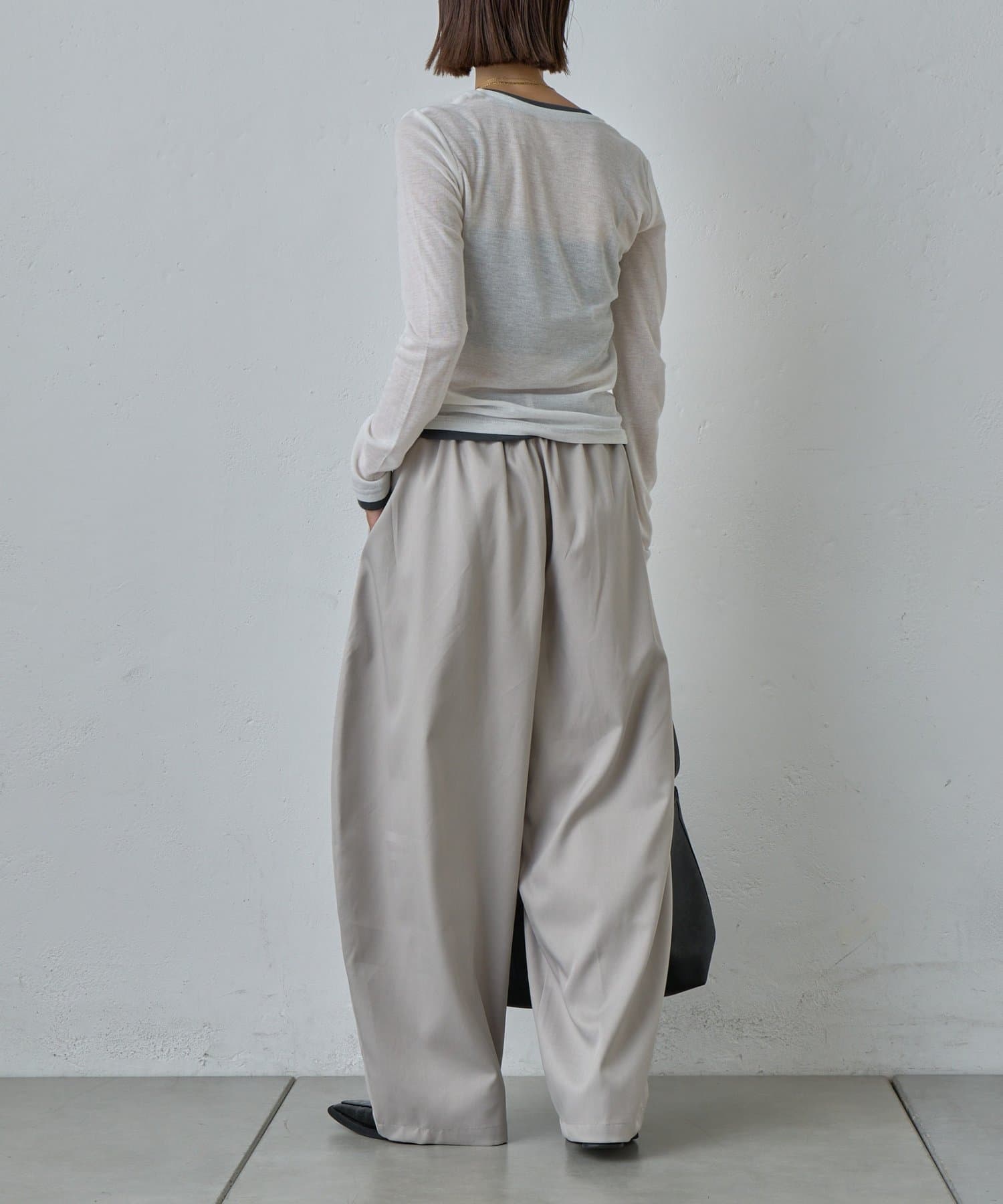 抜け感を引き立たせる丸みのあるタックコクーンパンツ