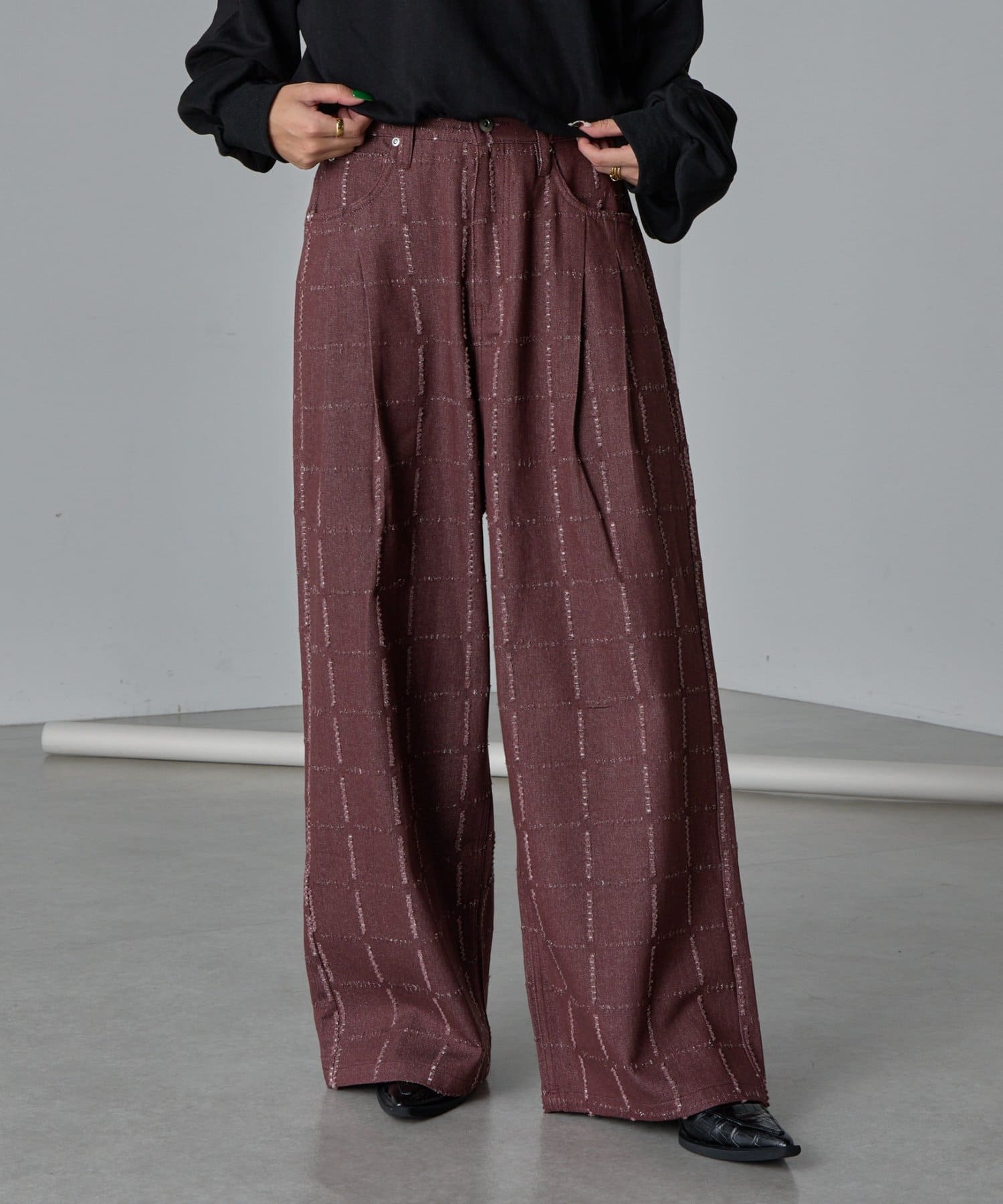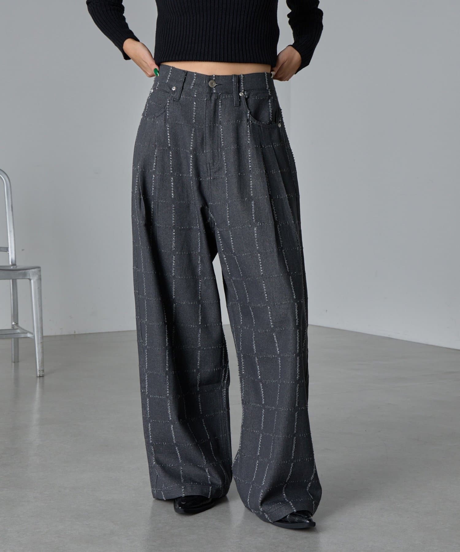 ・ダメージ加工を施したワイドシルエットパンツ