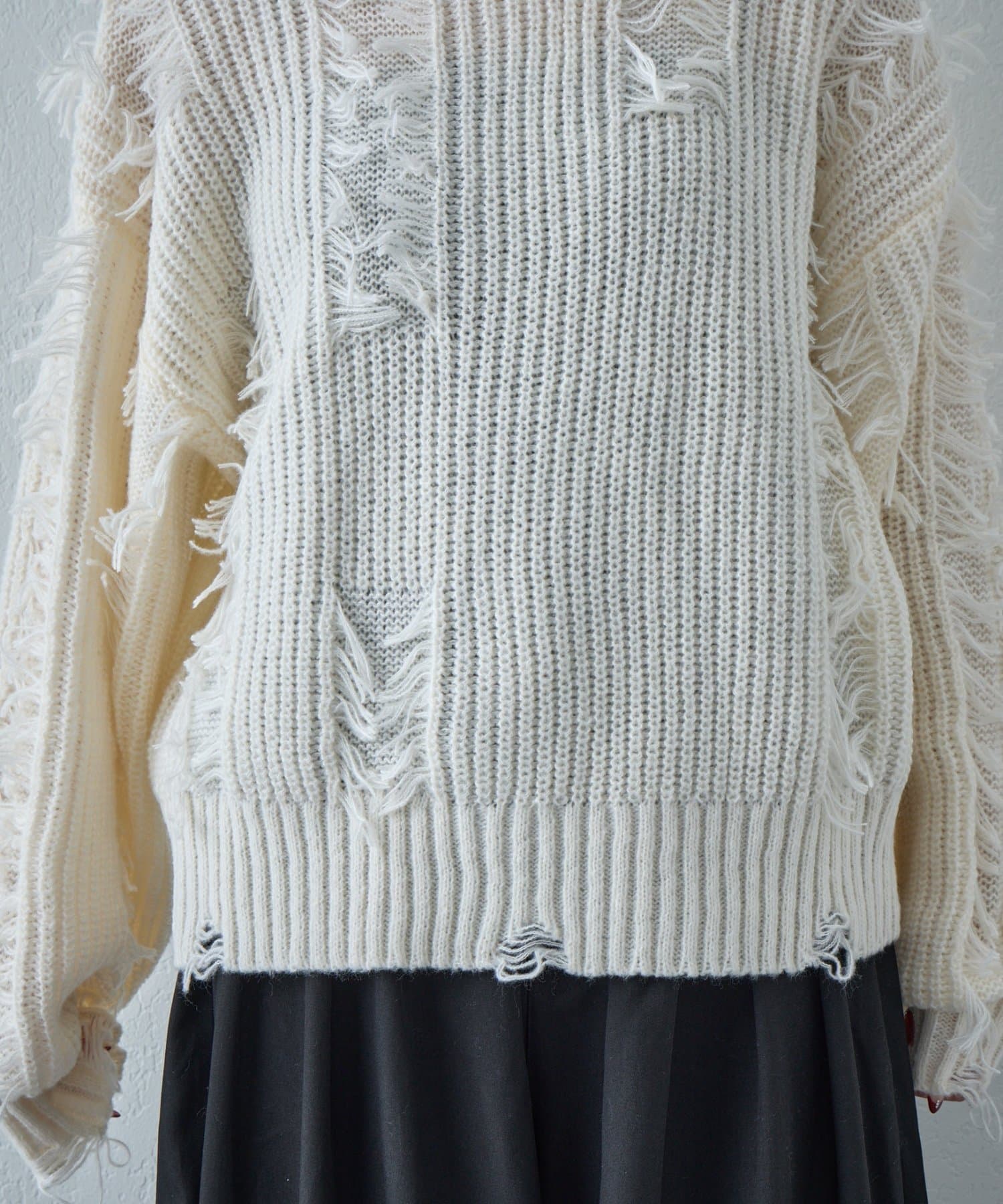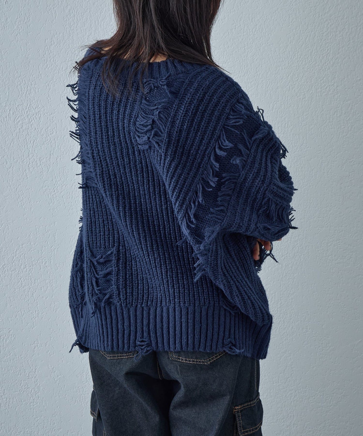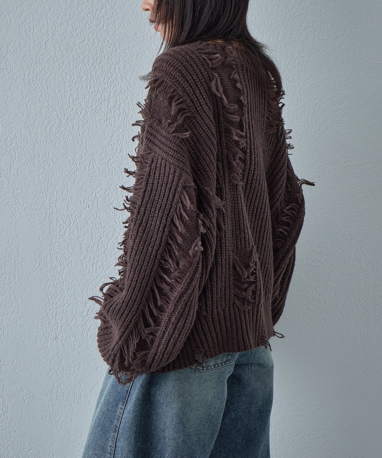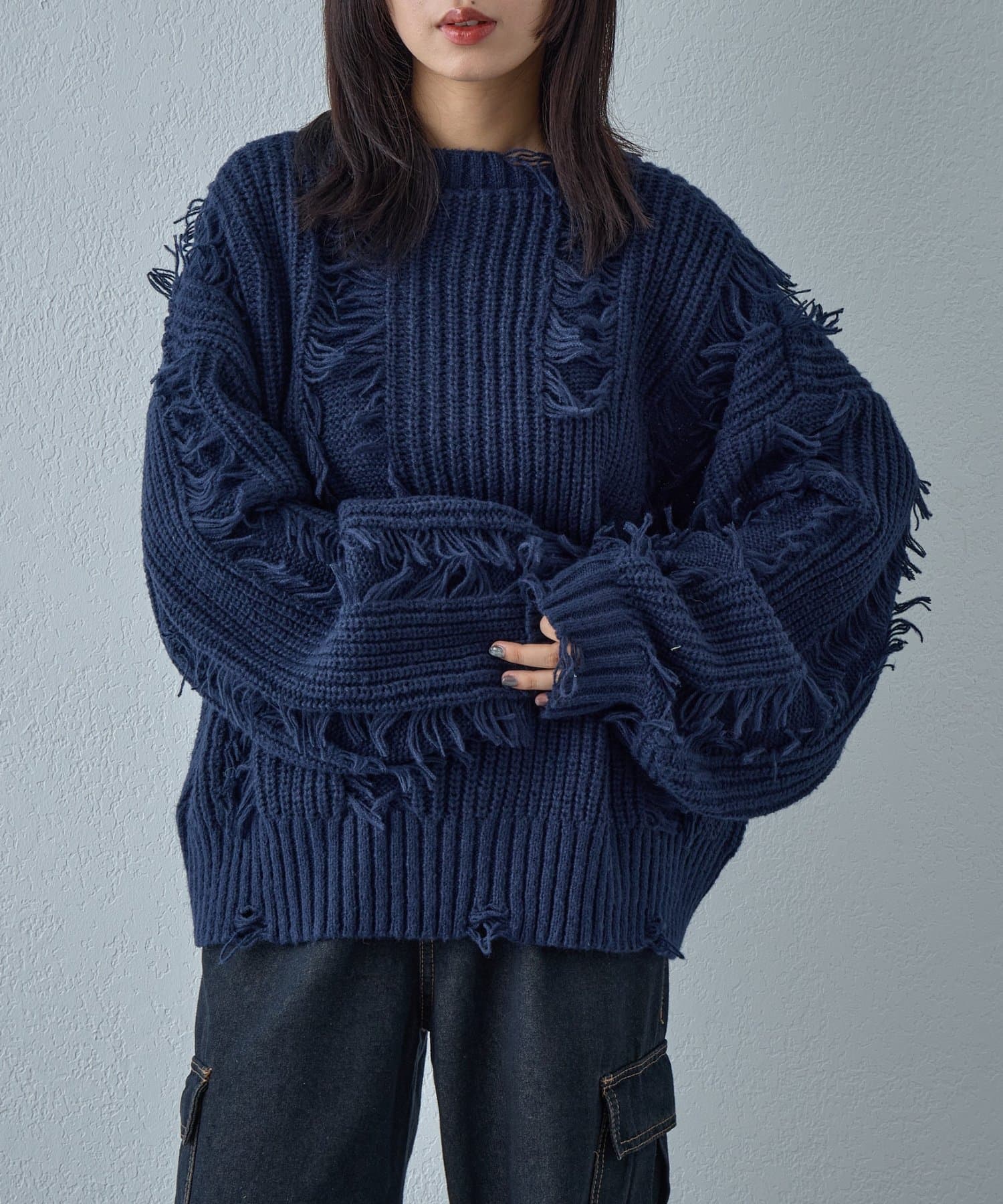 -goocy-(グーシー) モヘアタッチダメージ風フリンジプルオーバー