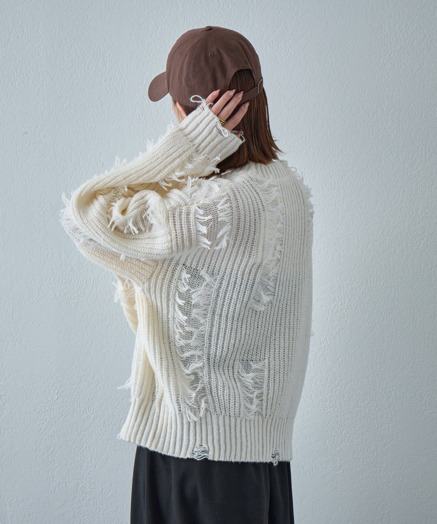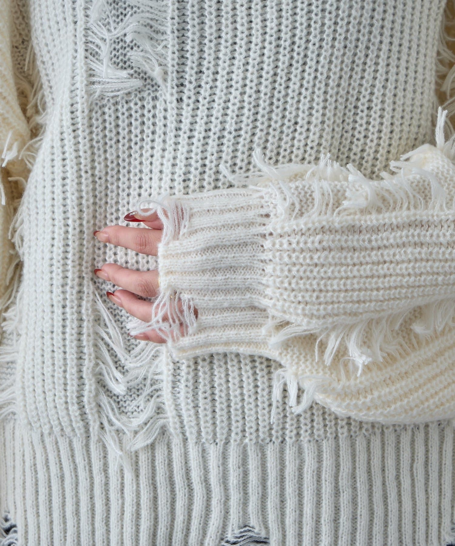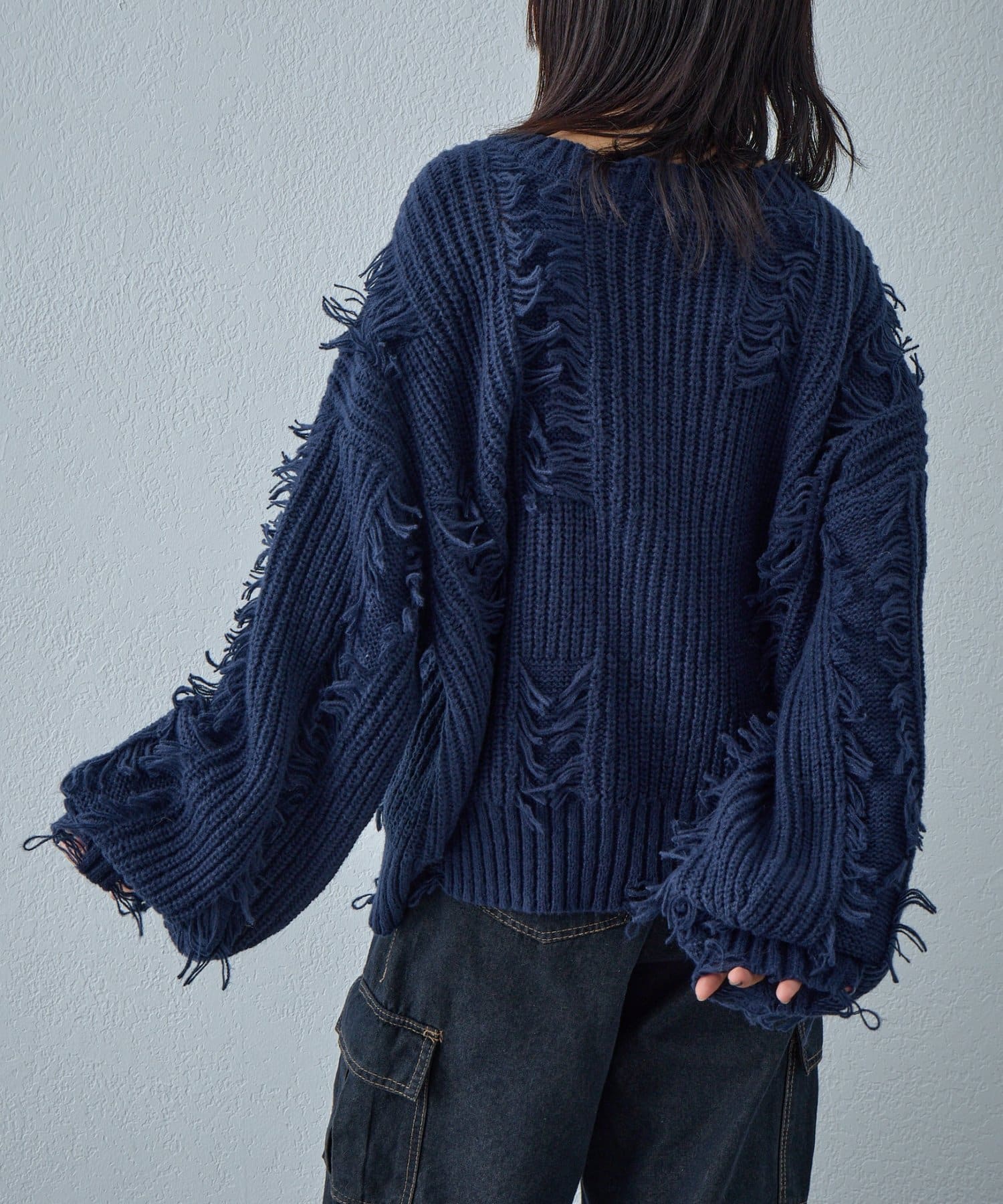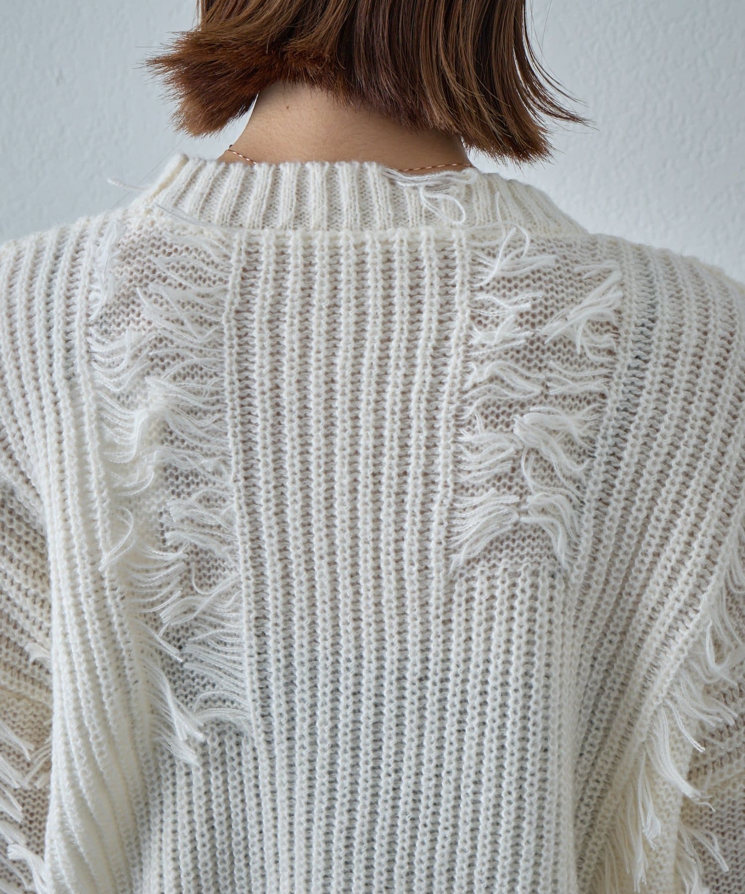 -goocy-(グーシー) モヘアタッチダメージ風フリンジプルオーバー