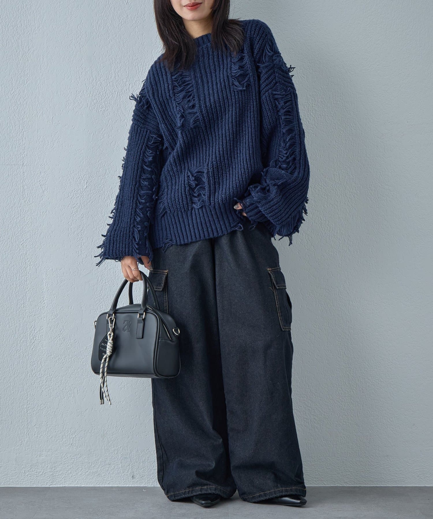 ・ダメージ風加工とフリンジデザインが、抜け感のあるこなれた印象に◎