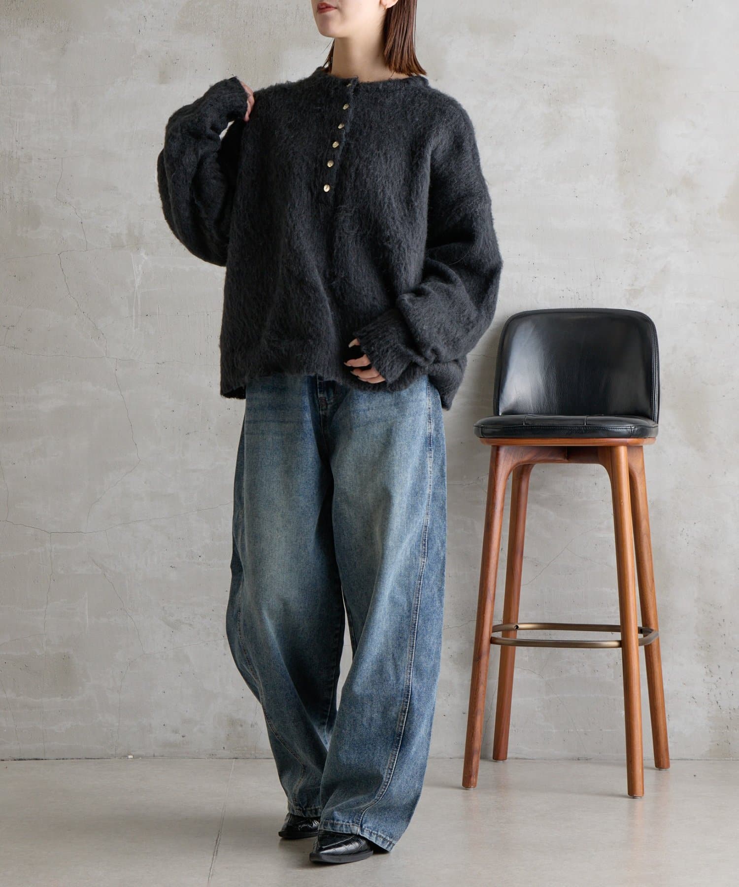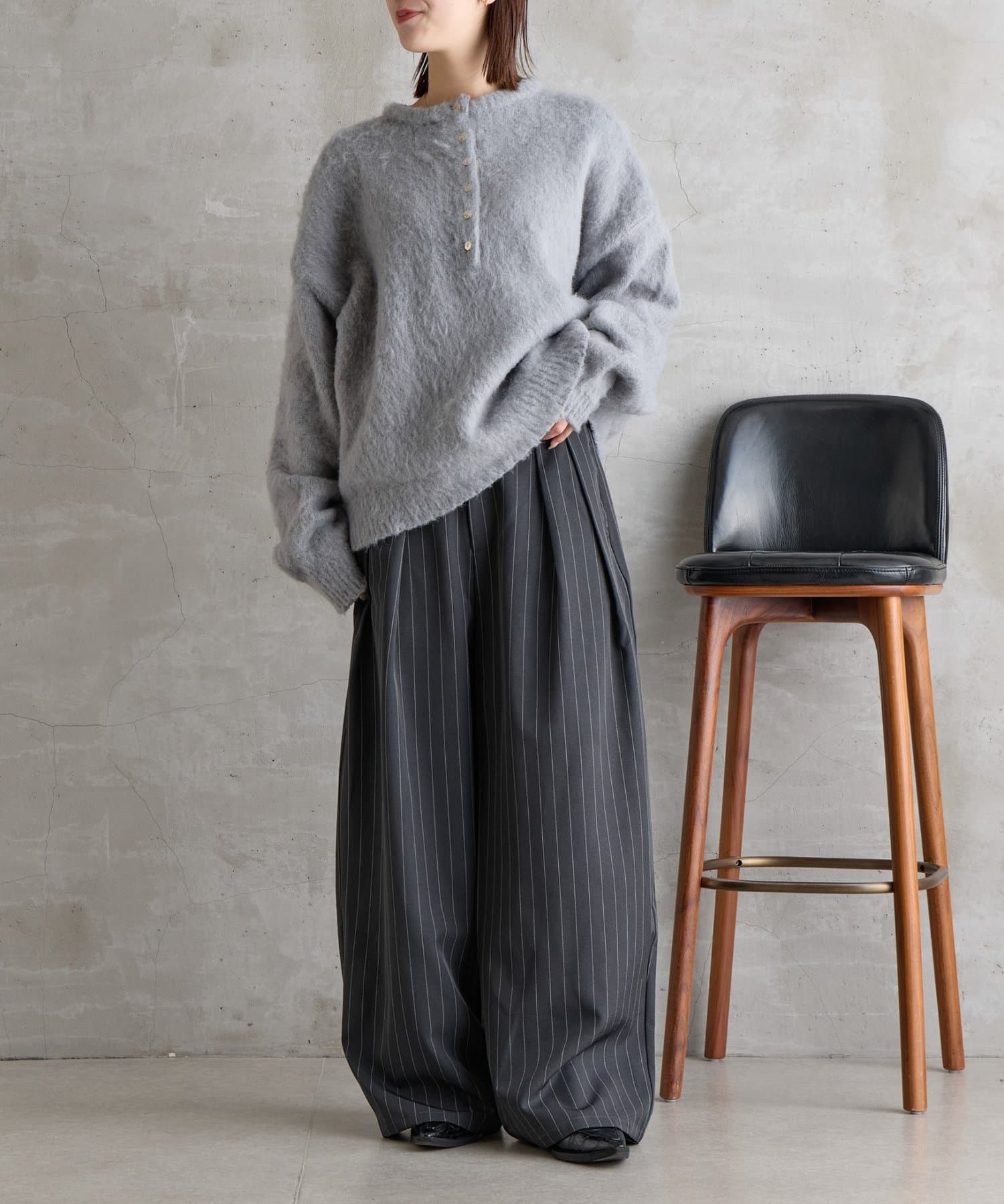 ・帆程よい深さのヘンリーネックで、抜け感のある大人カジュアルを演出