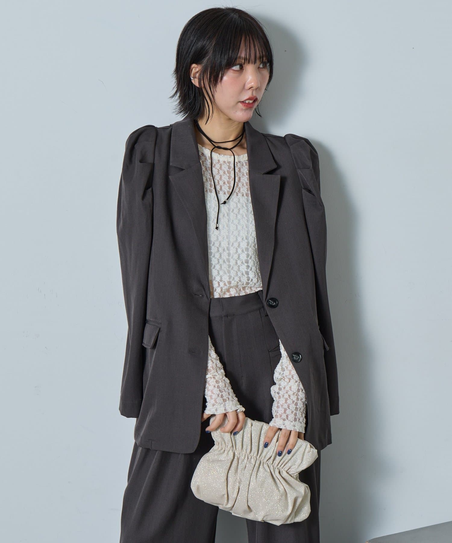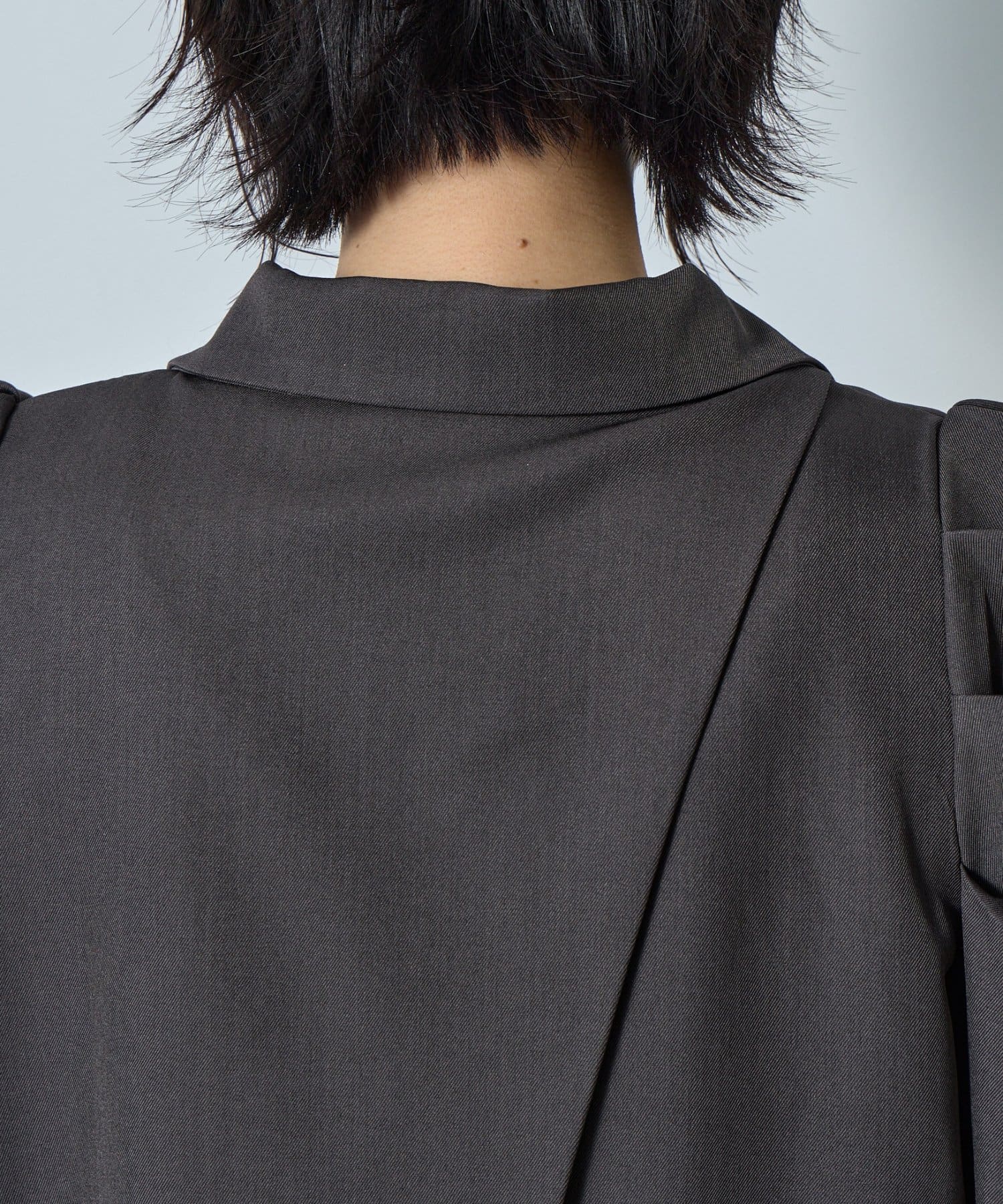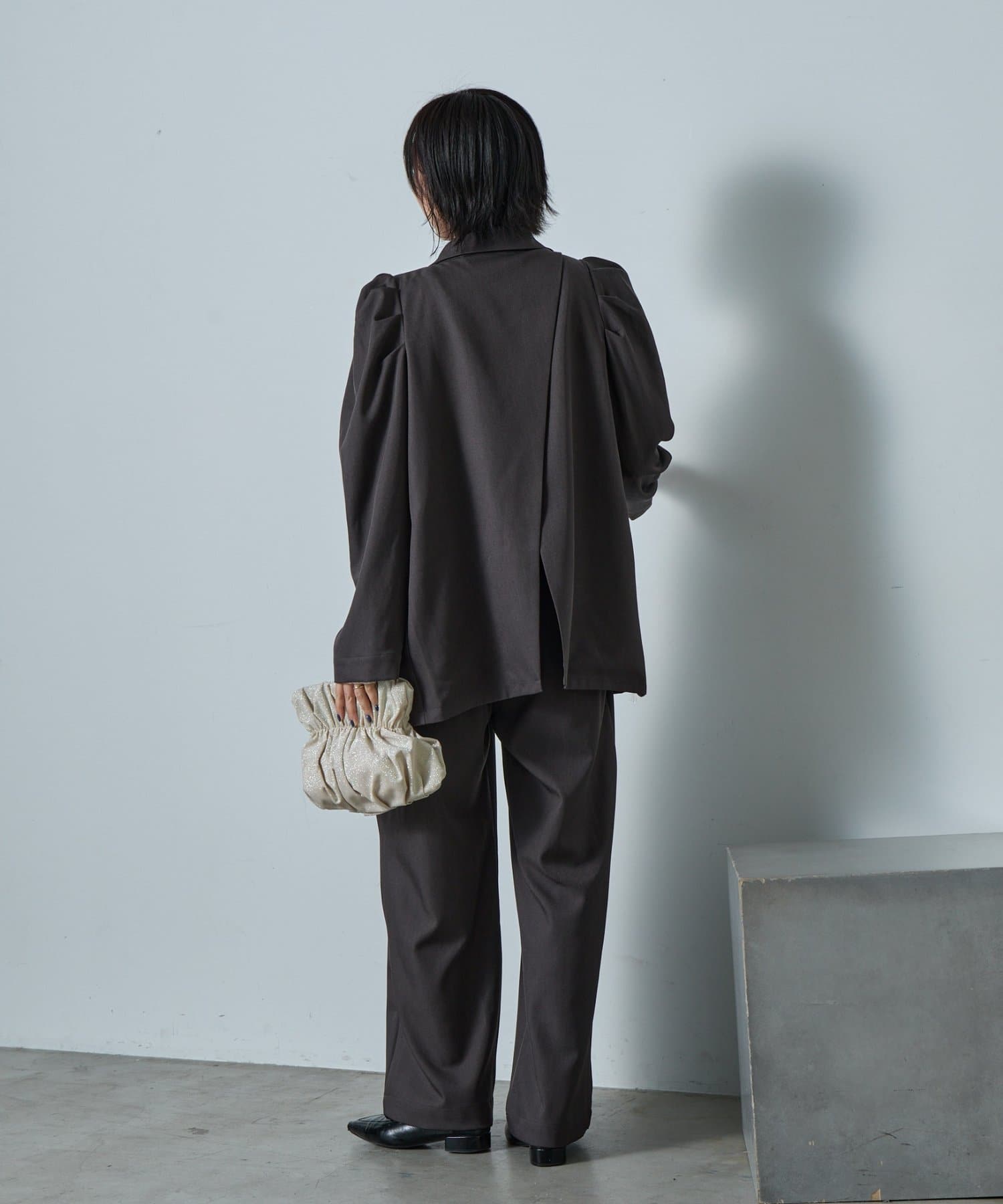 ・パフスリーブを控えめな立体感に調整し、華やぎすぎないモードな印象に