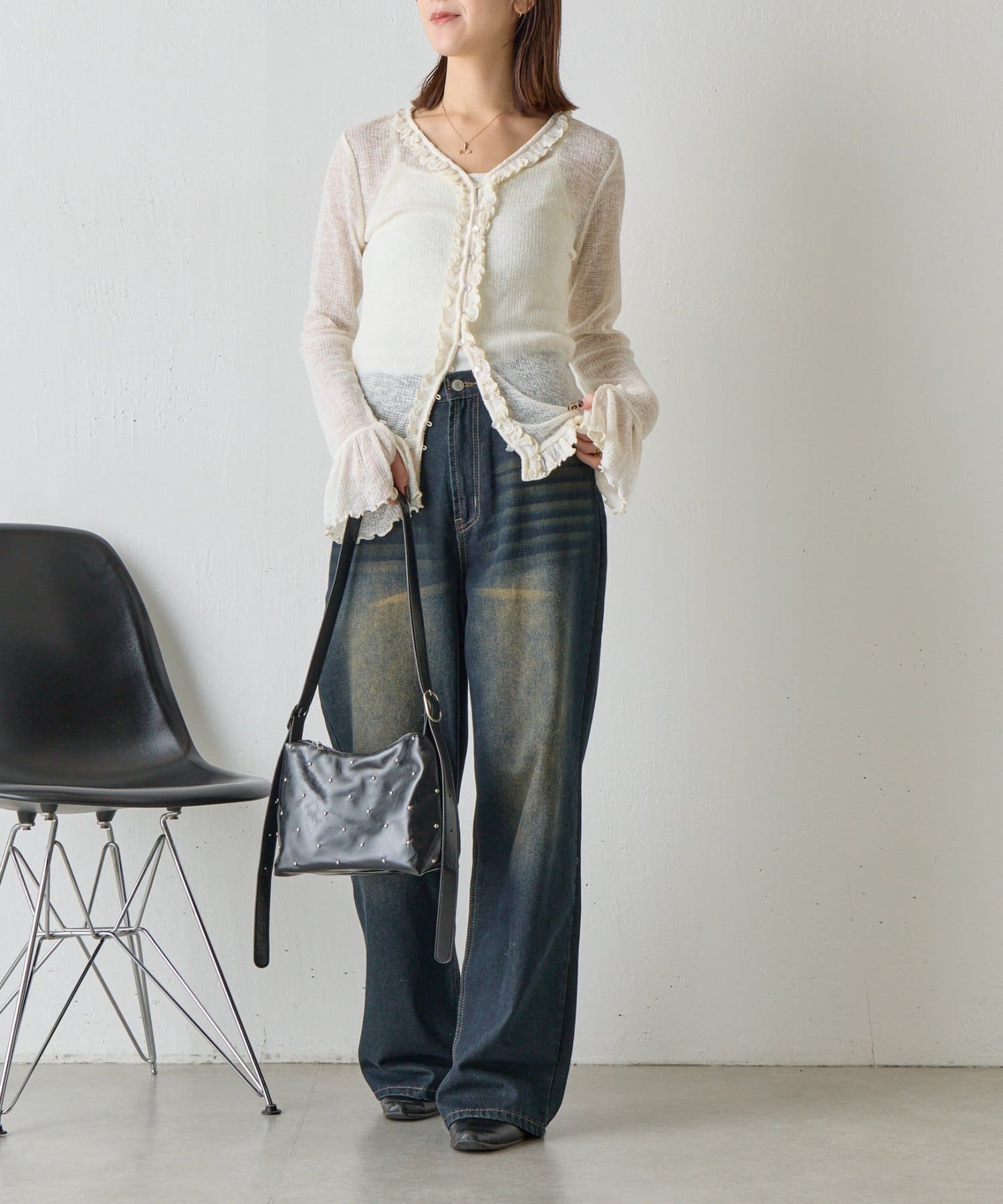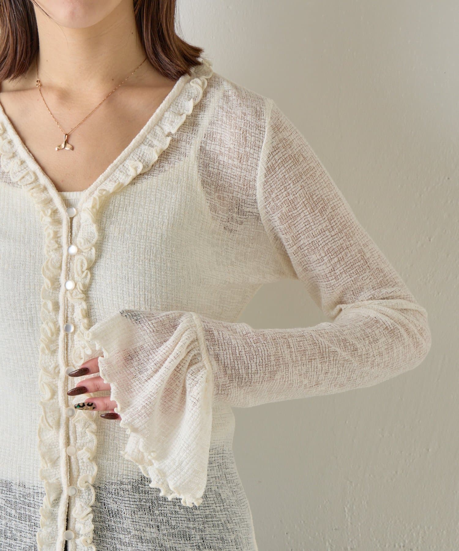 #ワッフル素材 #ワッフルカーディガン #シアーカーデ #フリルデザイン