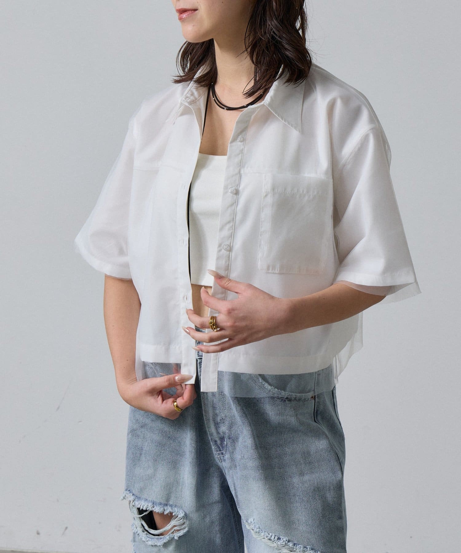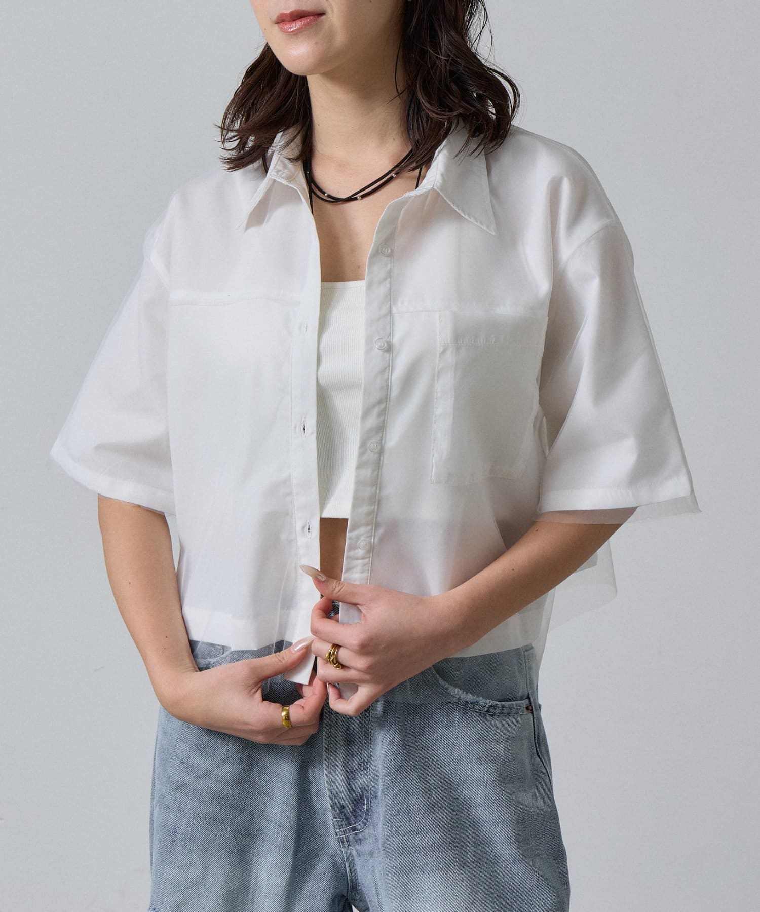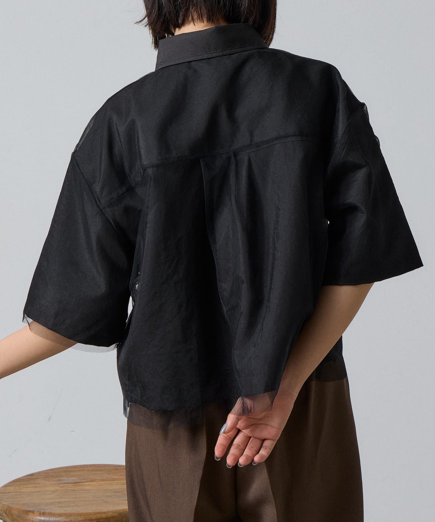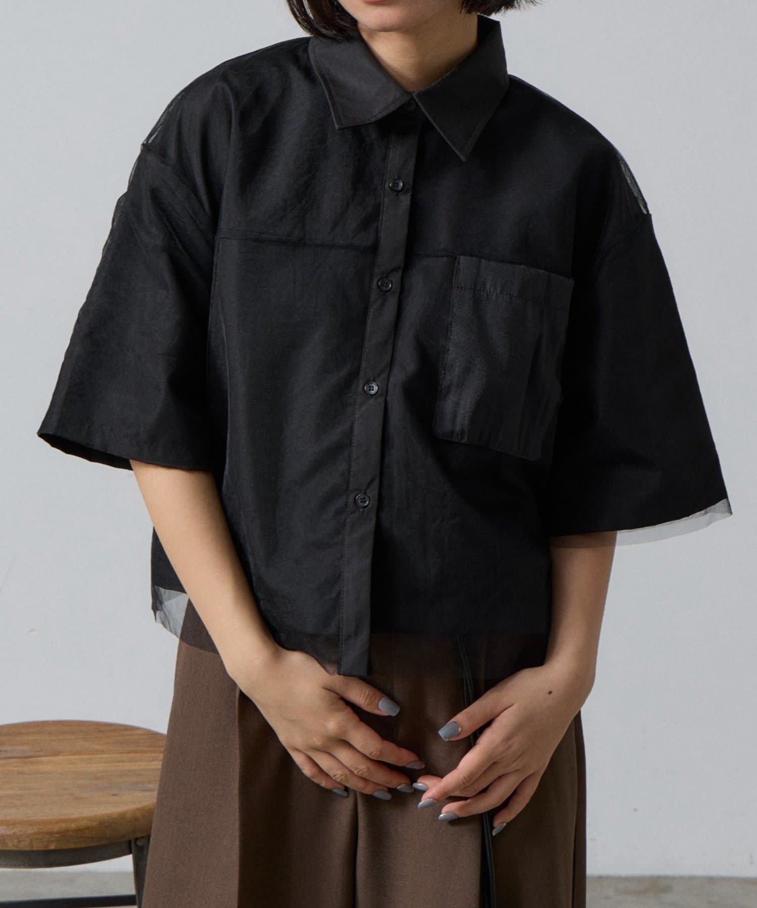 一枚で洒落る、チュール被せ半袖シャツ