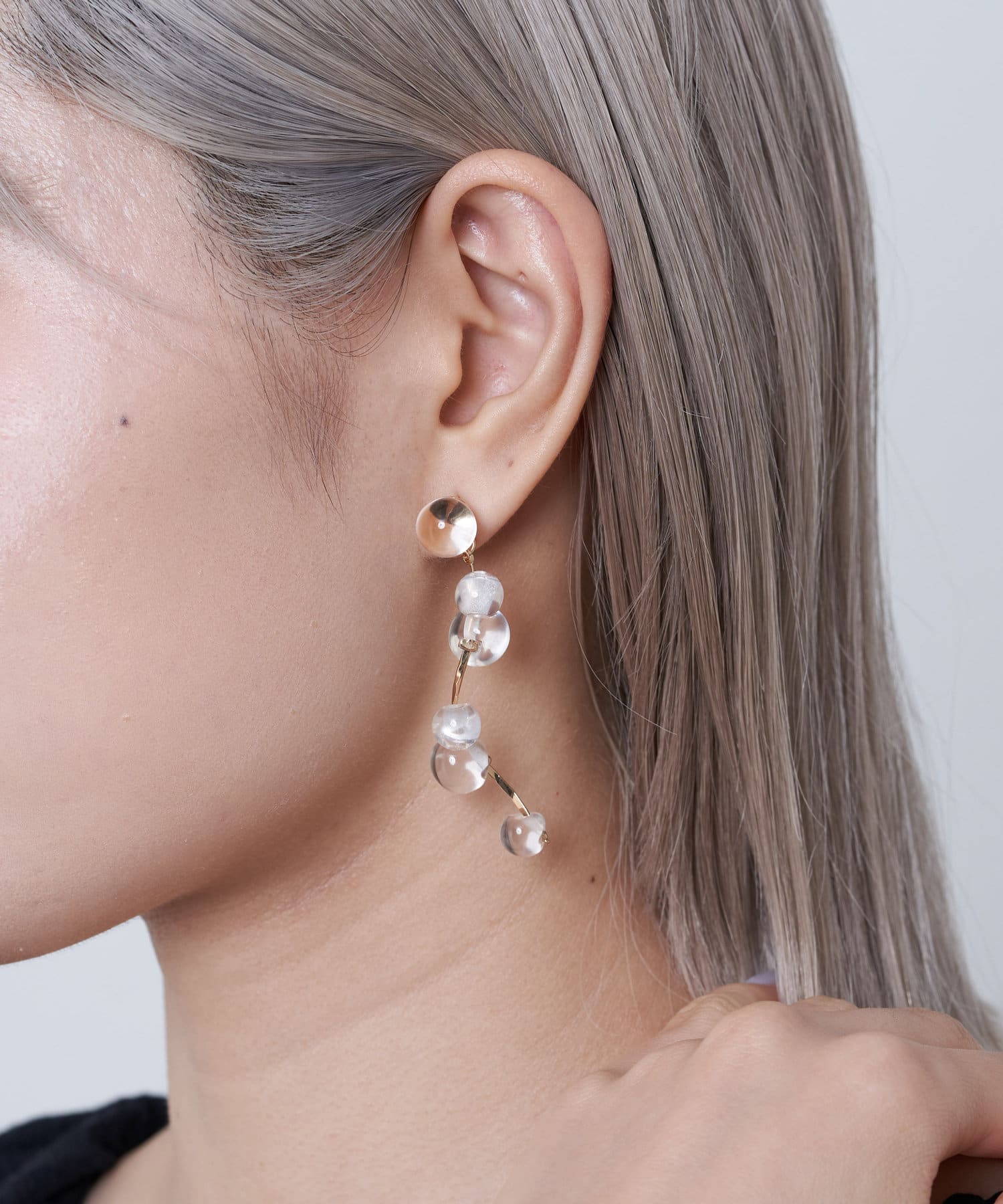 インパクトのあるピアスですが、クリア素材のため上品な印象になります。