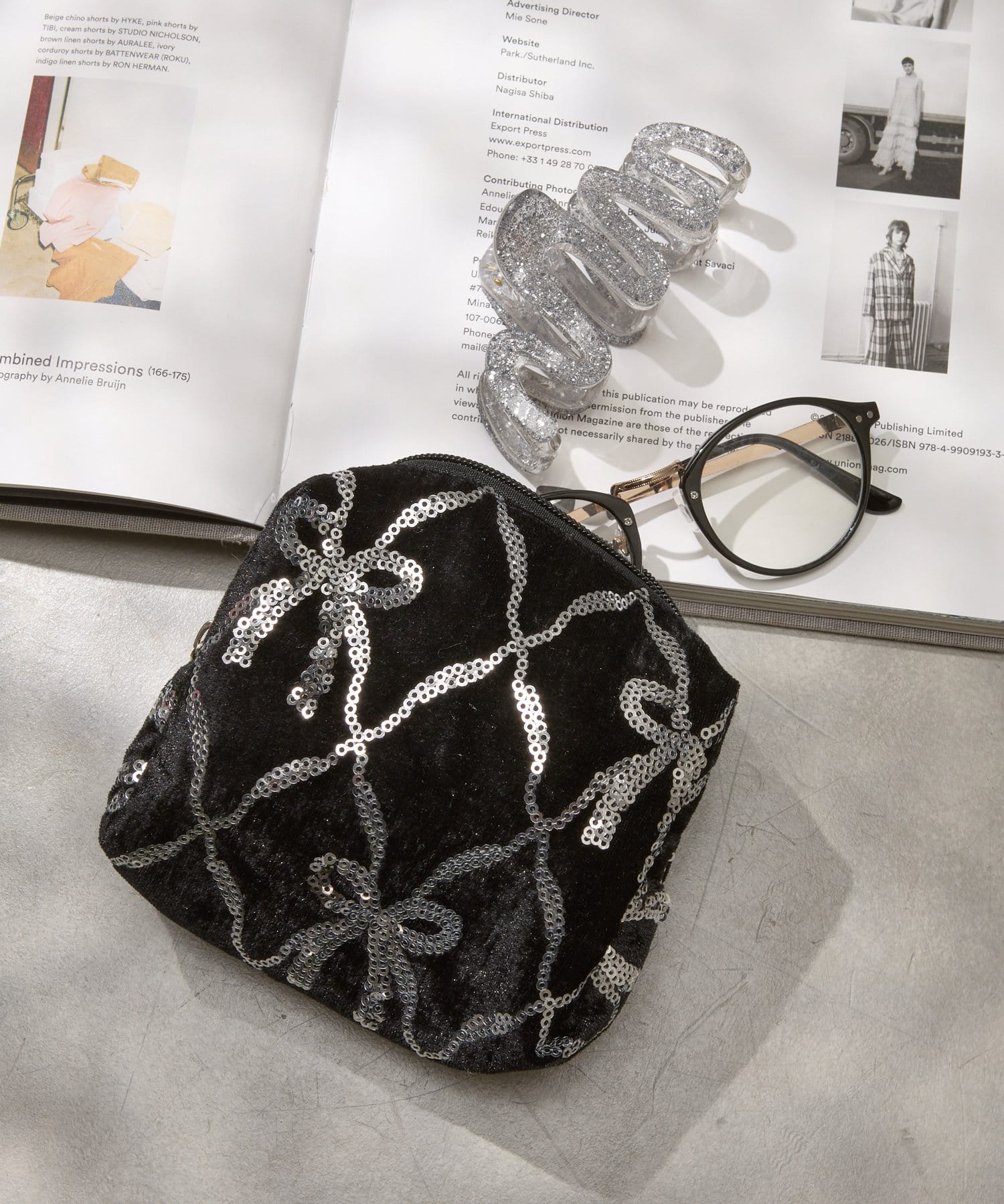 スパンコールのリボンがポイントの新作ポーチ