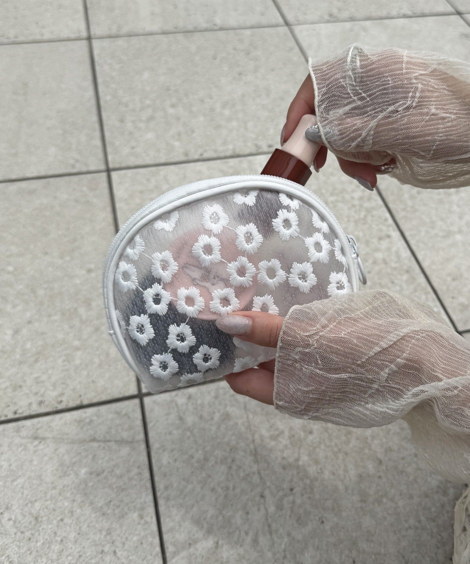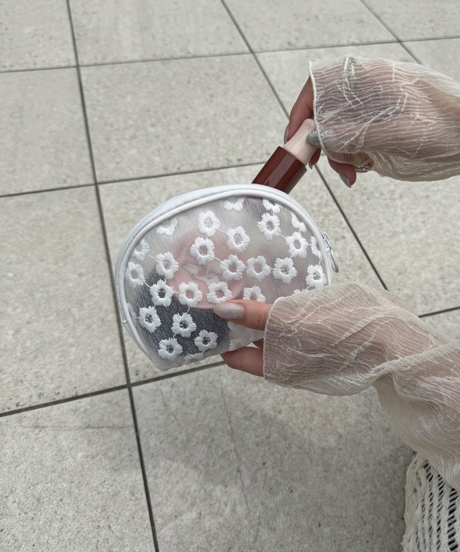 こぶりだけれど実用的で、ちょっとコスメなんかを入れて持ち歩き易い。透けたお花刺繍がかわいいです。