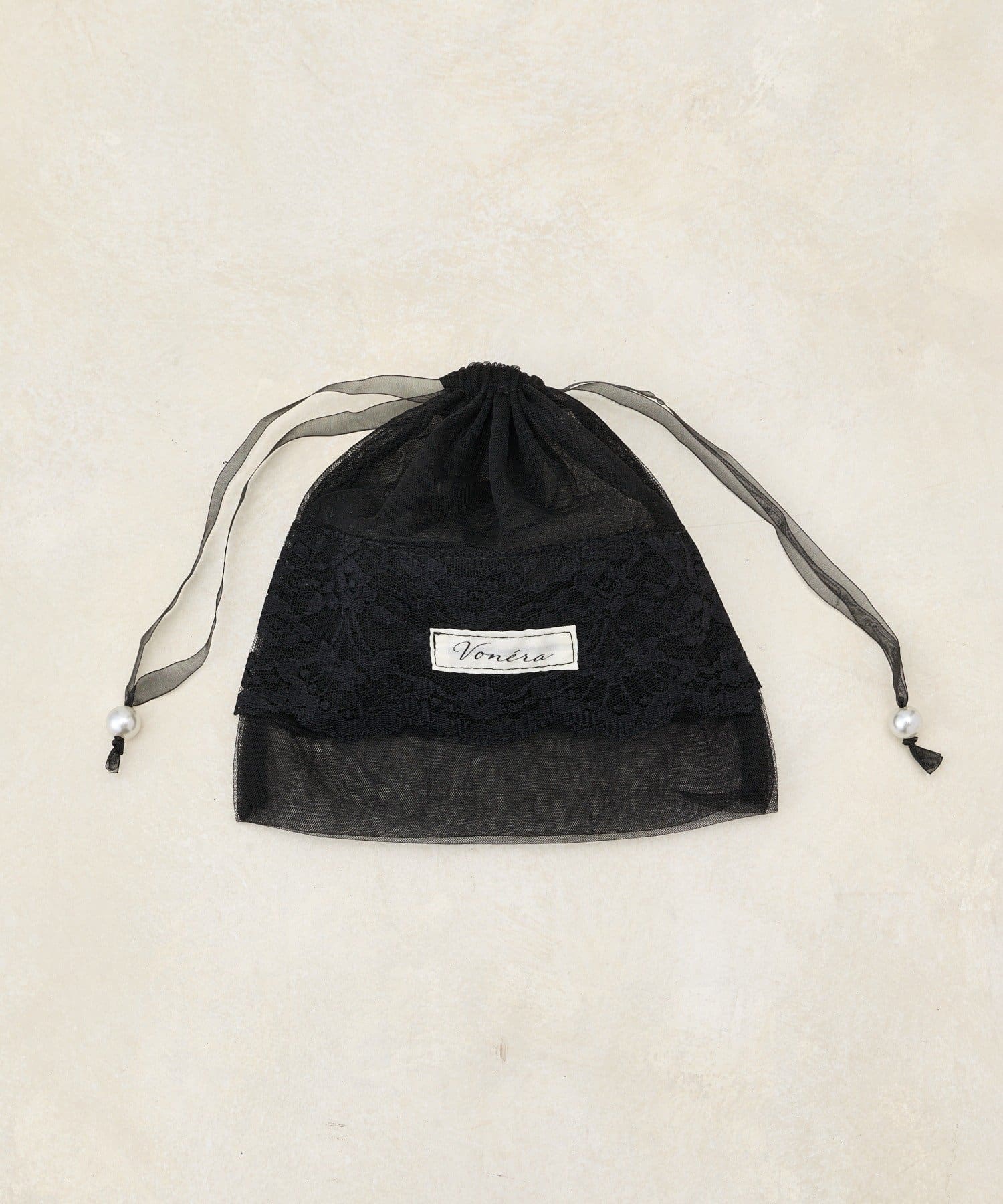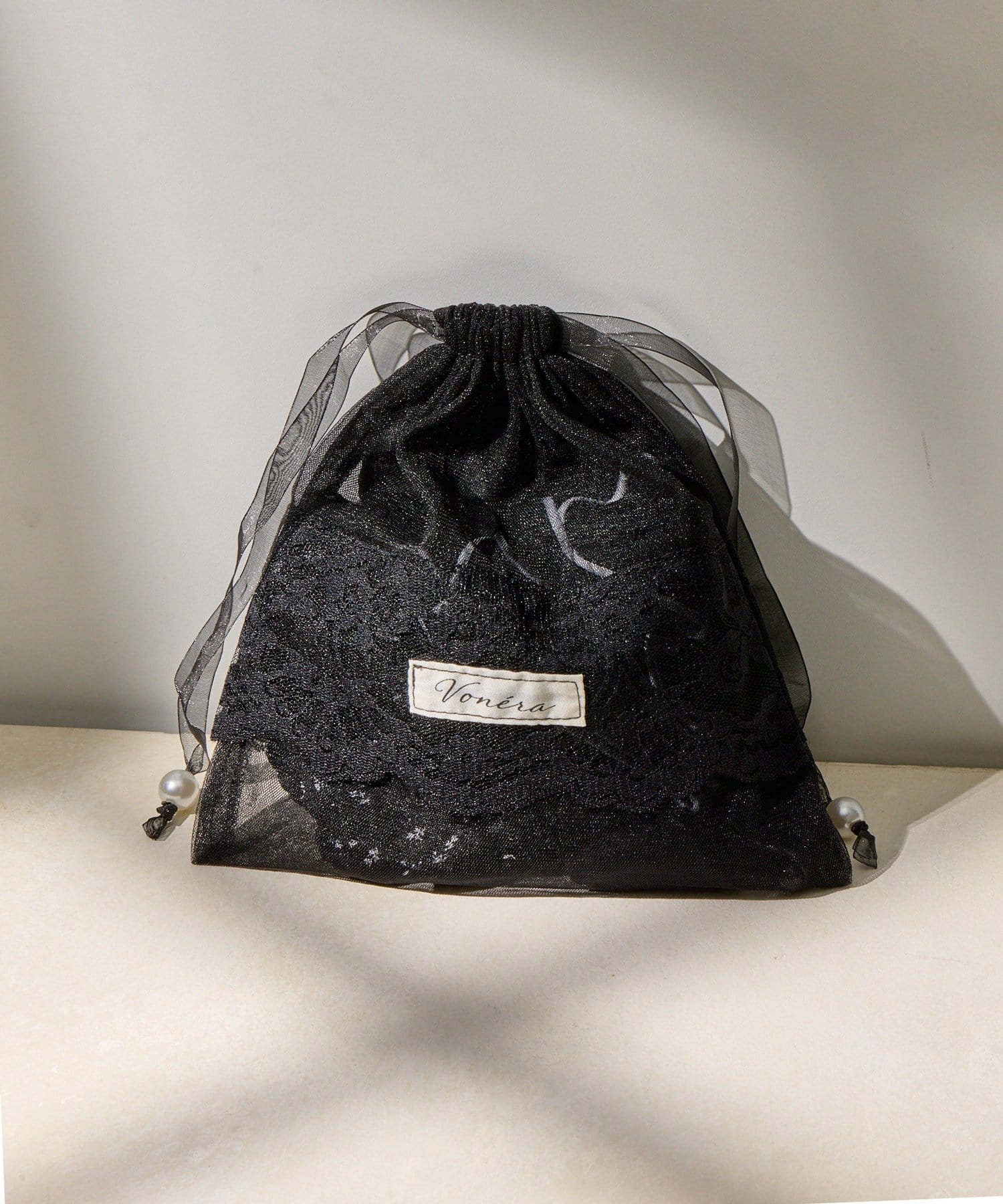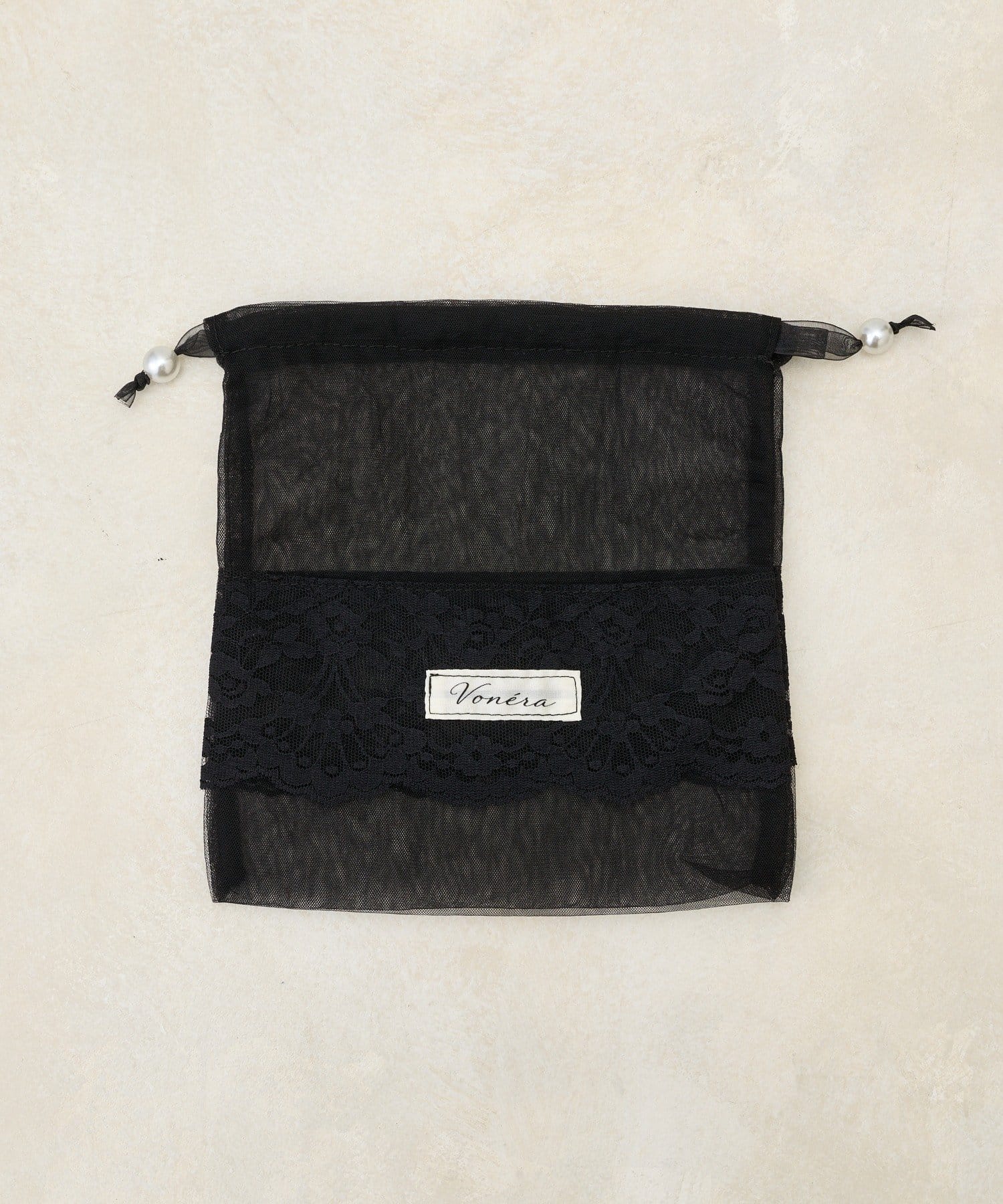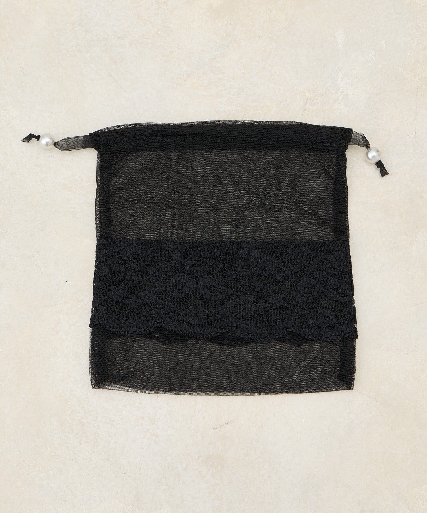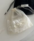 透け感のあるシアー素材に、繊細なレースを組み合わせたフェミニンな巾着ポーチです。