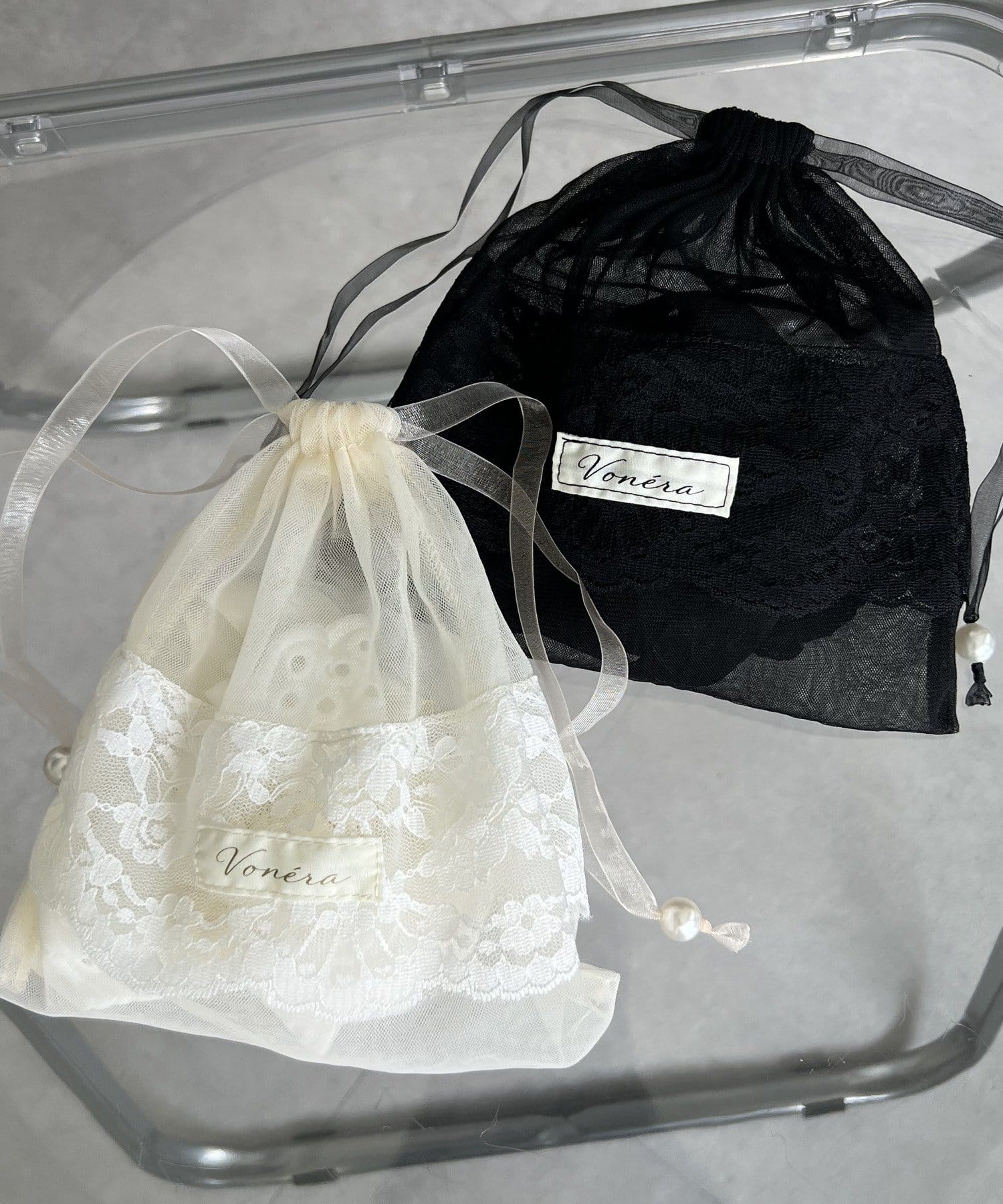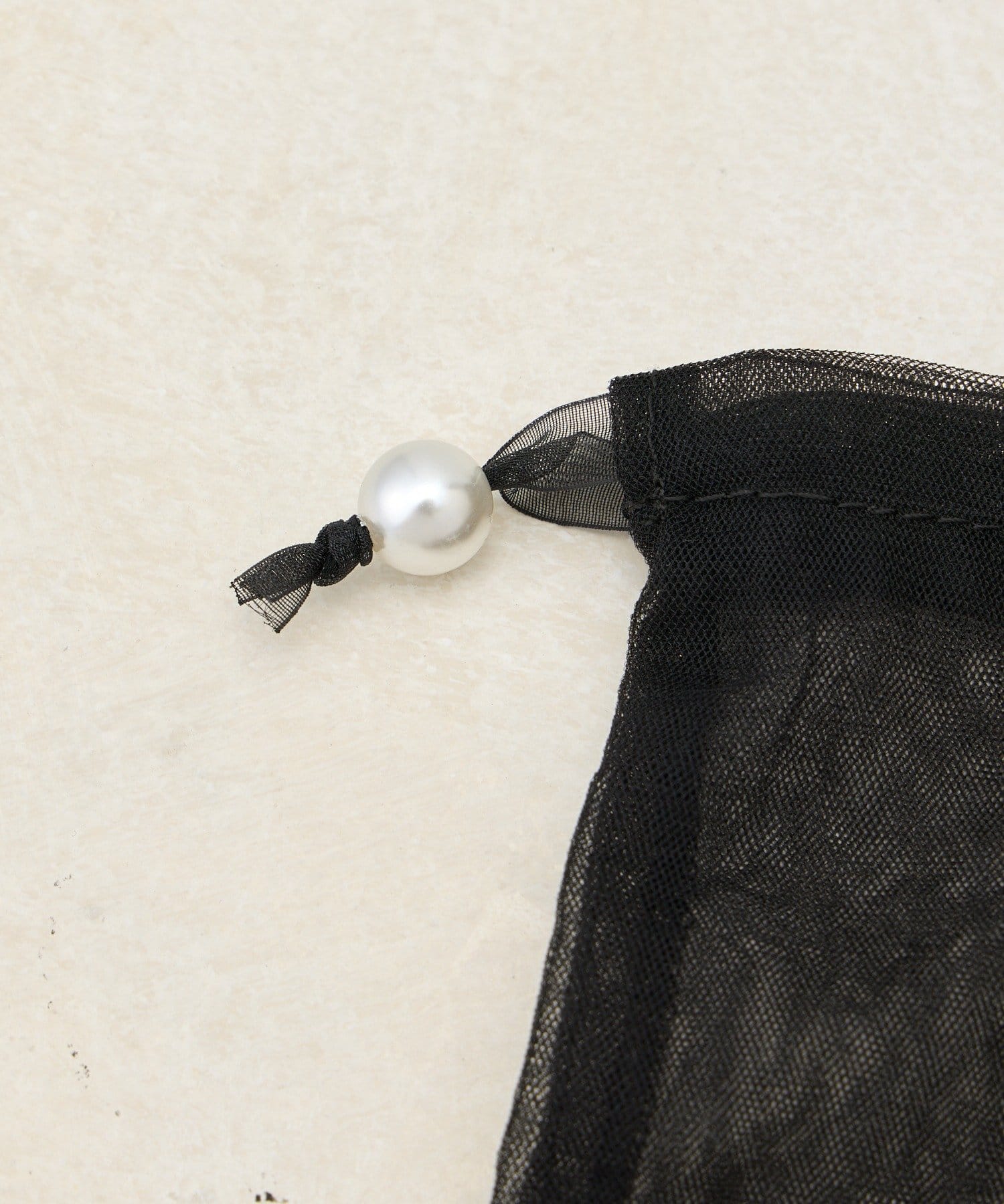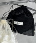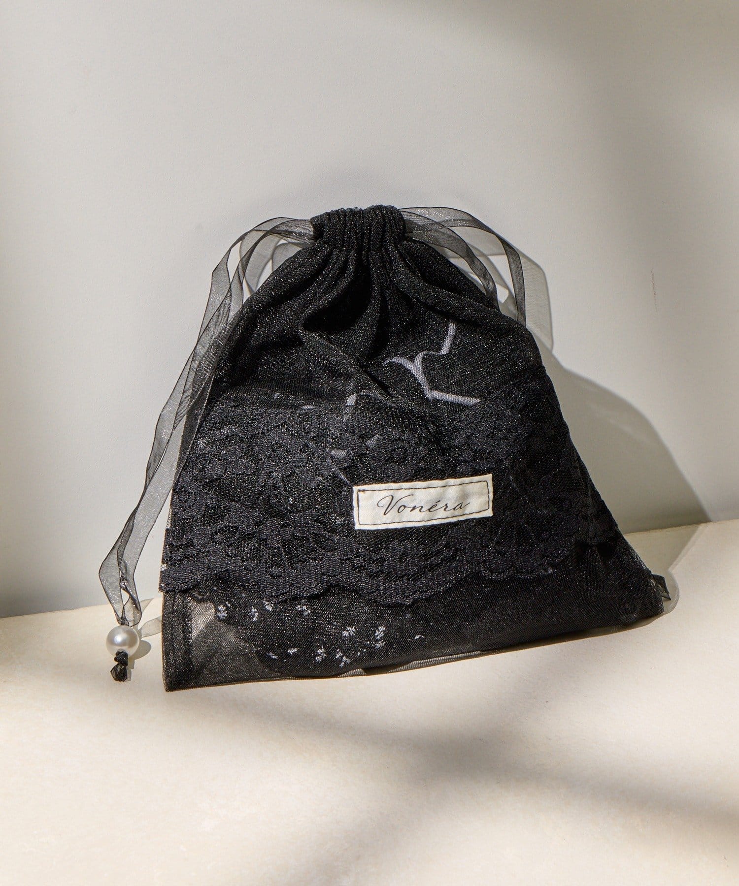 透け感のあるシアー素材に、繊細なレースを組み合わせたフェミニンな巾着ポーチです。