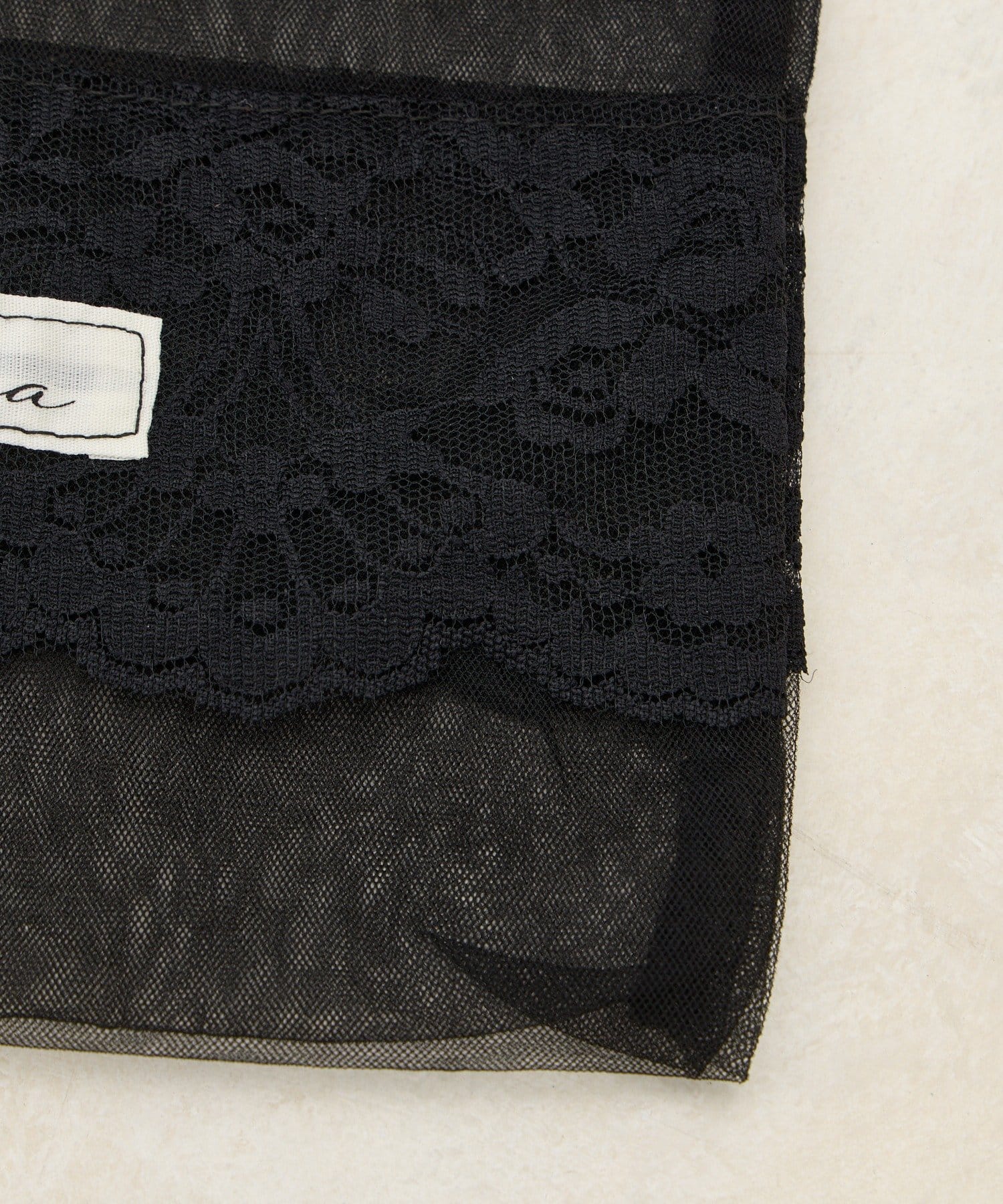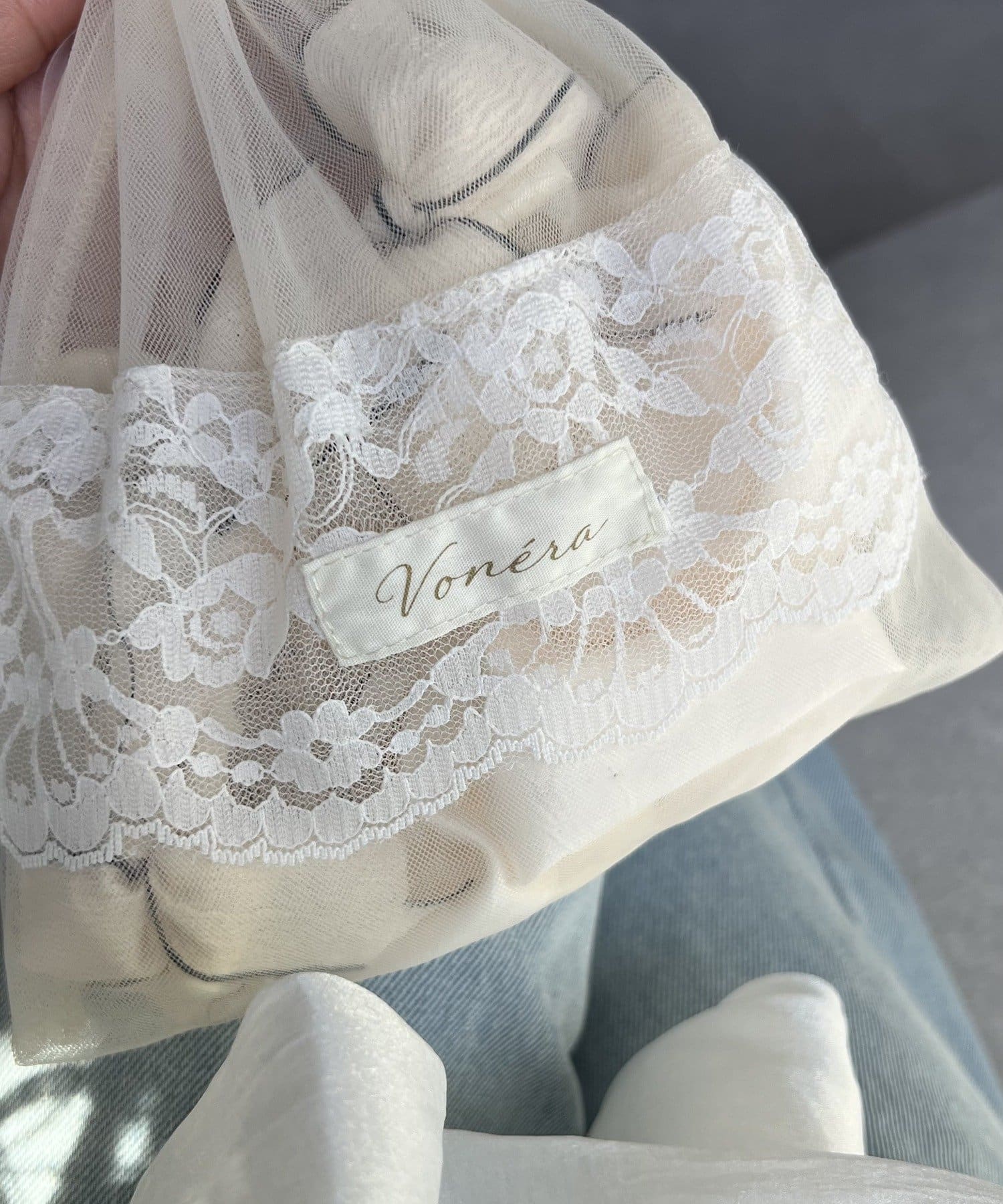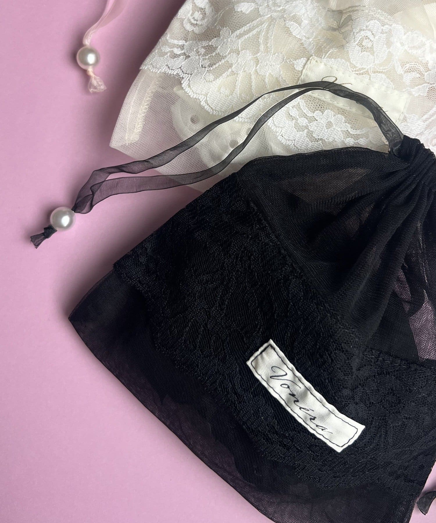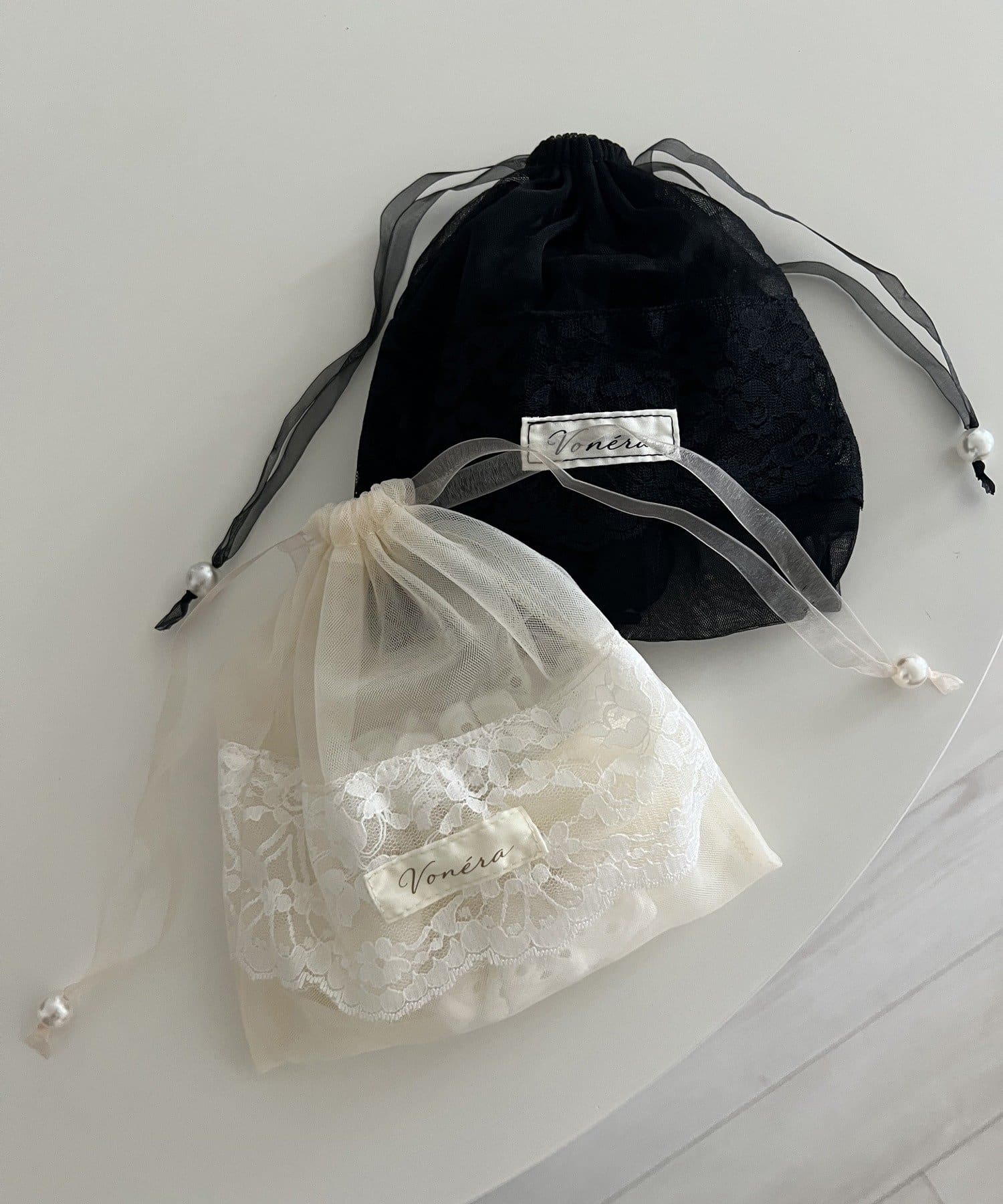 透け感のあるシアー素材に、繊細なレースを組み合わせたフェミニンな巾着ポーチです。