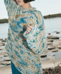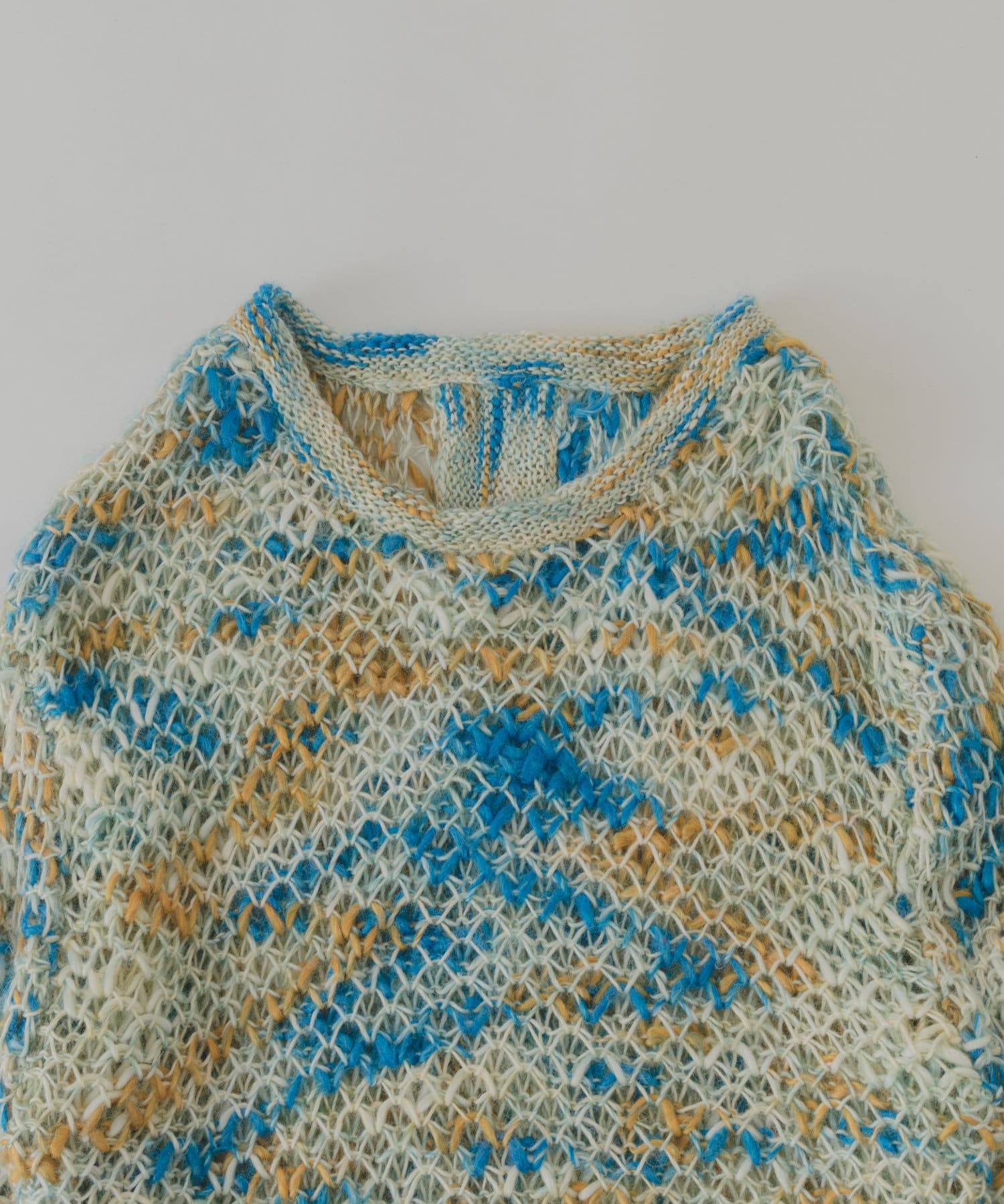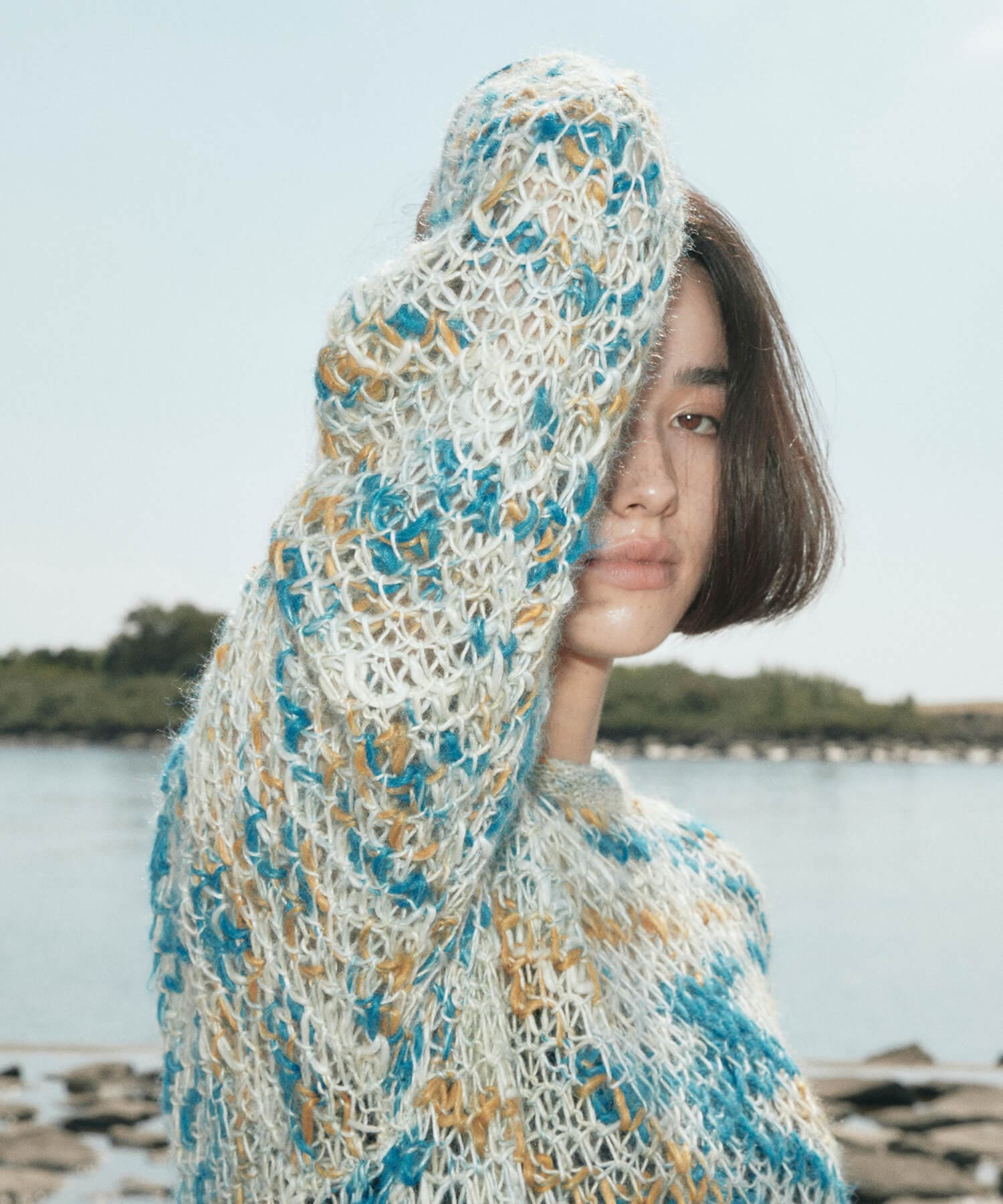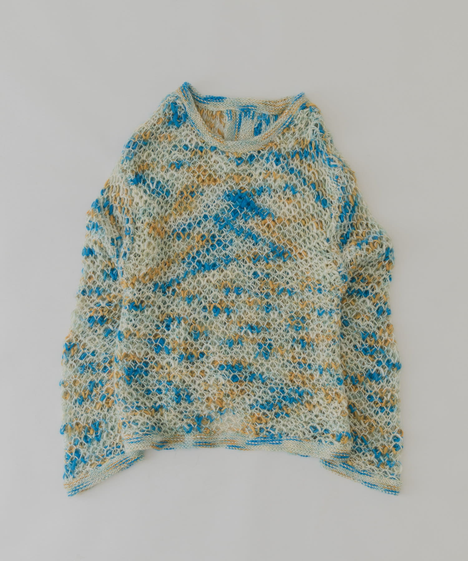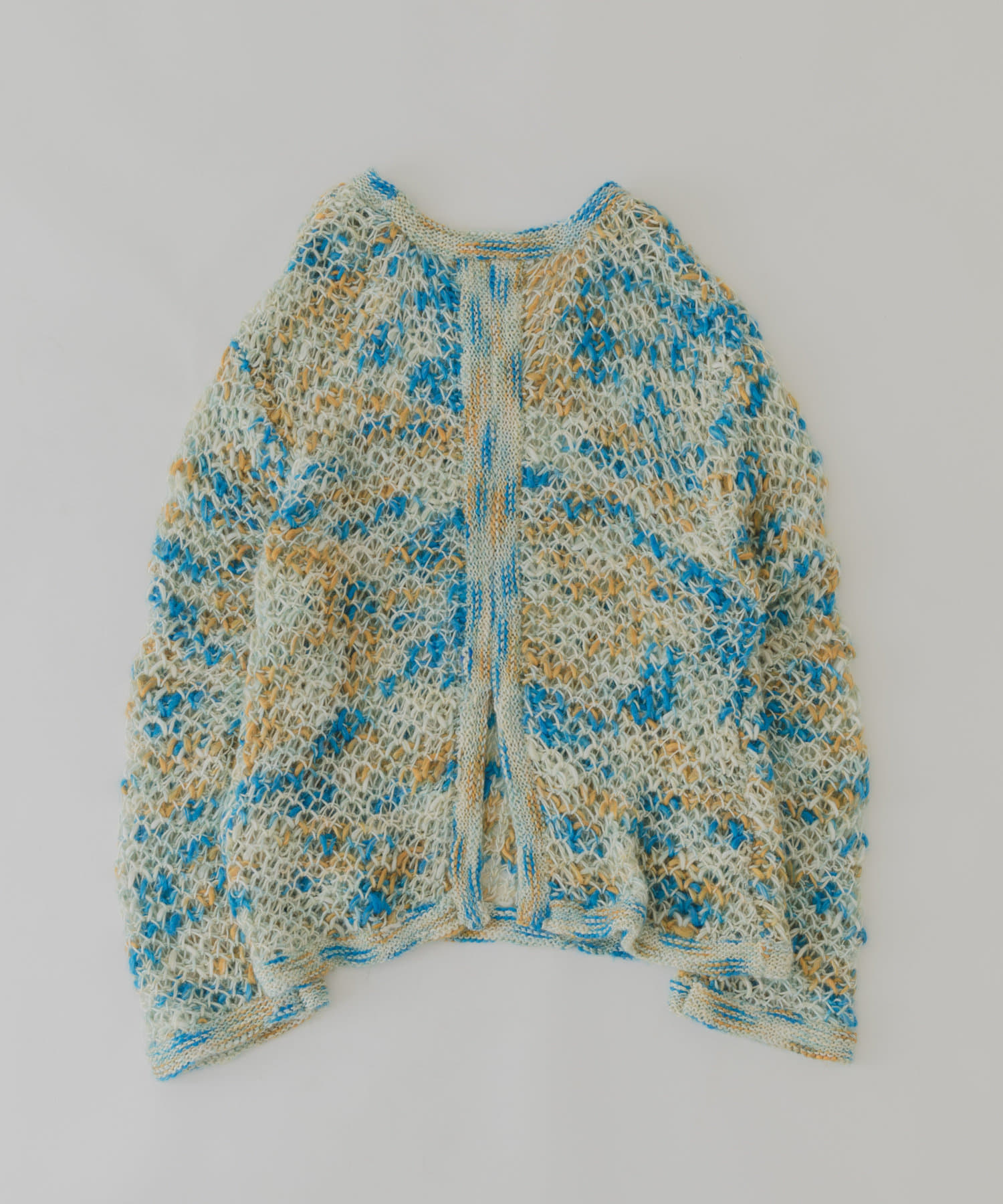 クラッシュしたようなランダムなメッシュ編みが特徴的な、超ローゲージニットです。