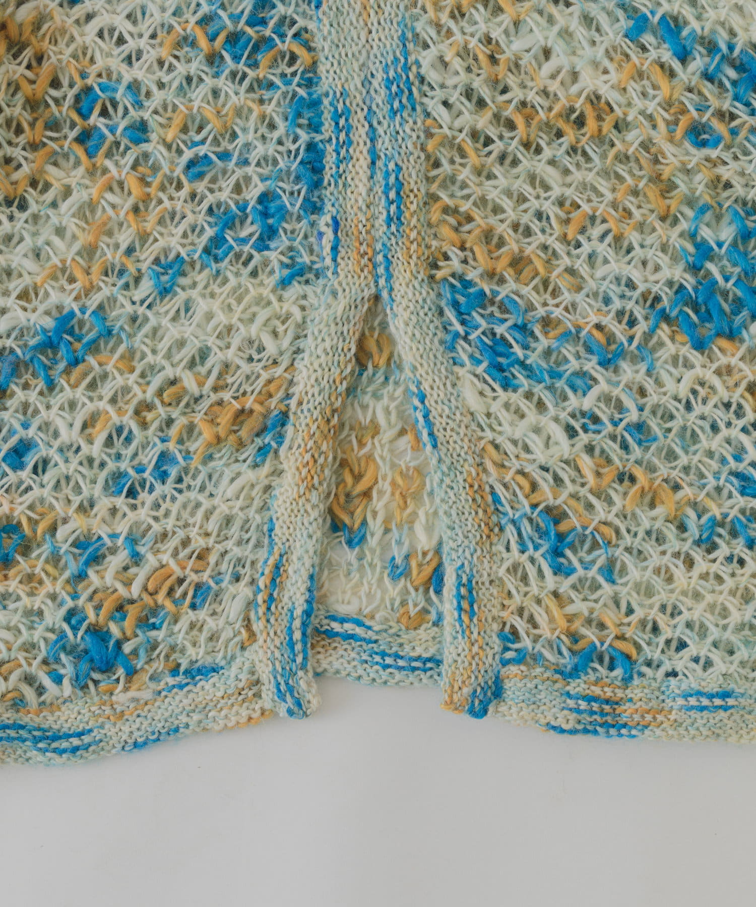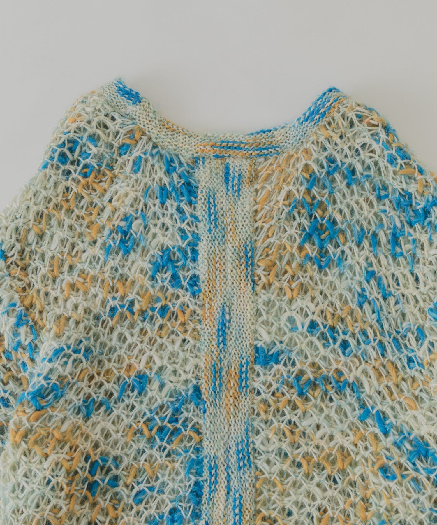 マクラメ編みのように大きくて緩い編み柄を目指し、わざと穴の形が不均一になるようアレンジしており、ルーズな印象に仕上げています。大きく入れたバックスリットもデザインポイントで、重ねるインナー選びが楽しめます。
