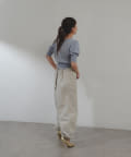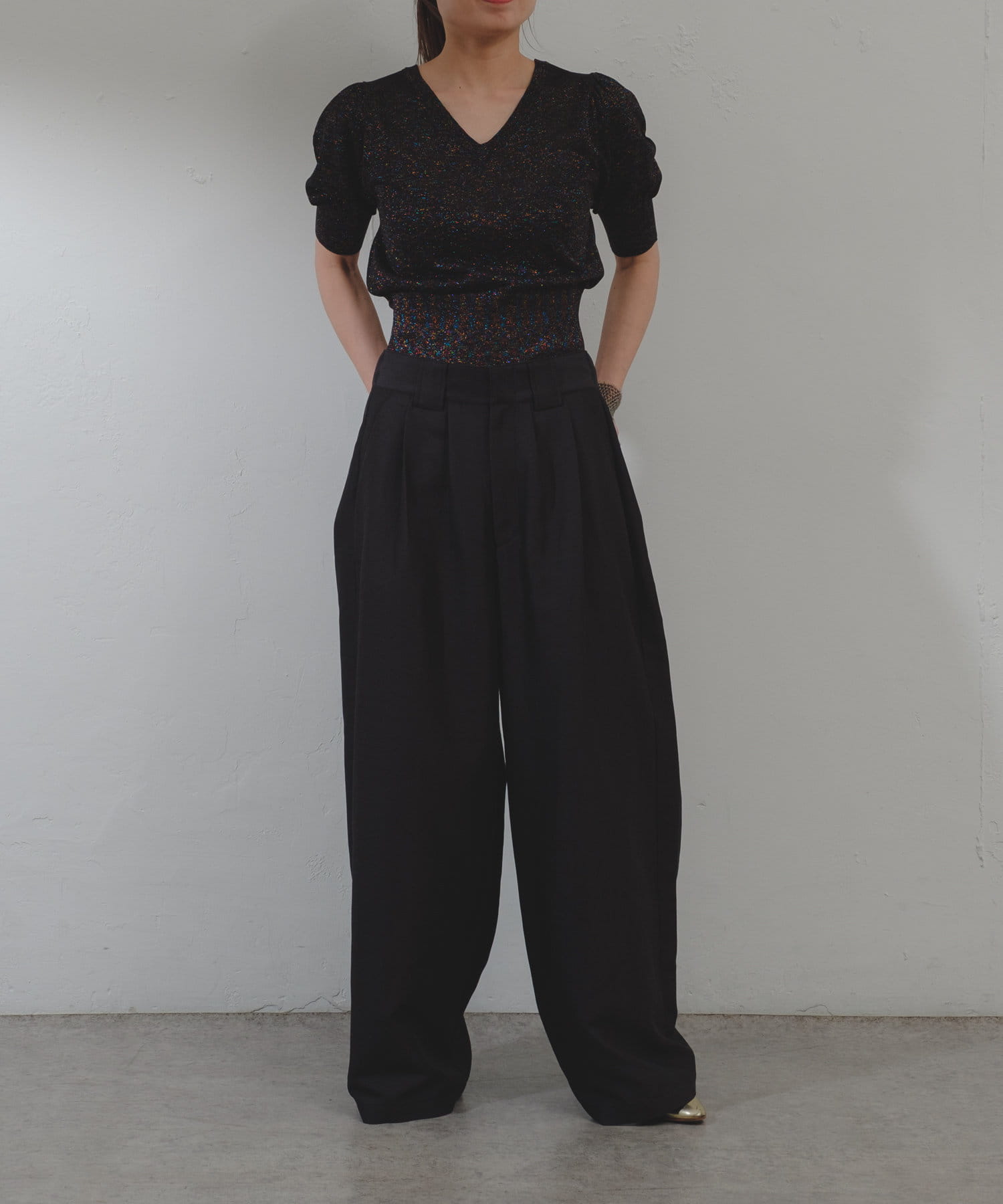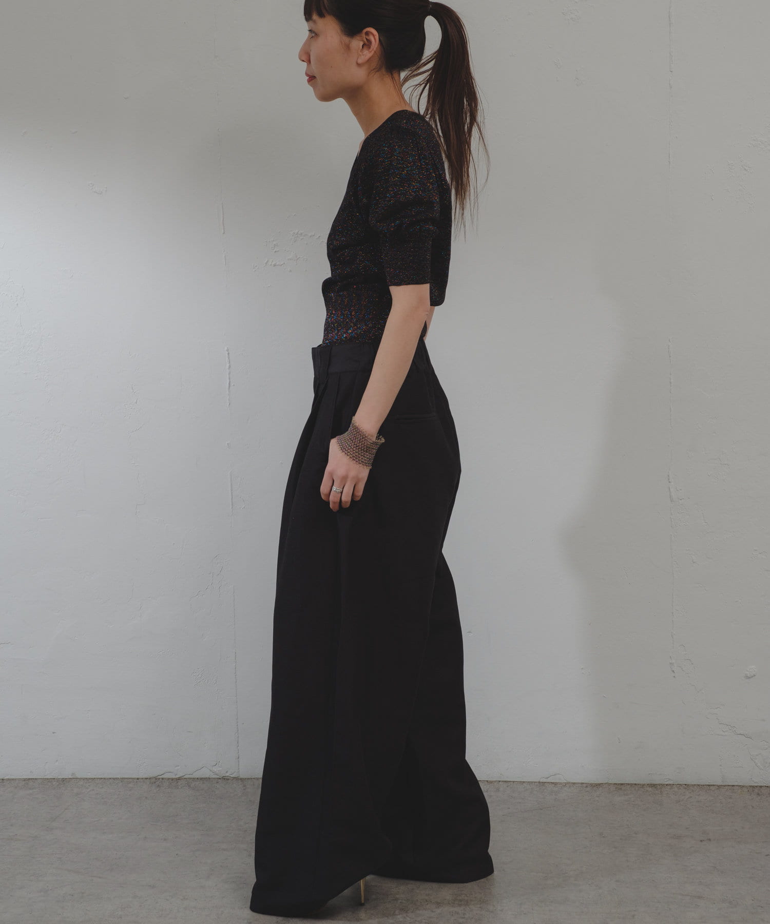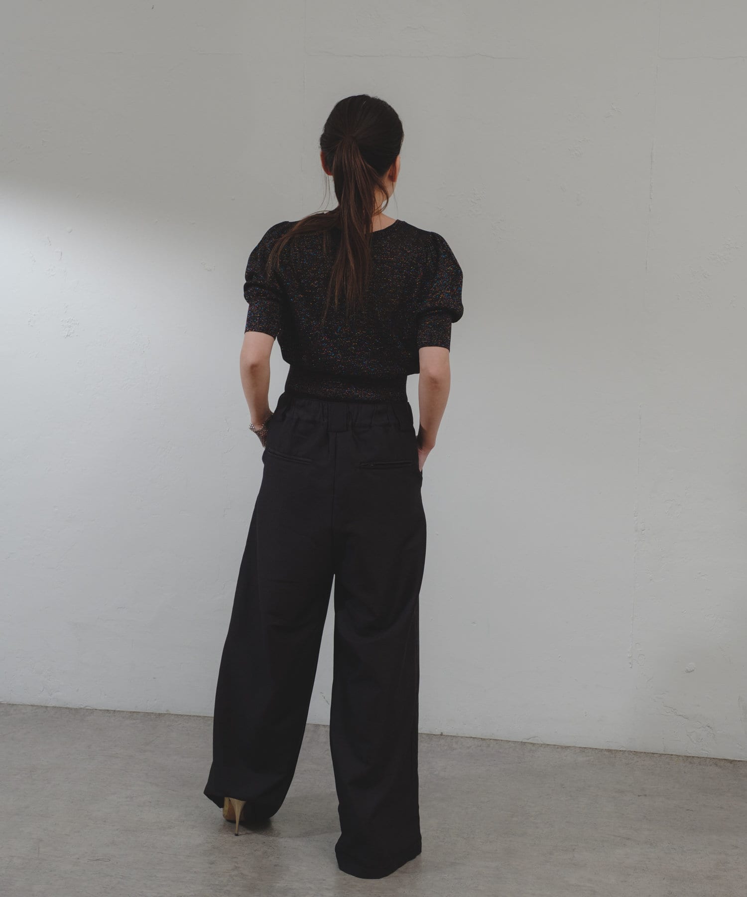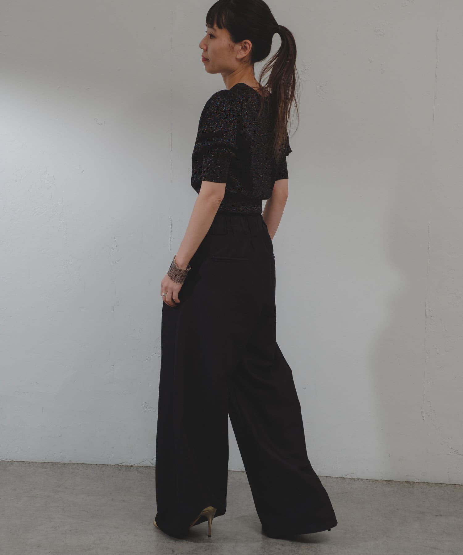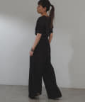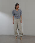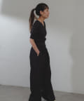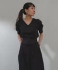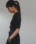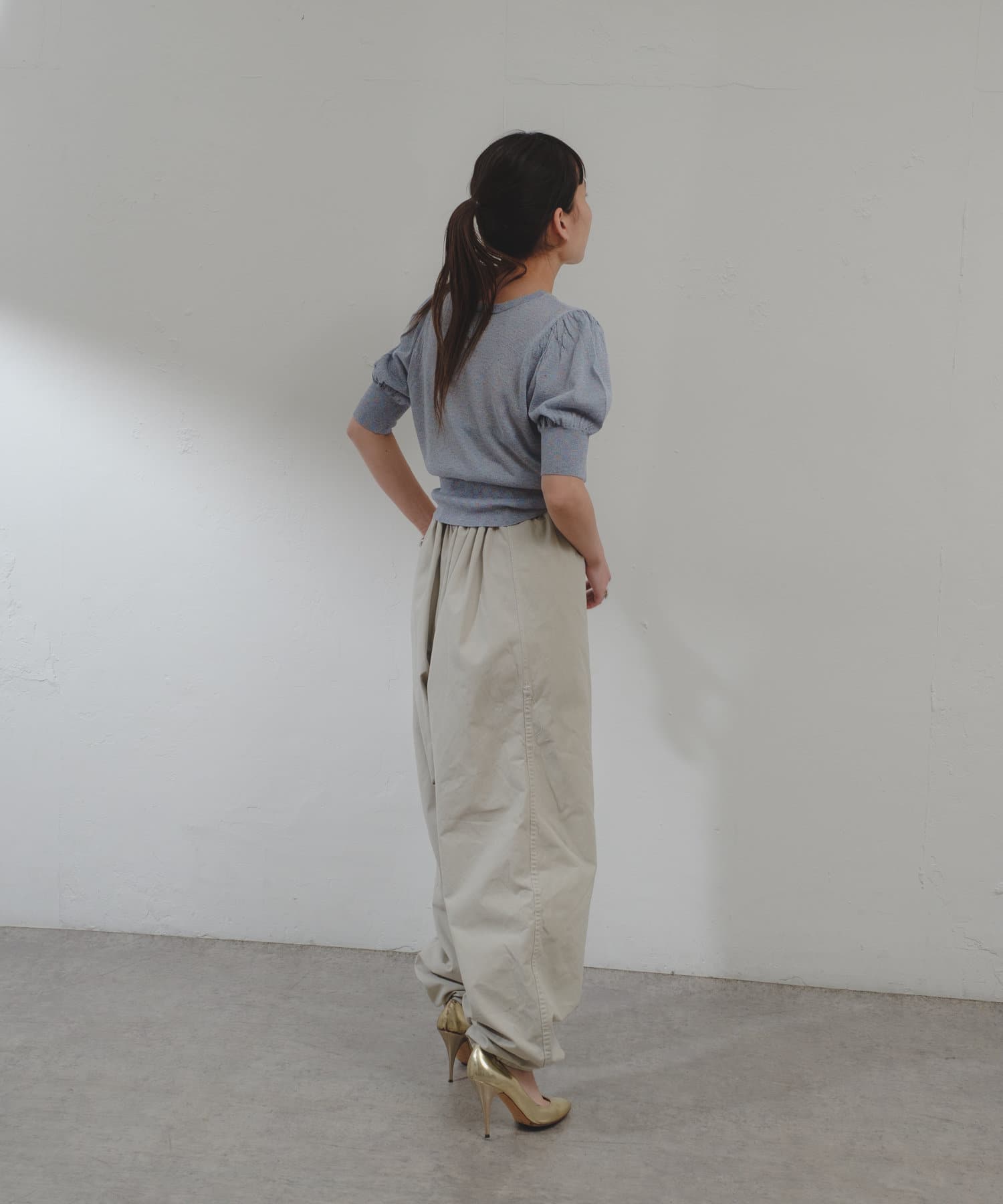 ボリュームパンツとのスタイリングを想定してコンパクトなサイジングに設定していますが、ギャザーとリブでボリュームとフィットのメリハリをつけたシルエットに仕上げており、非常に着痩せ効果があるのがポイント。裾のリブを12cm、袖のリブを8cmと長めに設定しているため、ウエストのくびれ感や腕の細さが強調されてスタイルアップが叶います。