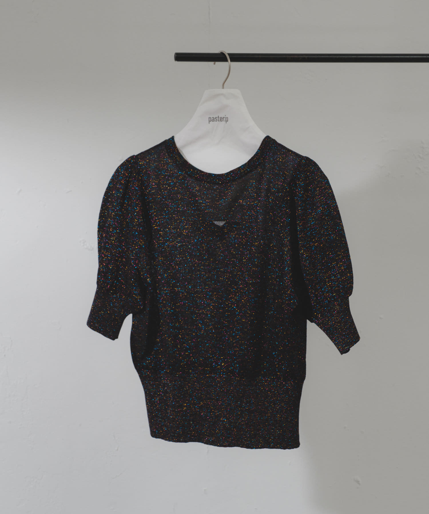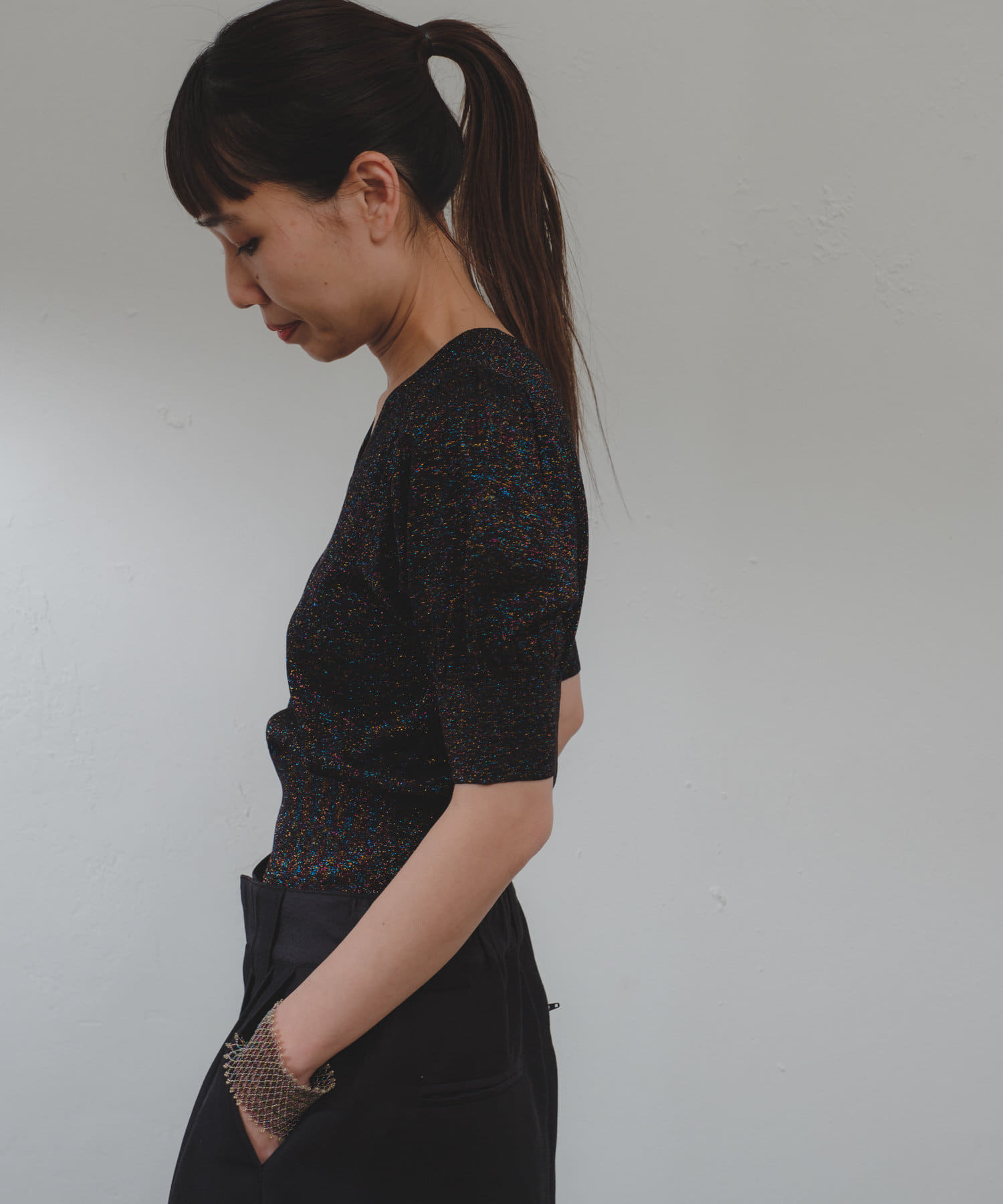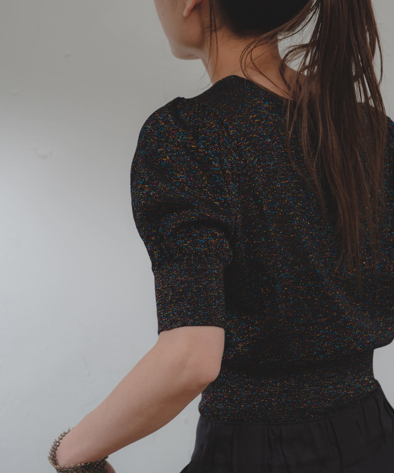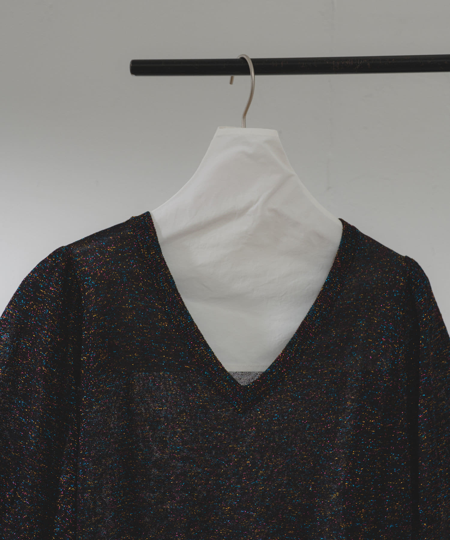 カラーMIXのラメ糸で編み上げている、光が透けて程よくキラキラと輝くシアーニットです。