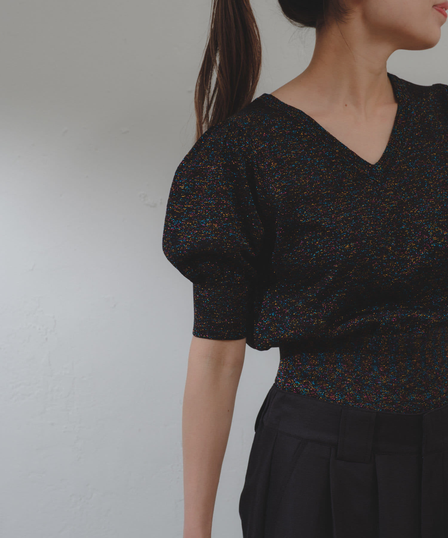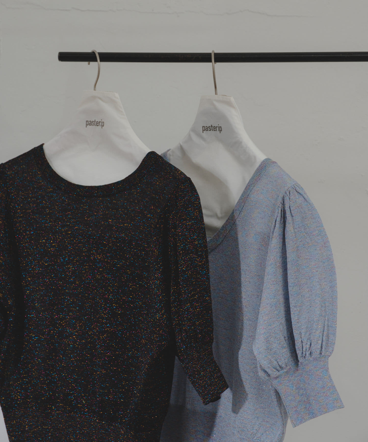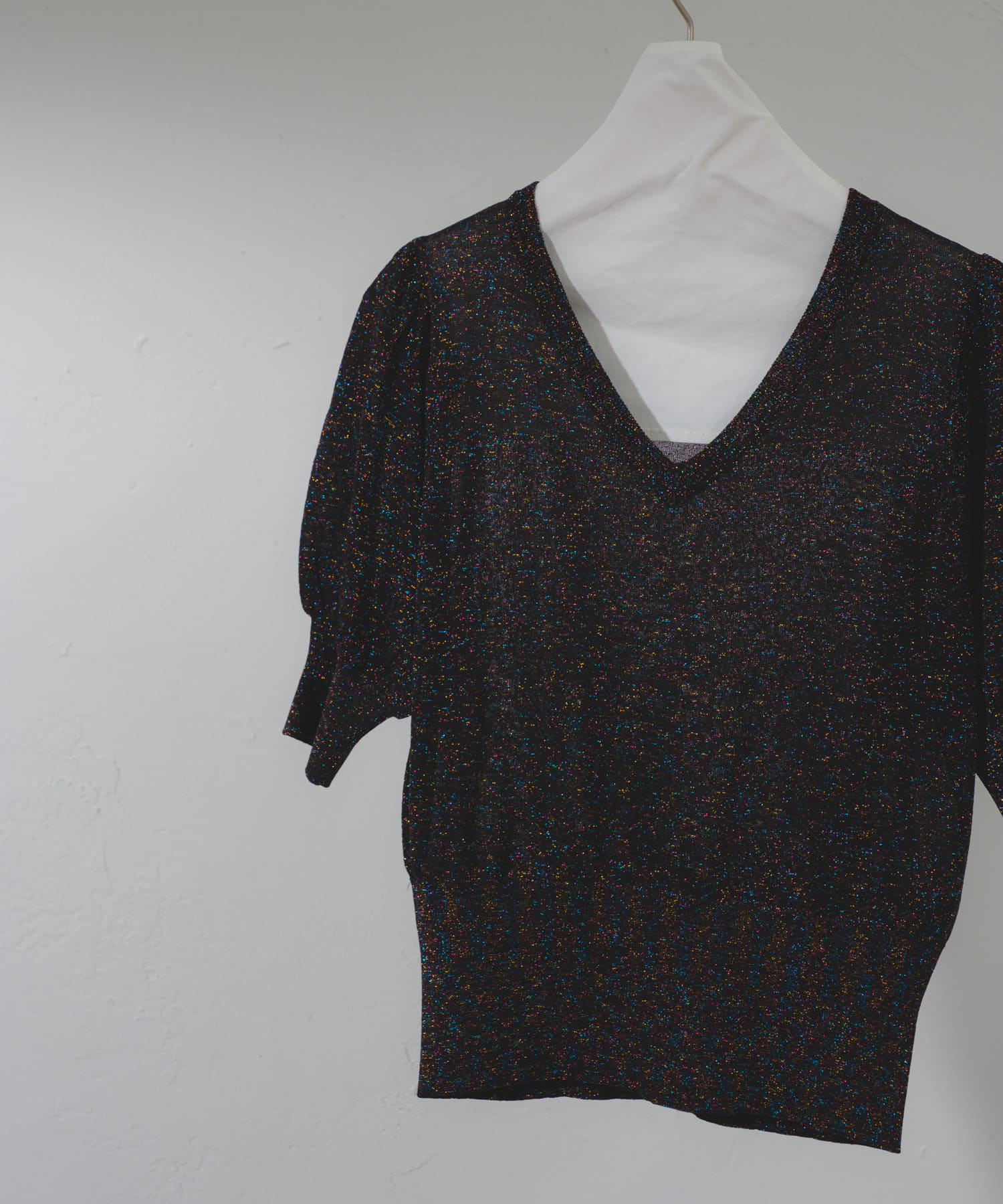 カラーMIXのラメ糸で編み上げている、光が透けて程よくキラキラと輝くシアーニットです。