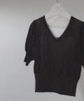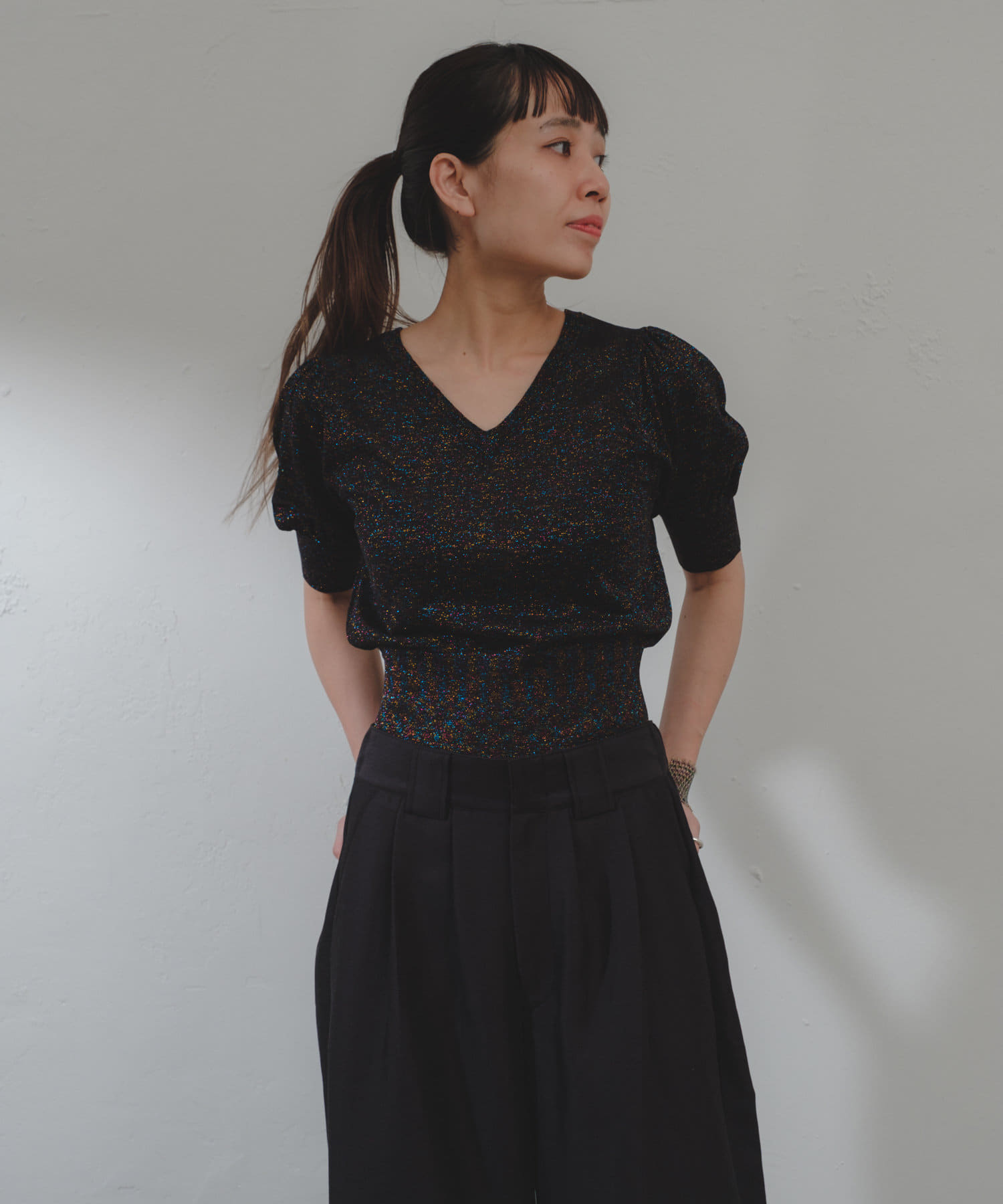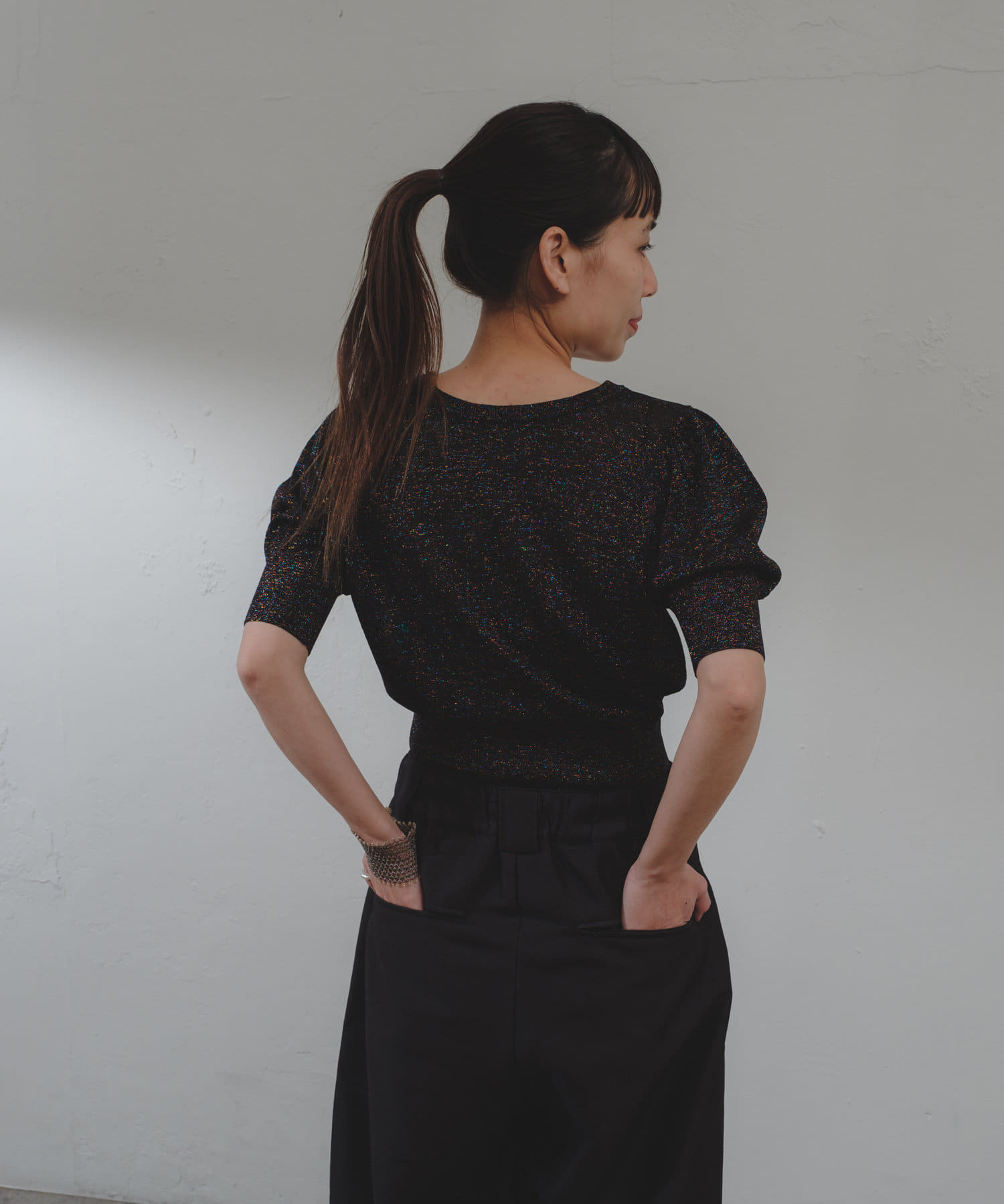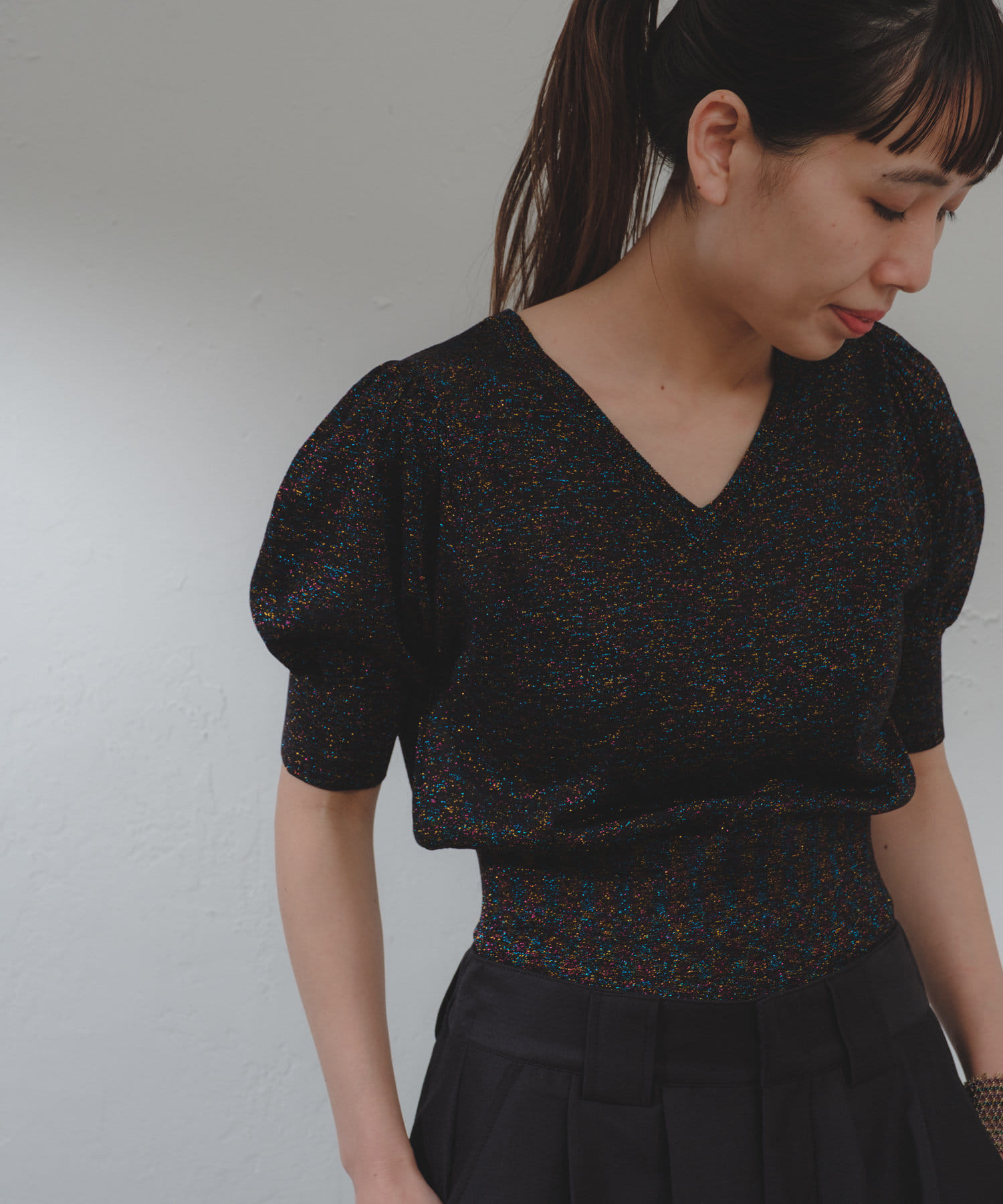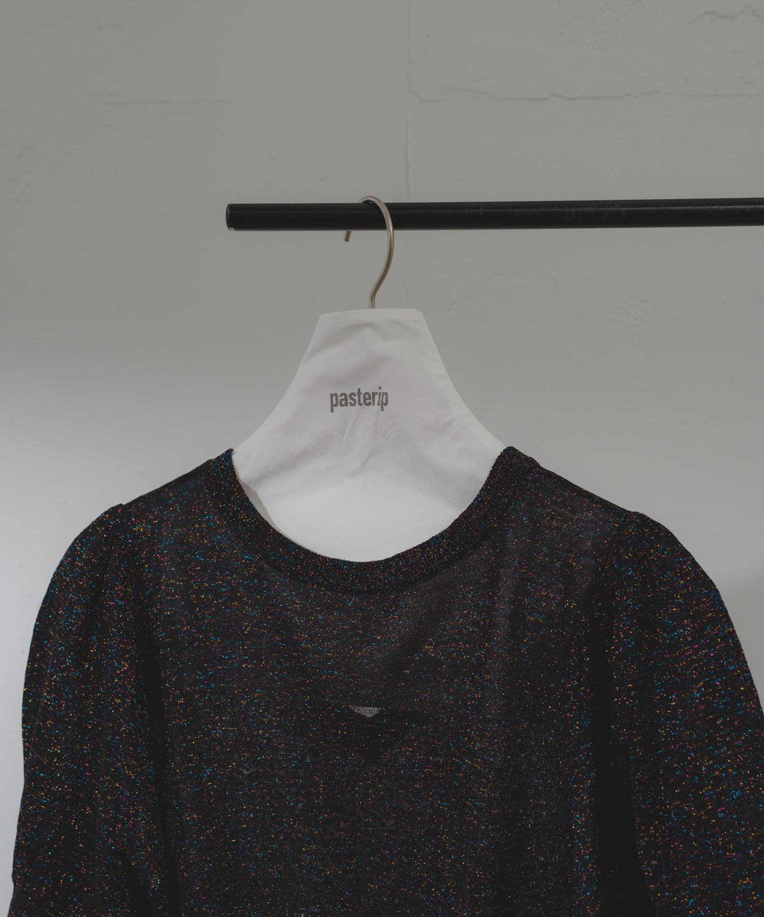 カラーMIXのラメ糸で編み上げている、光が透けて程よくキラキラと輝くシアーニットです。