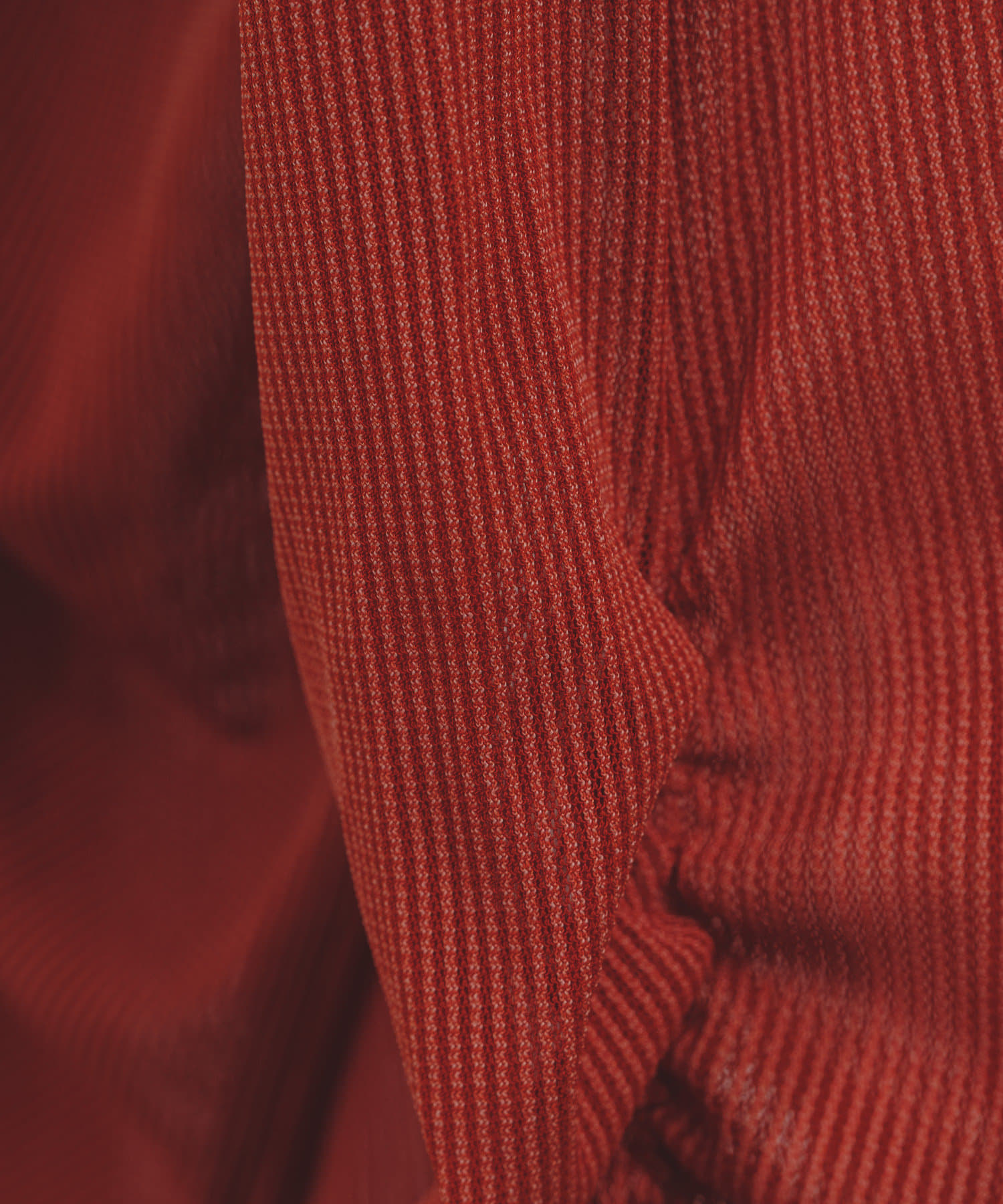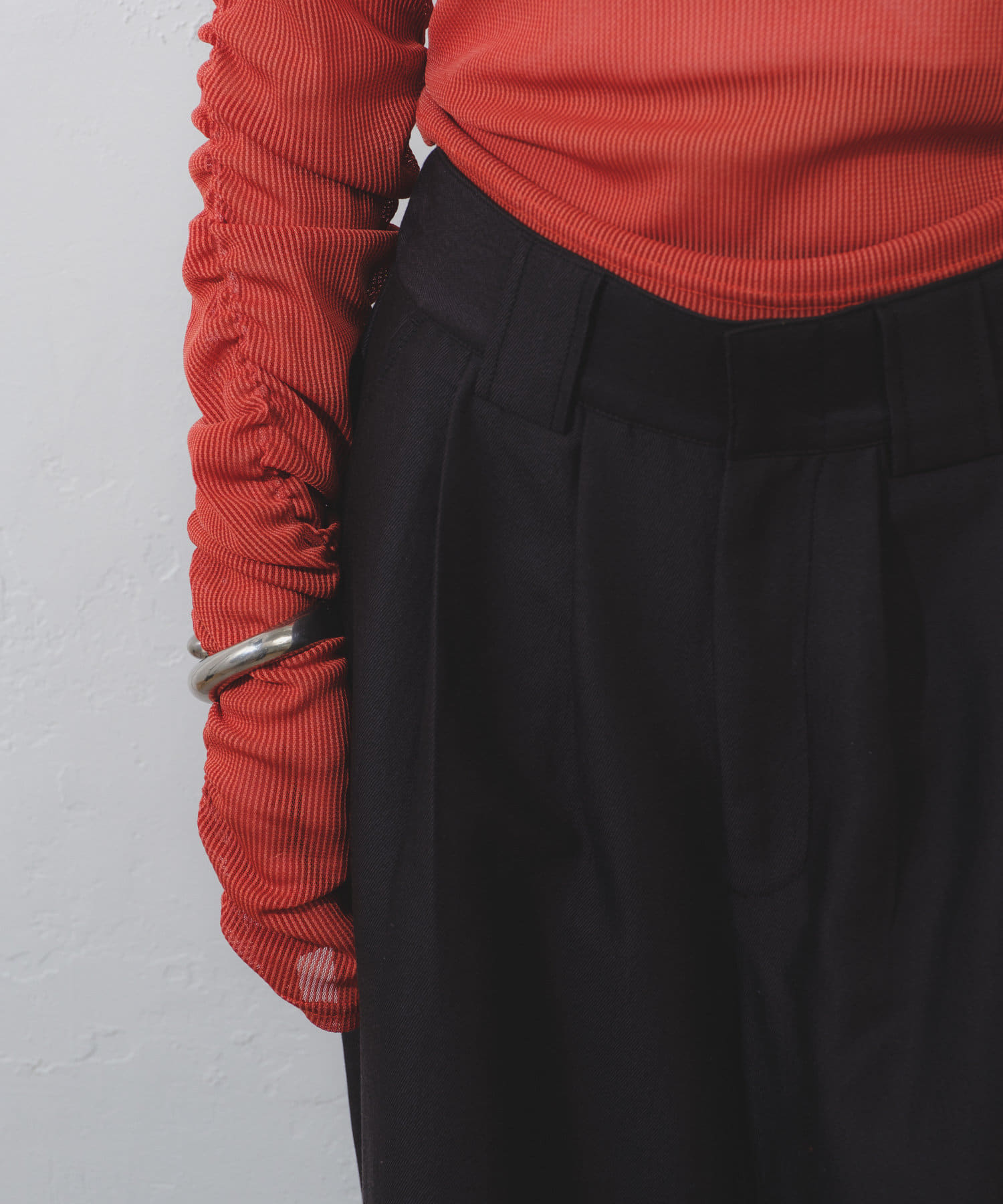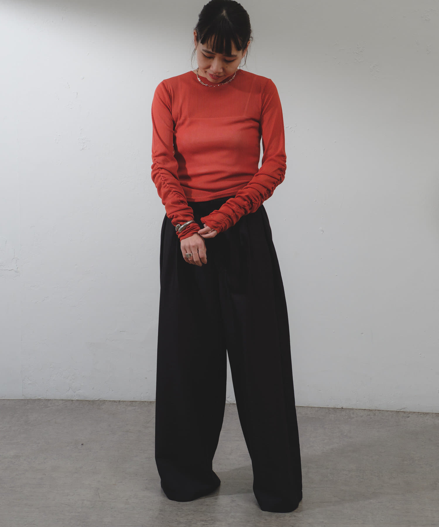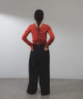 カラーは肌の色を明るく見せるORANGERED/朱赤と、シックで着回し力の高いBLACK/黒 の2色。ワイドパンツやデニム等、春のパンツスタイルに相性が非常に良いです。