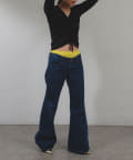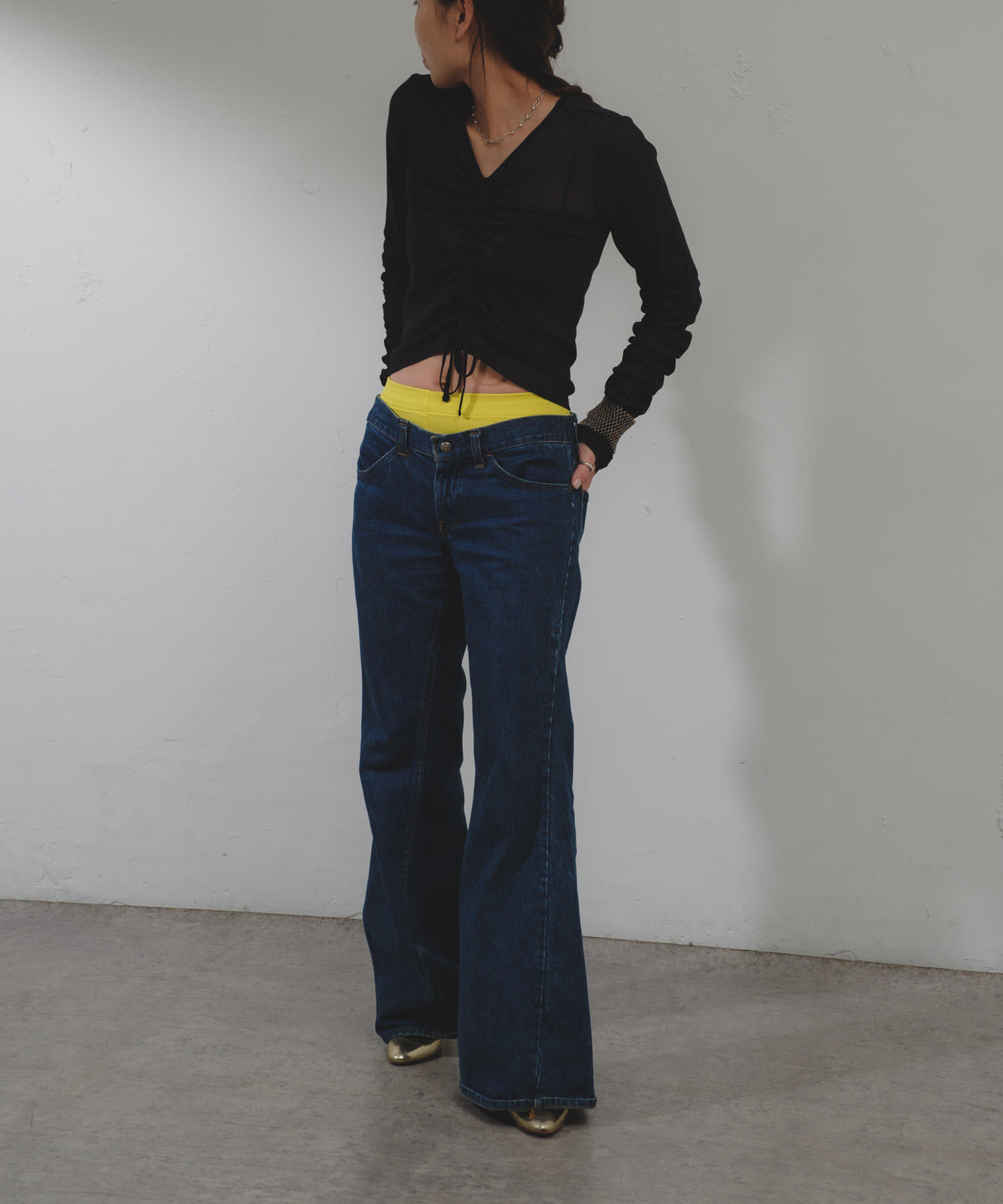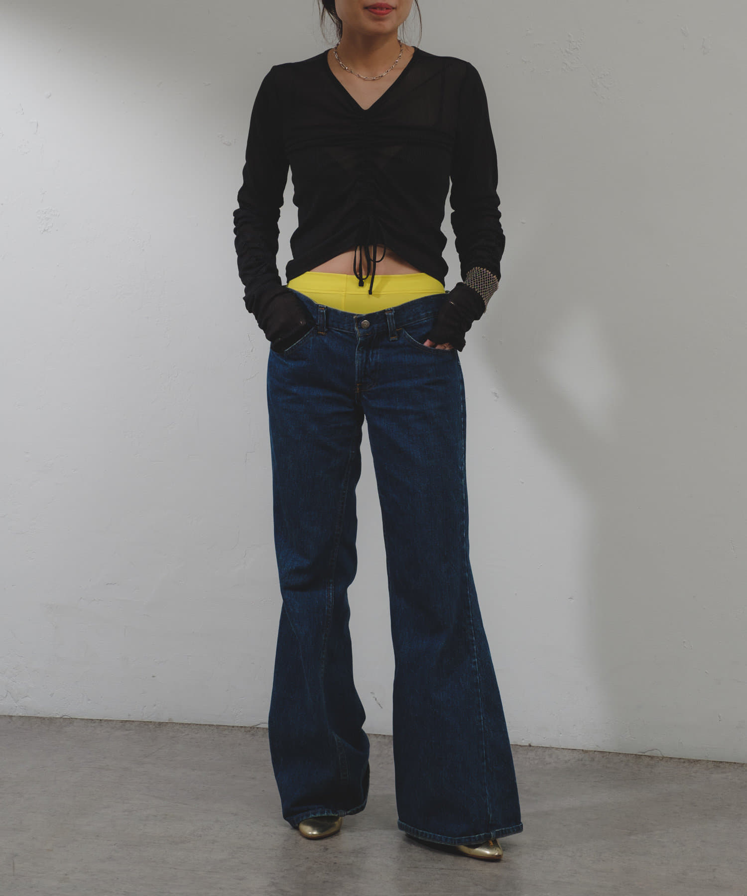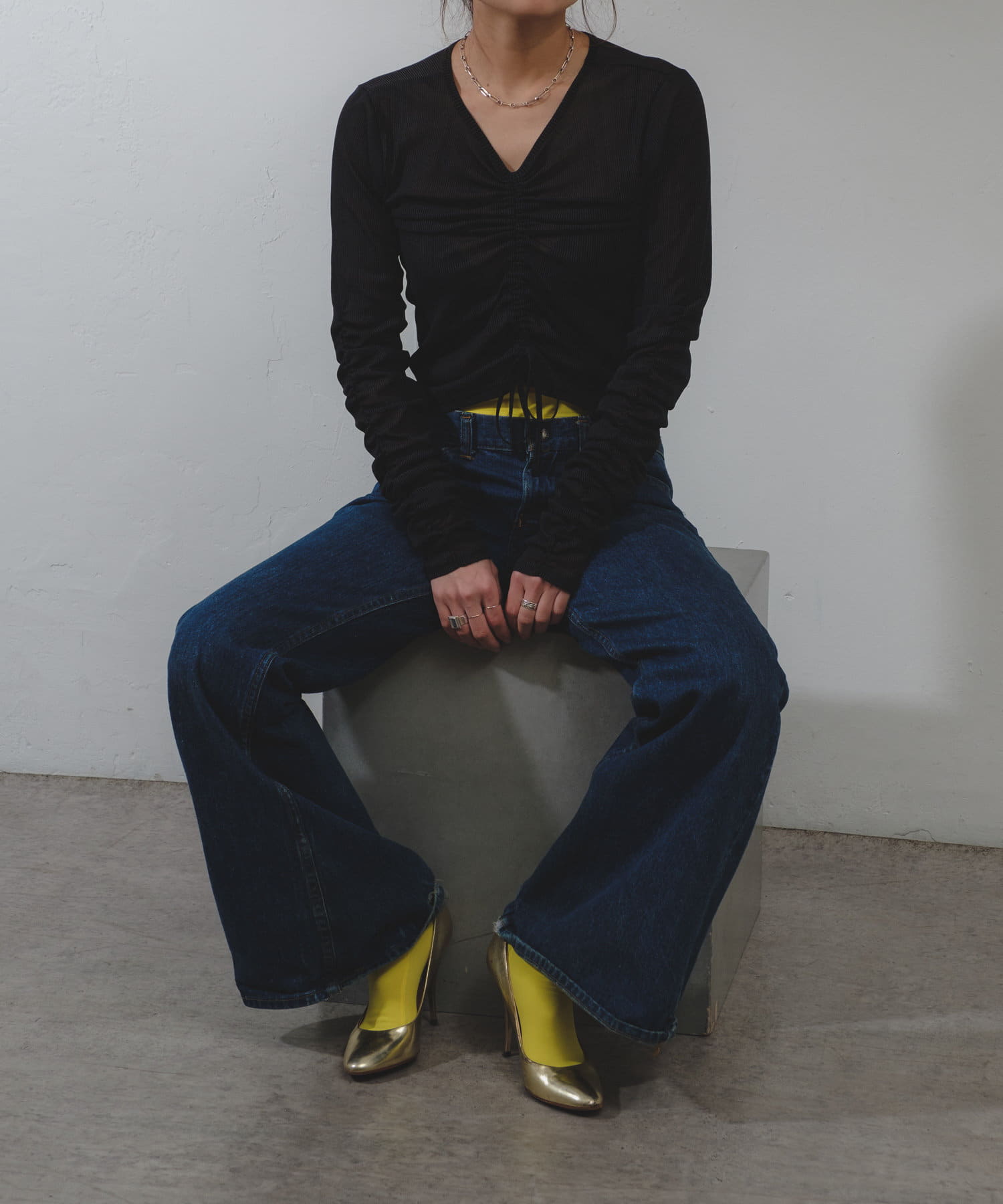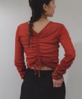 V開きを前に着用した際は、中心の紐でギャザー分量を自分好みに調整することでウエスト中心部分を肌見せすることが出来ます。