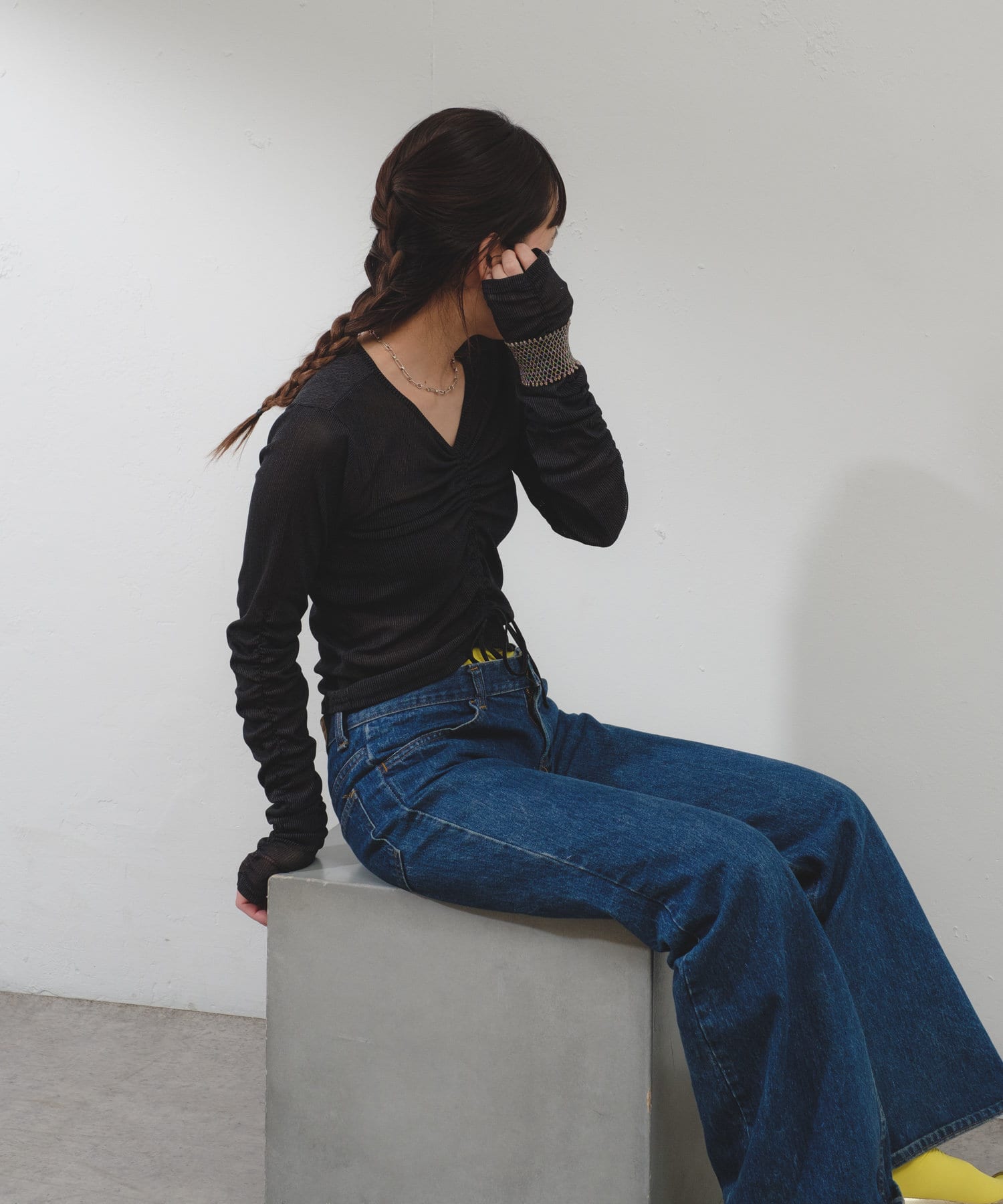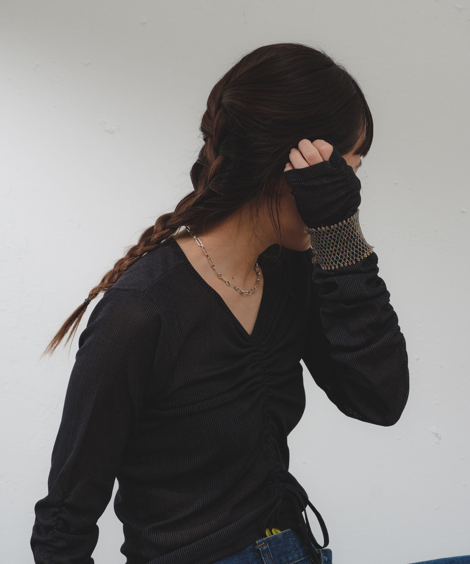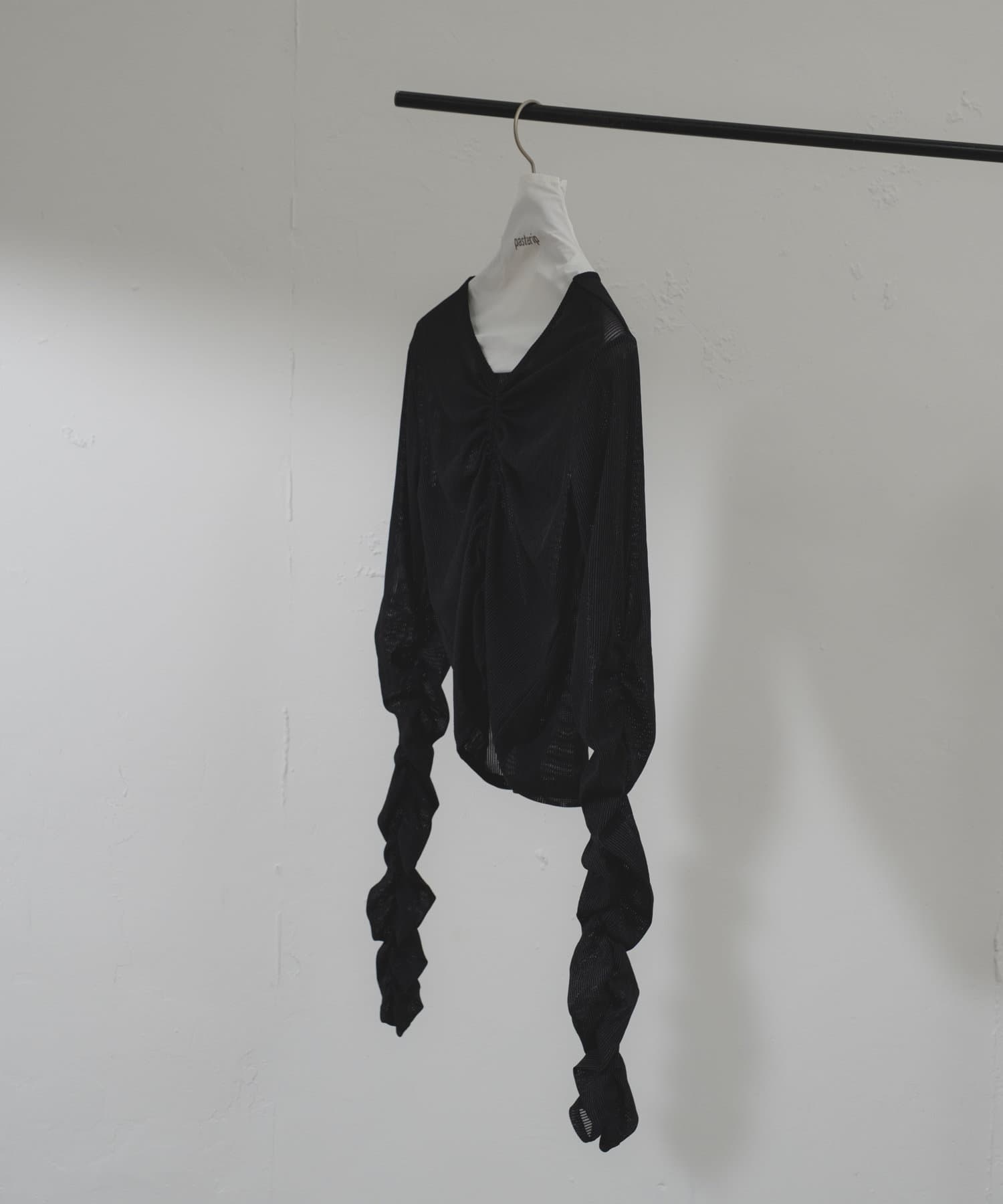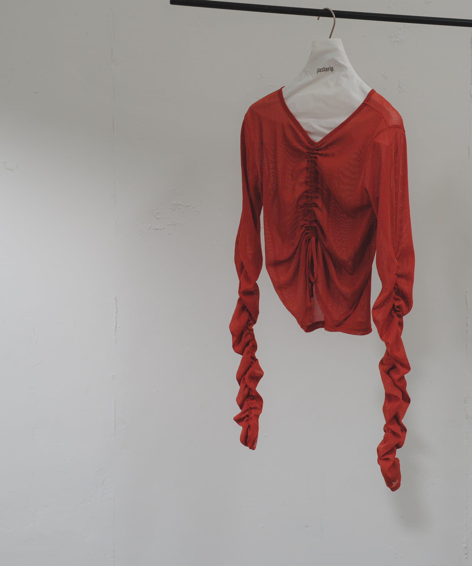 袖元と胸元のシャーリングデザインが目を引く、主役級のシアートップス。前後どちらでも着用が可能です。