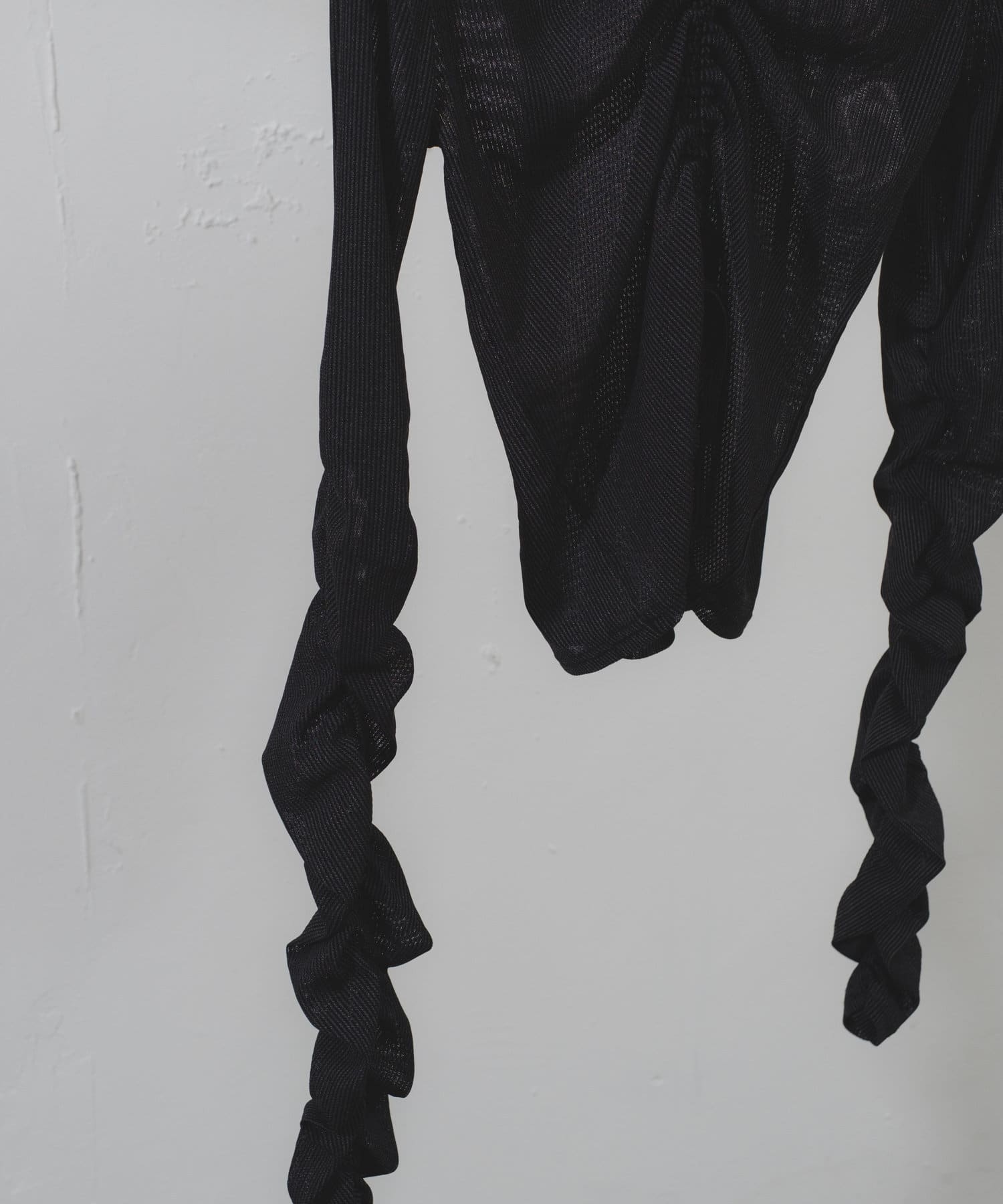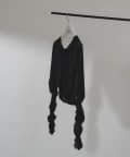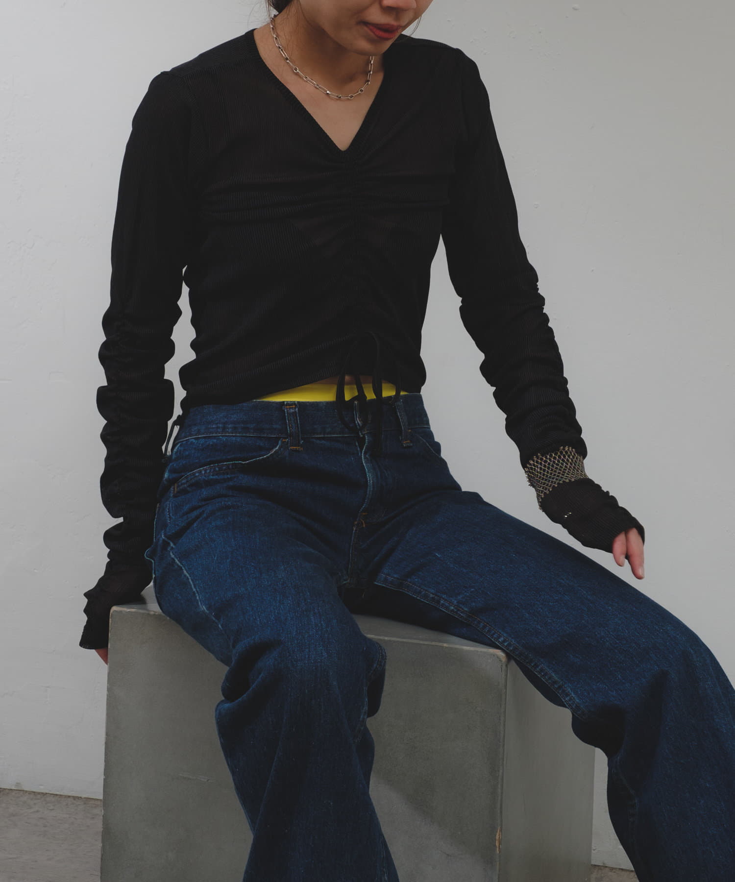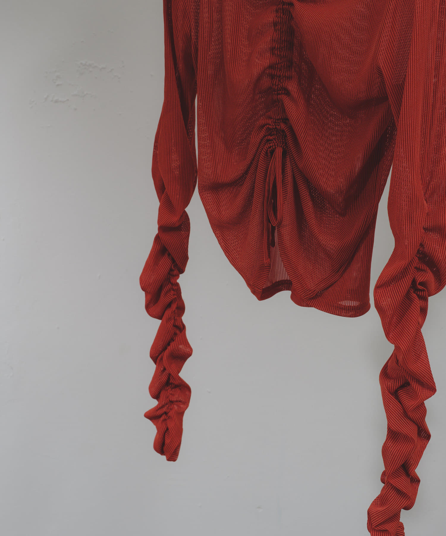 袖元と胸元のシャーリングデザインが目を引く、主役級のシアートップス。前後どちらでも着用が可能です。