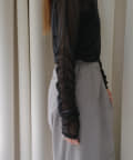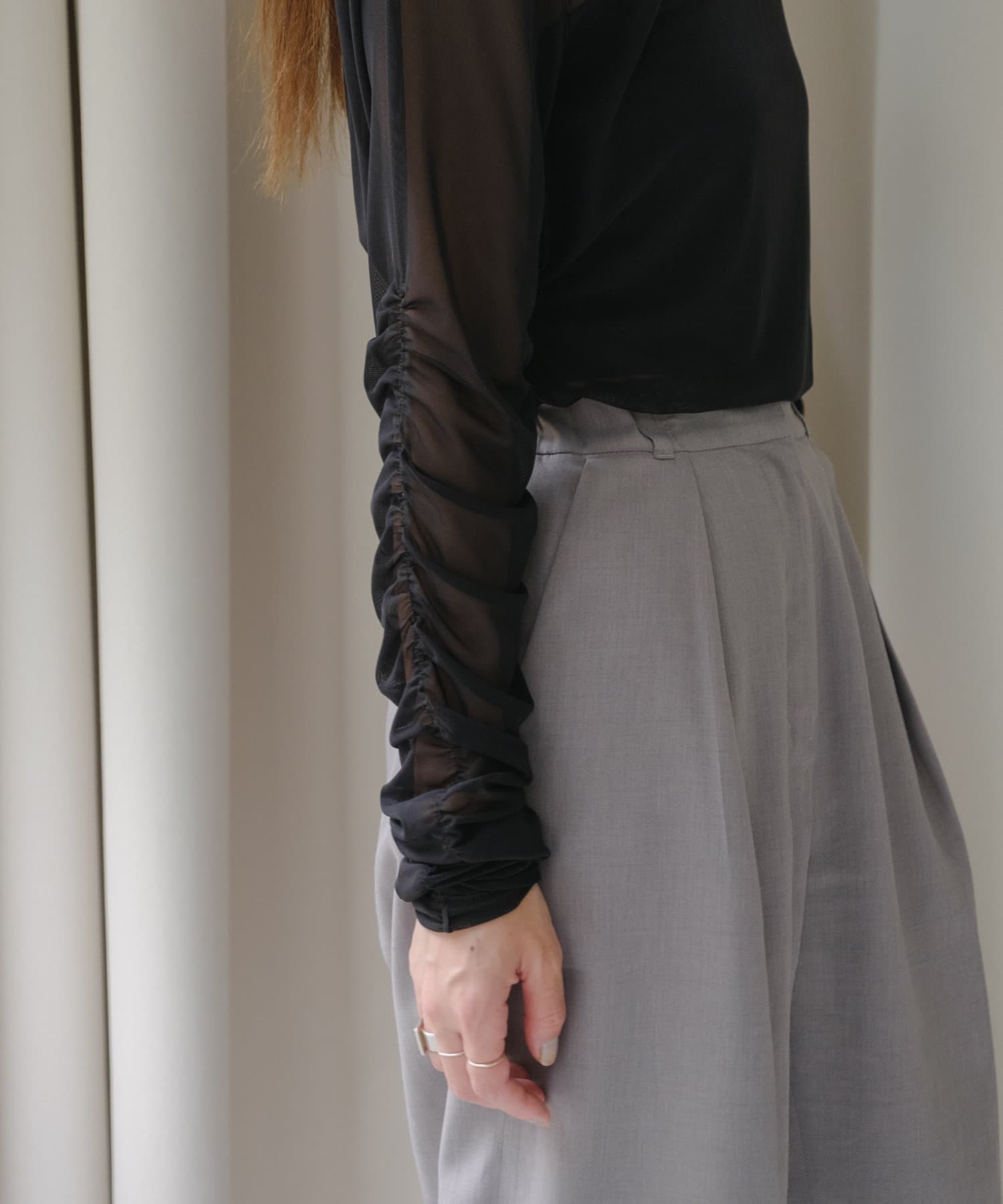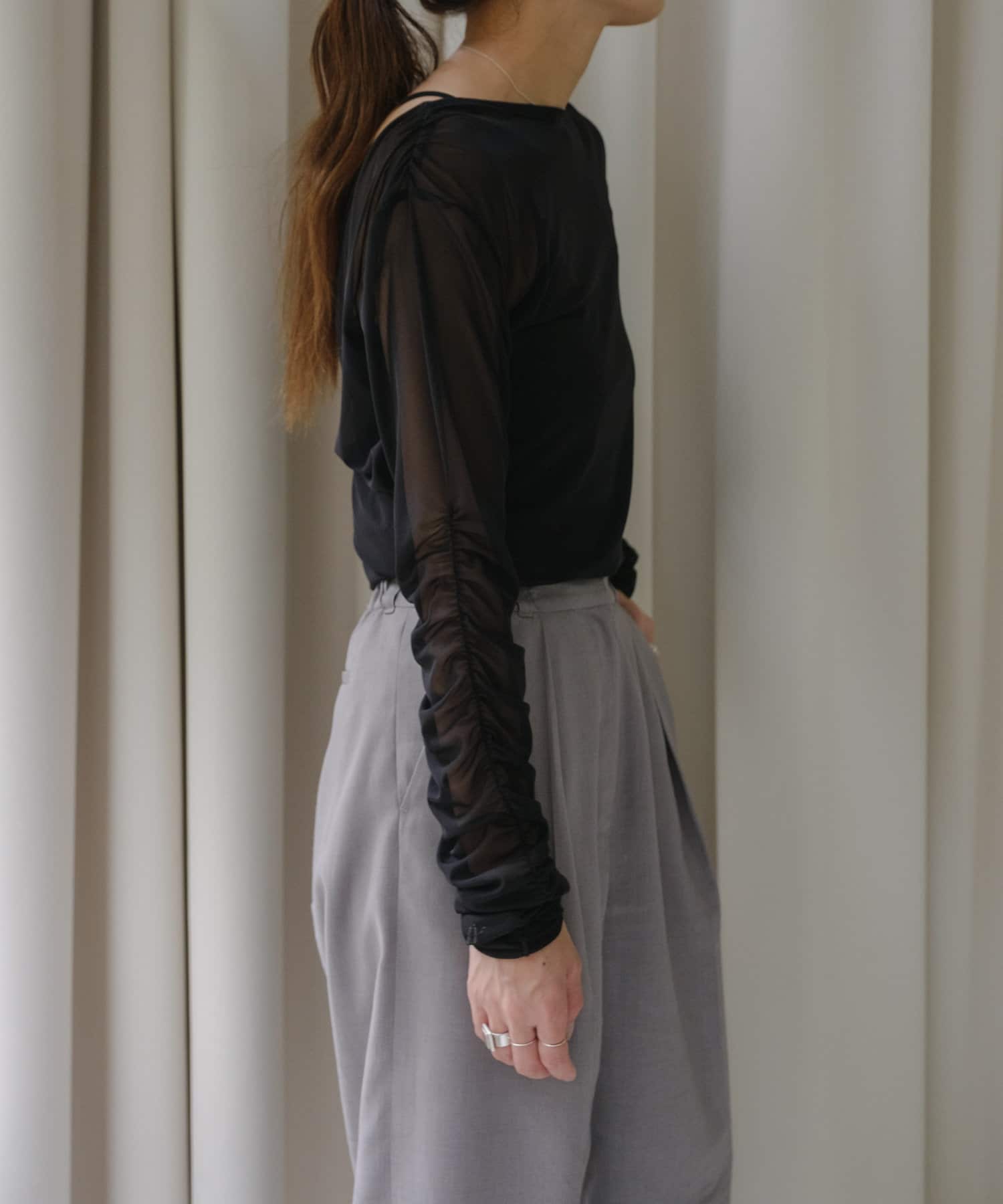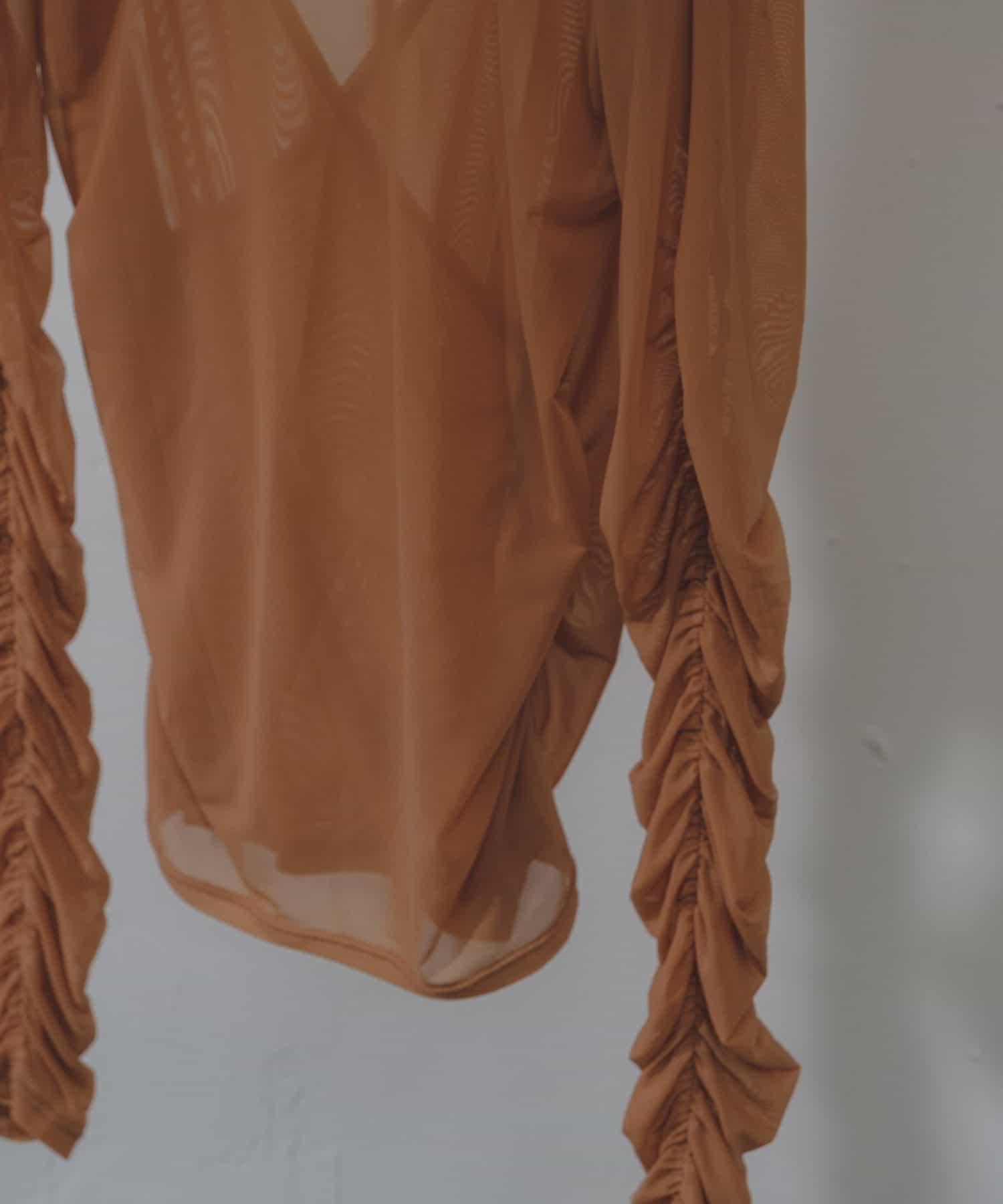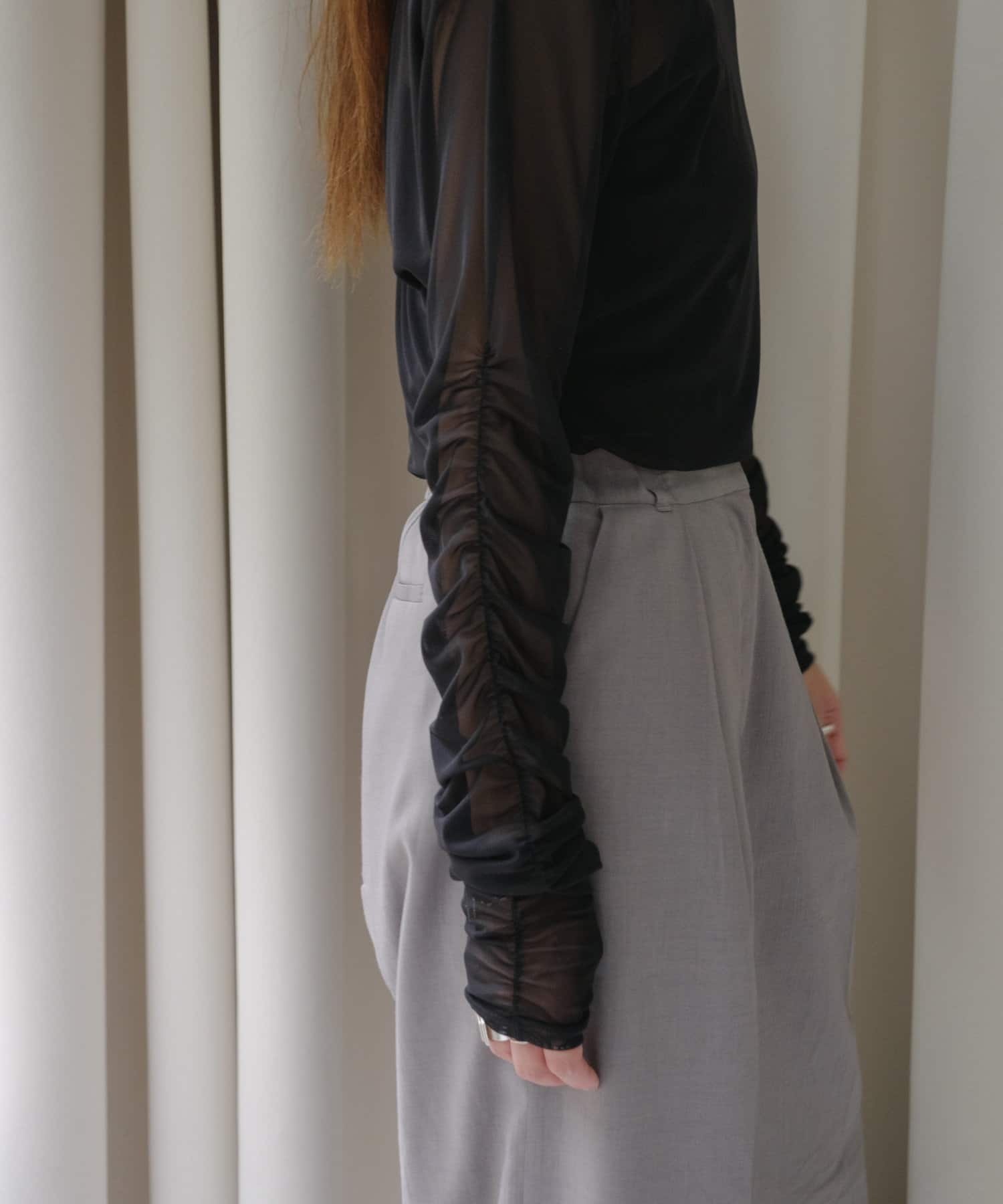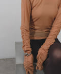 袖口と身頃の両脇にシャーリングデザインを施しており、ギャザーをたっぷりと寄せて、手元や裾がくしゅくしゅと溜まるよう仕上げました。