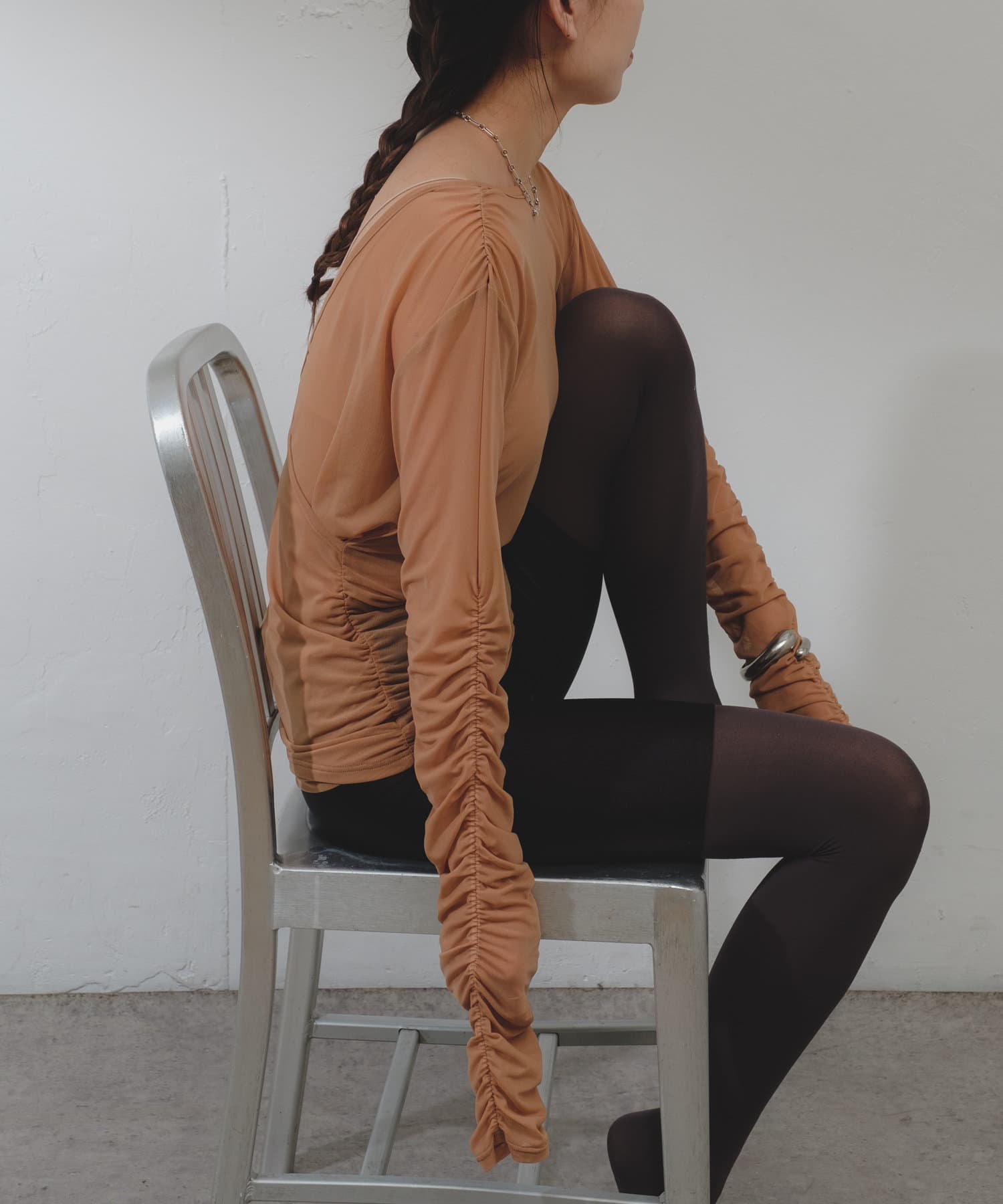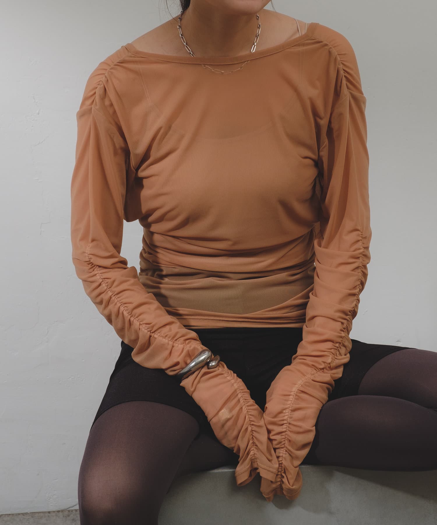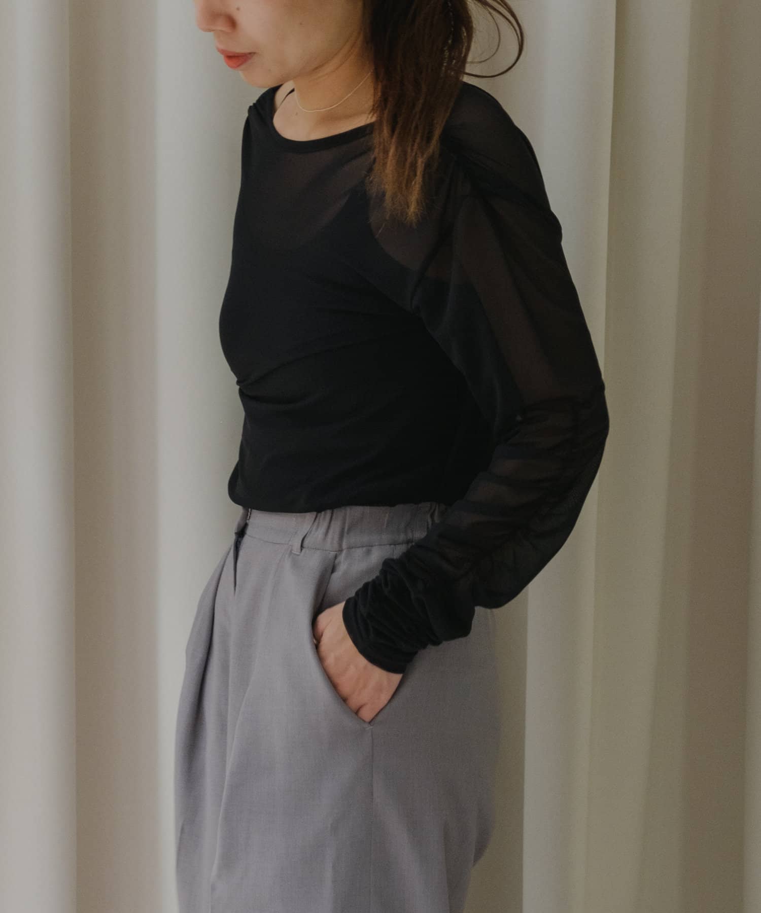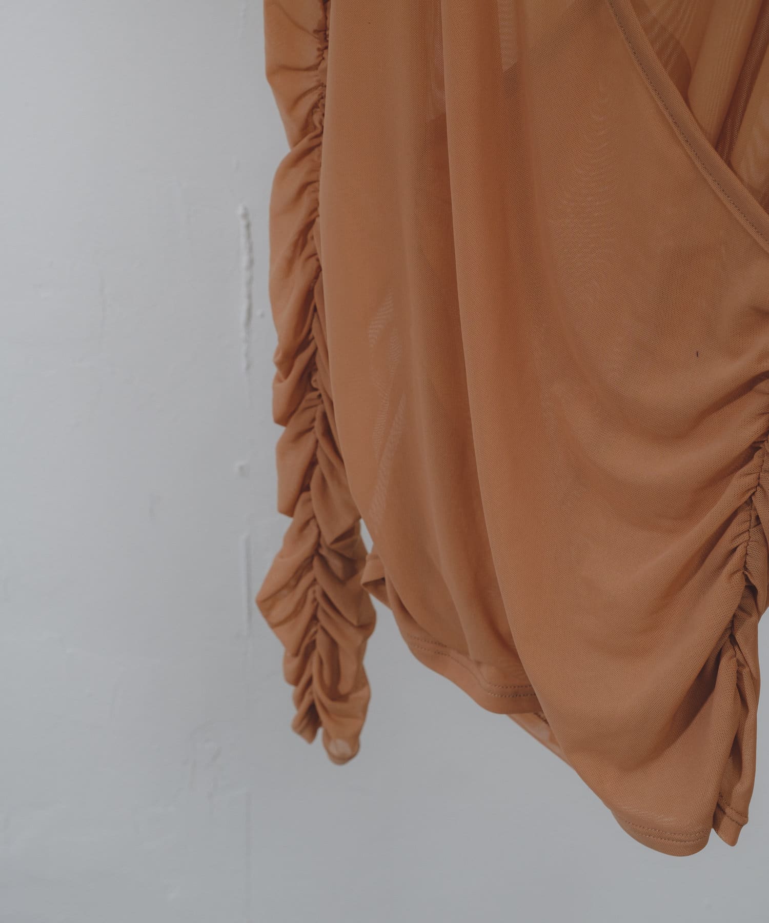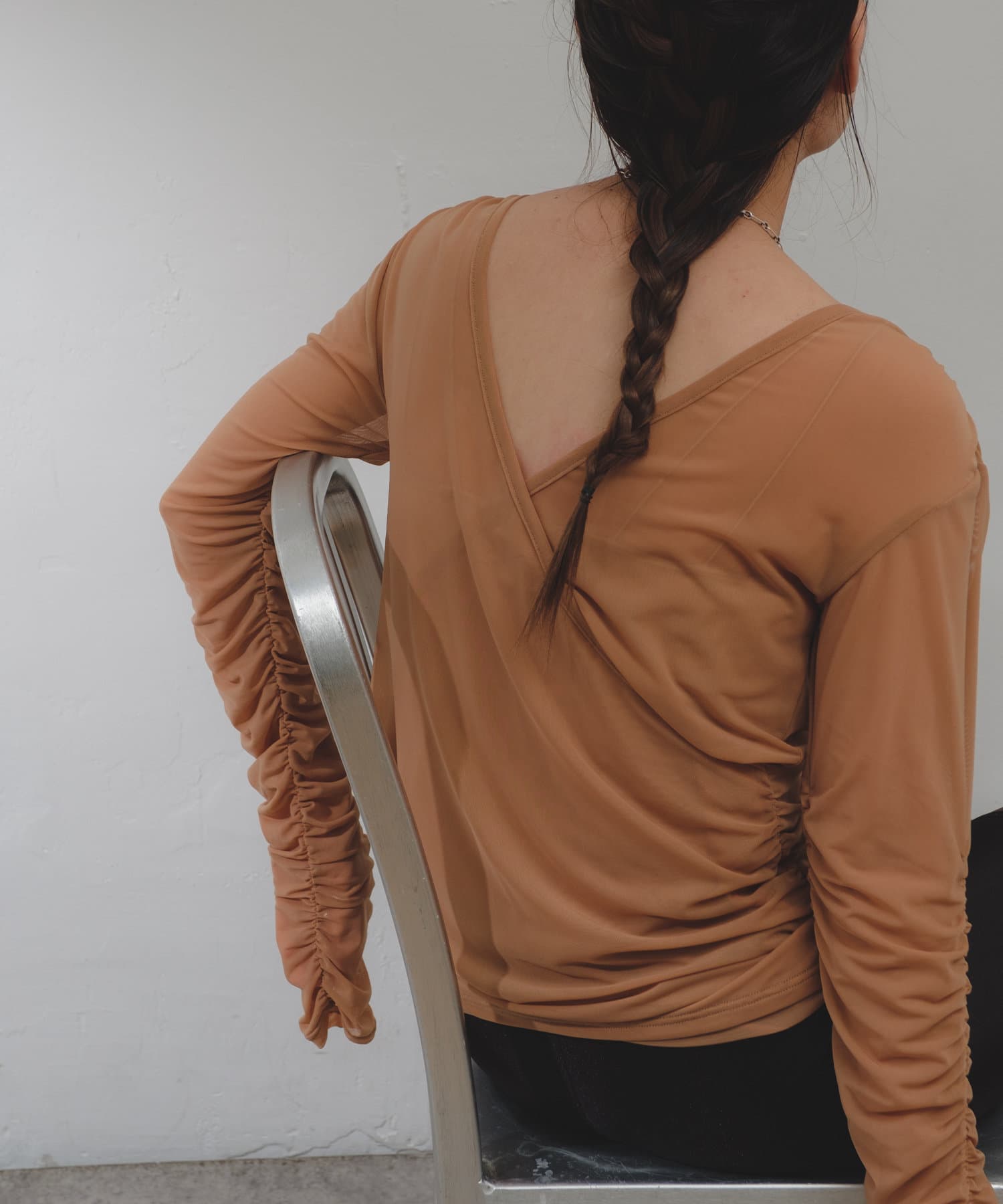 袖口と身頃の両脇にシャーリングデザインを施しており、ギャザーをたっぷりと寄せて、手元や裾がくしゅくしゅと溜まるよう仕上げました。