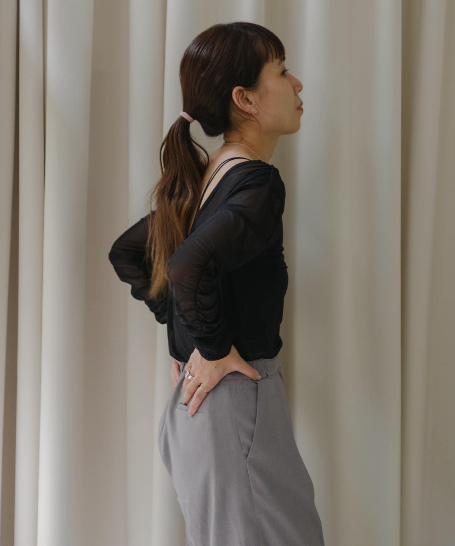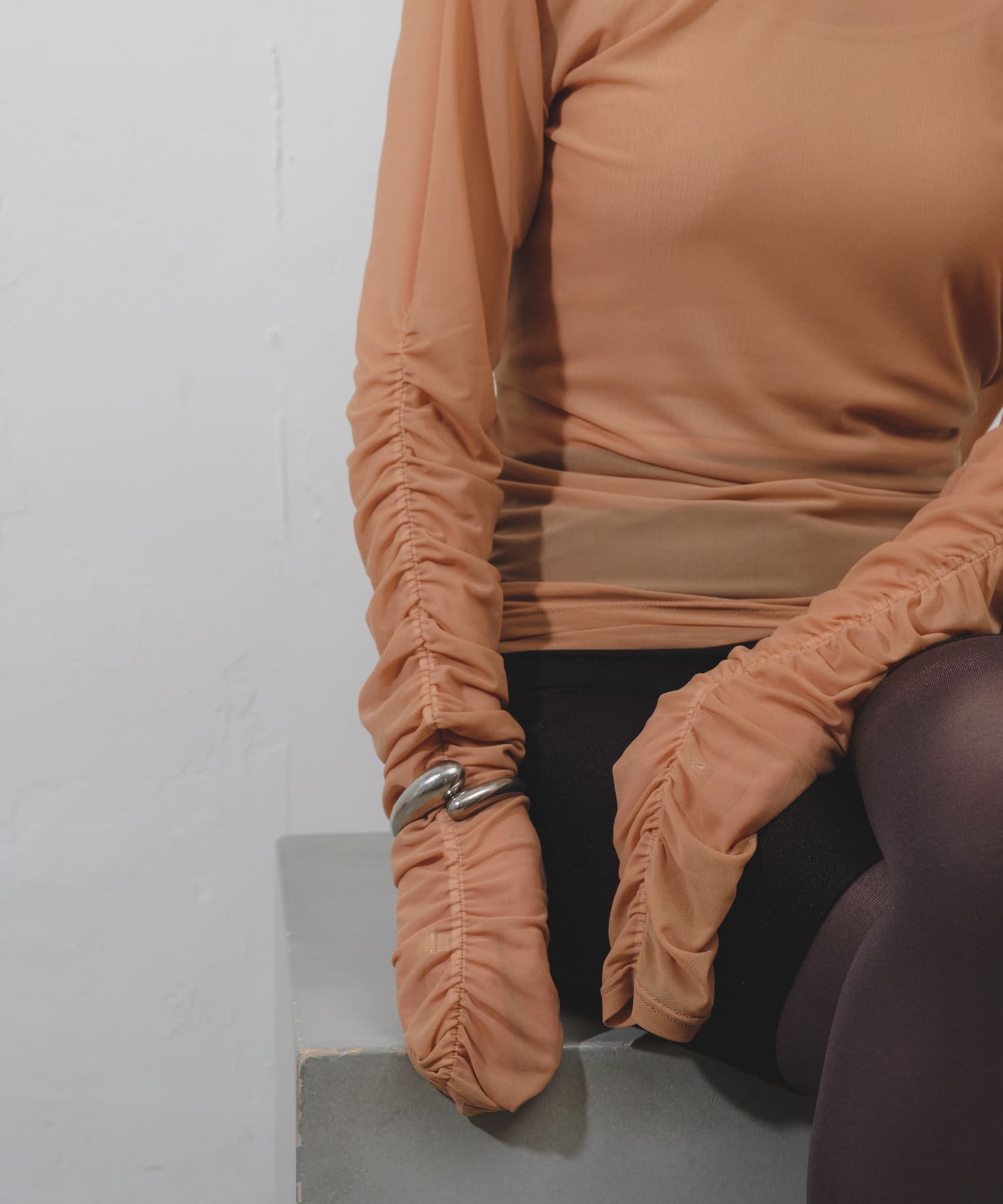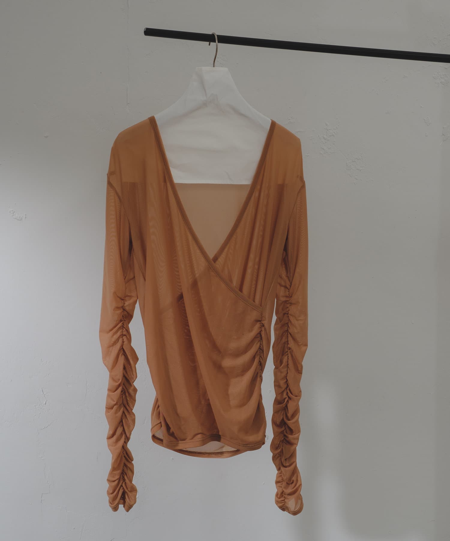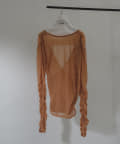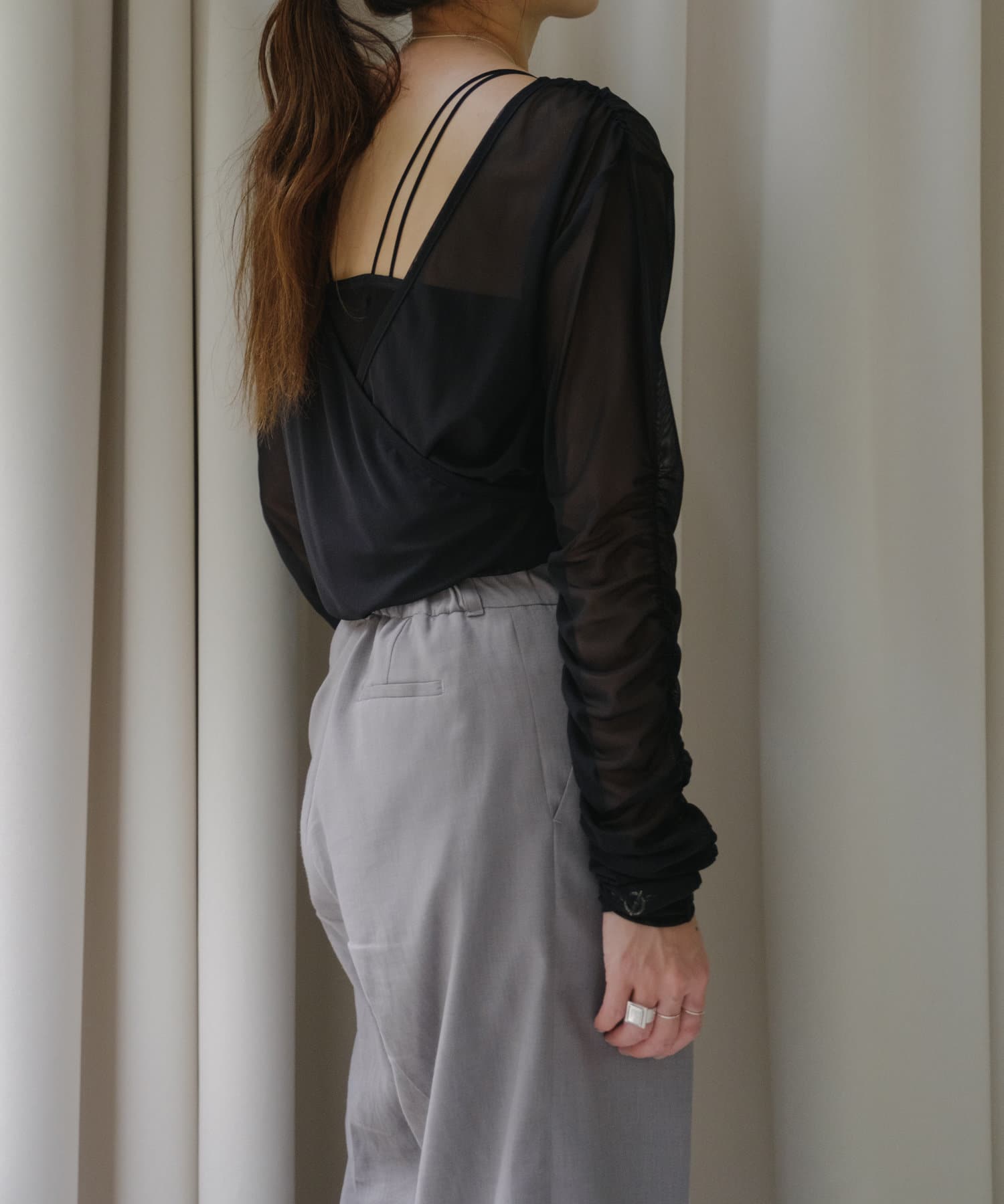 袖口と身頃の両脇にシャーリングデザインを施しており、ギャザーをたっぷりと寄せて、手元や裾がくしゅくしゅと溜まるよう仕上げました。