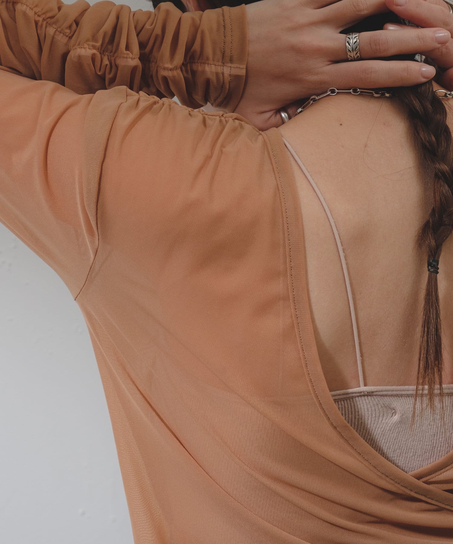 使用した素材はきめ細かで肌触りが良く、非常に伸び感のある柔らかいナイロンチュール。優しいフィット感があり、ボディラインを美しく