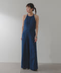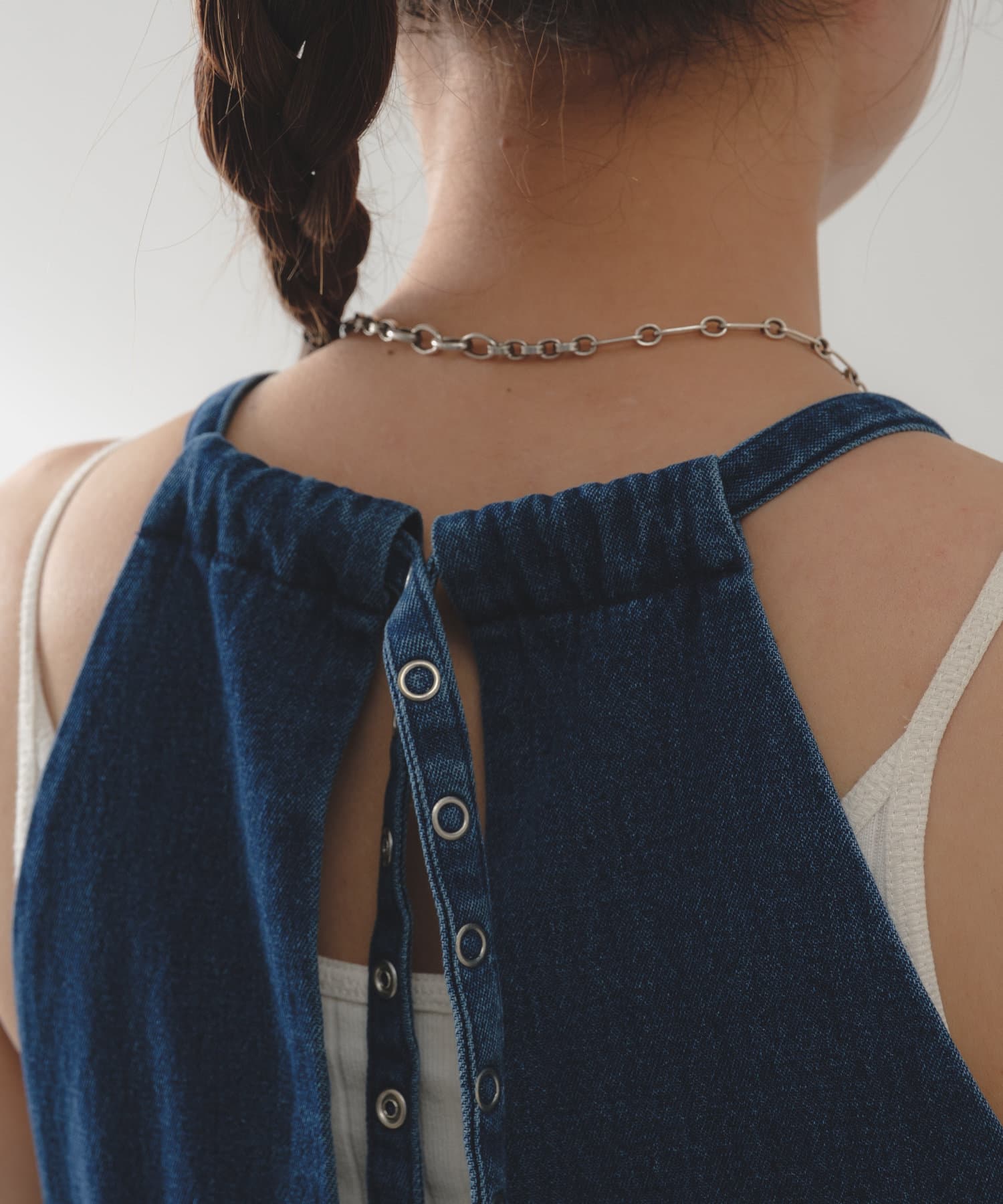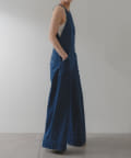 背中には大きくスリット開きを作り、バックスタイルを美しく見せてくれる仕様です。ホルターネックは後ろのスナップボタンで紐の長さが調整可能。身長に合わせてお好みの長さで着用いただけます。