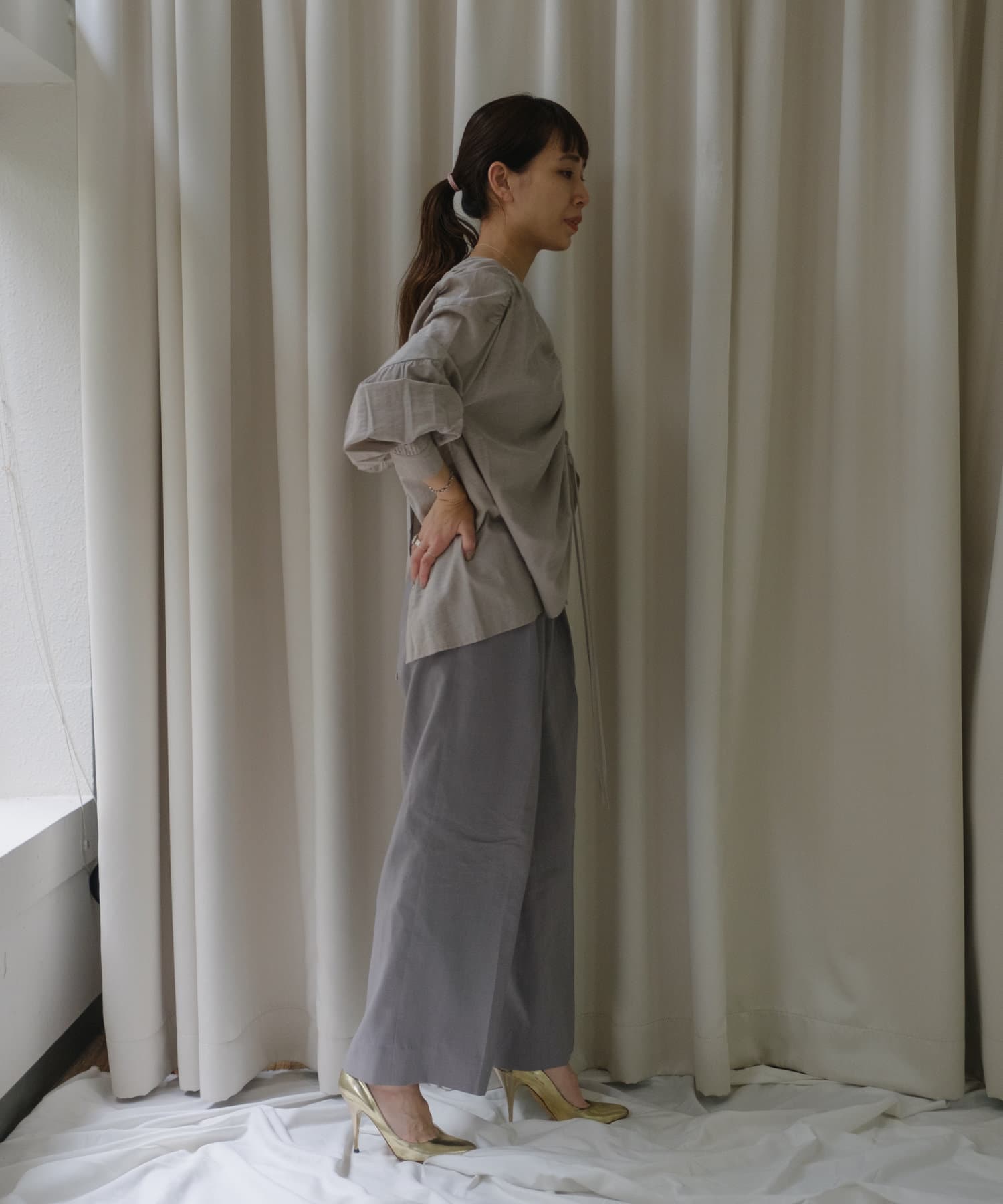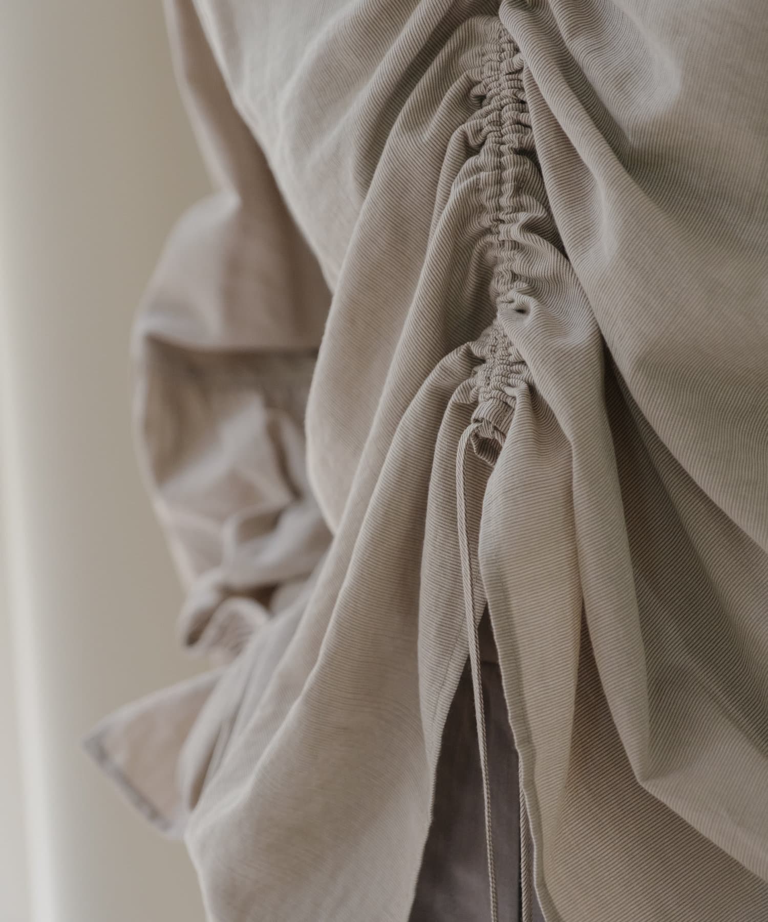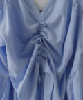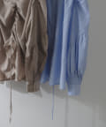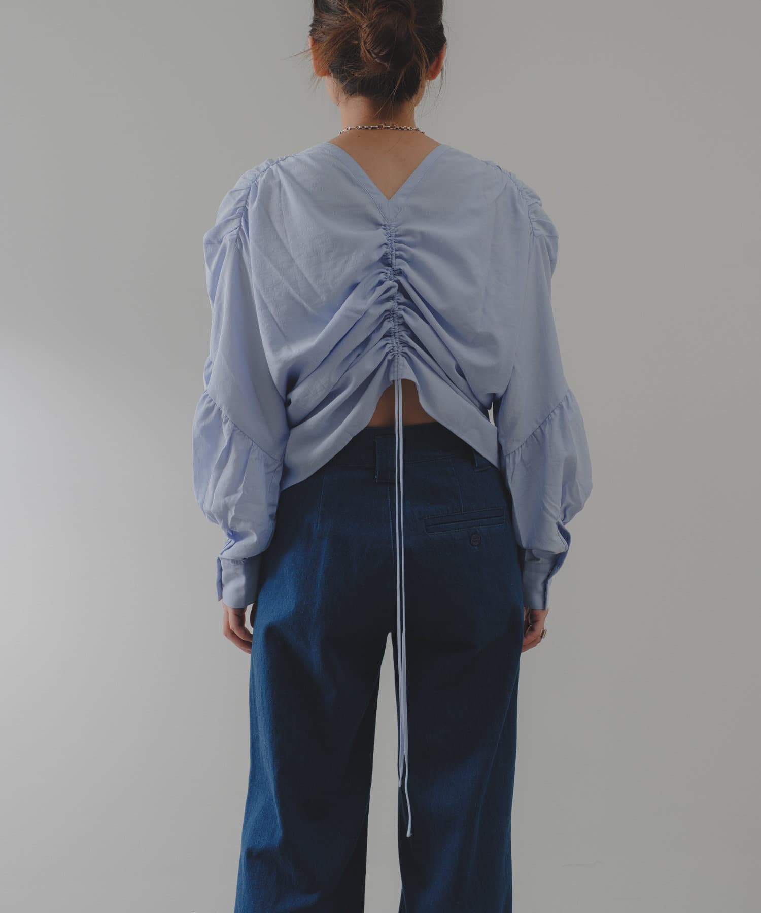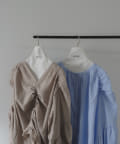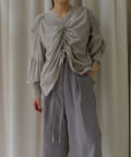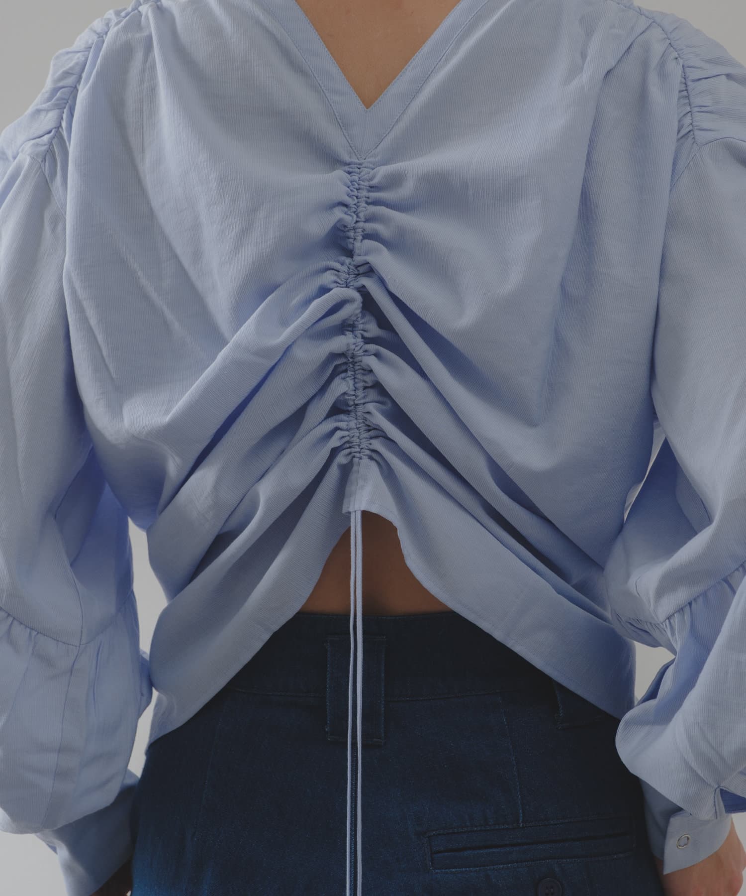 前後どちらでも着用が可能。シャーリングの入っている身頃は、中心の細紐でギャザーを寄せられ、自分好みの位置まで裾を持ち上げてウエスト又は背中を見せて着用いただけます。