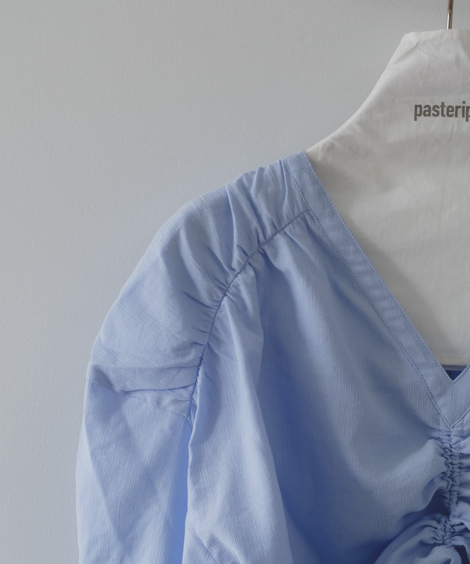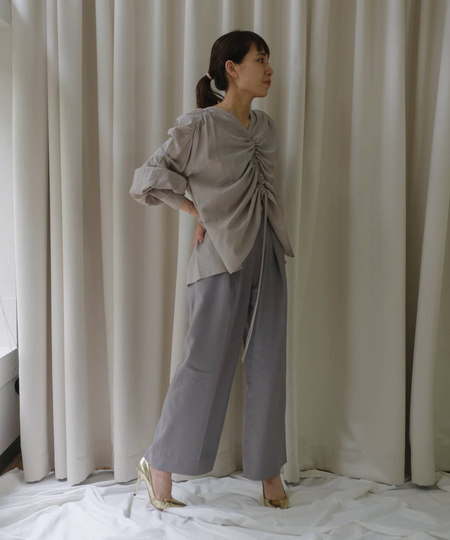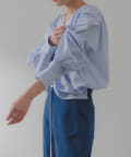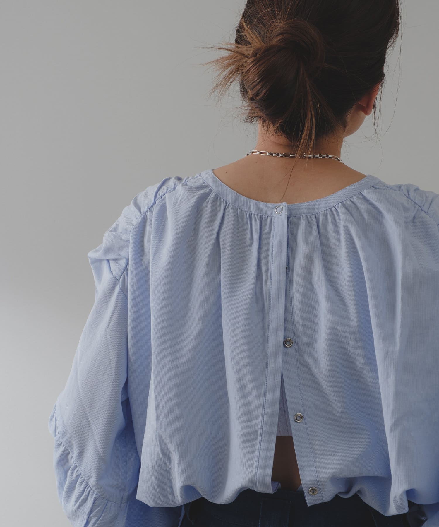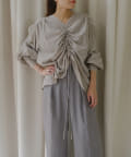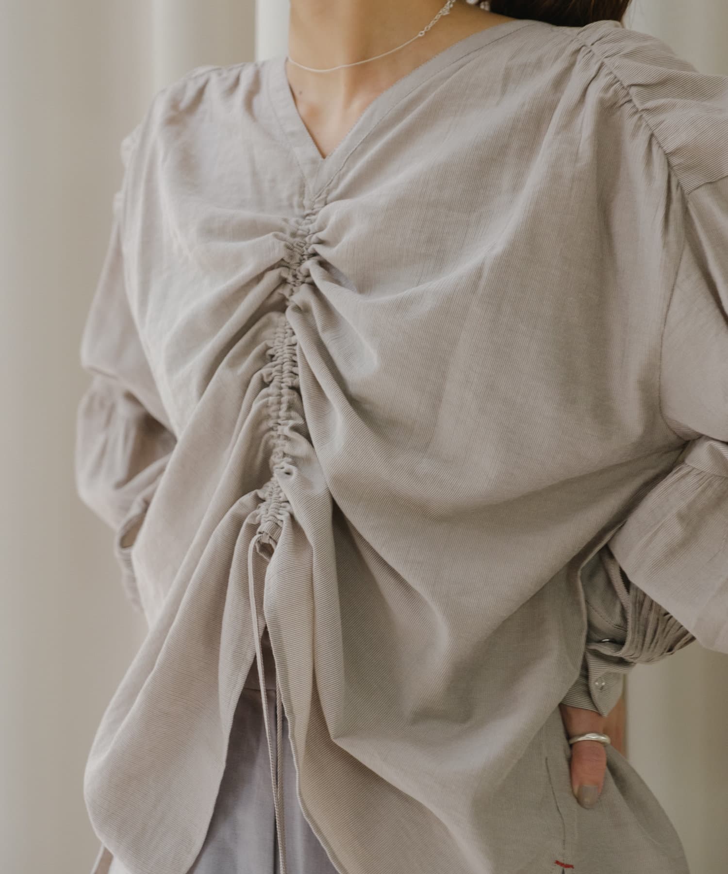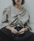 前後どちらでも着用が可能。シャーリングの入っている身頃は、中心の細紐でギャザーを寄せられ、自分好みの位置まで裾を持ち上げてウエスト又は背中を見せて着用いただけます。