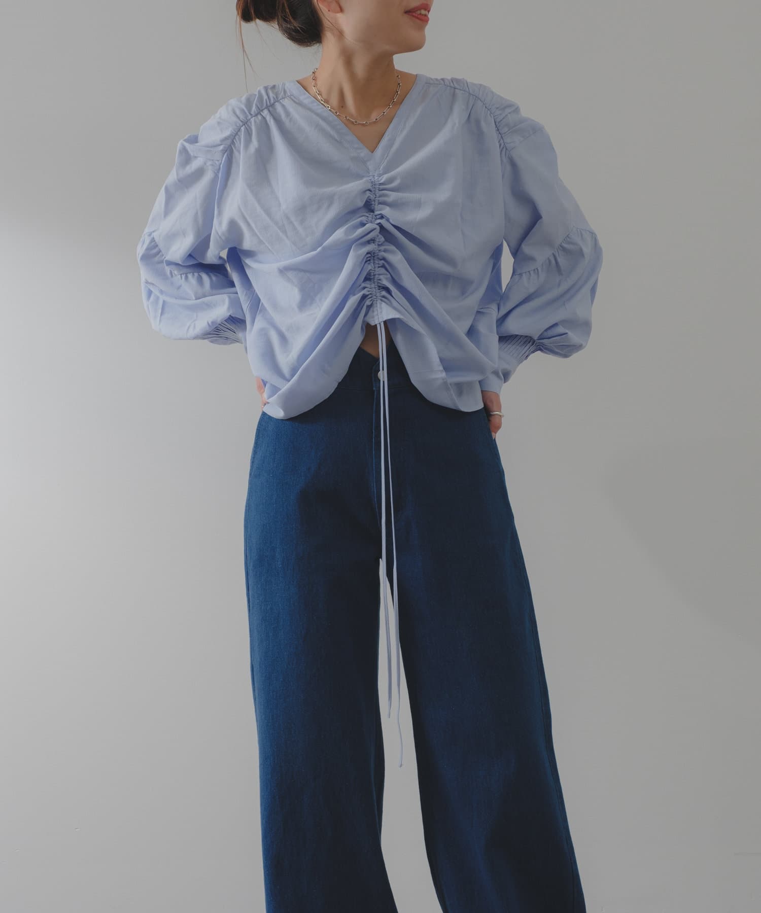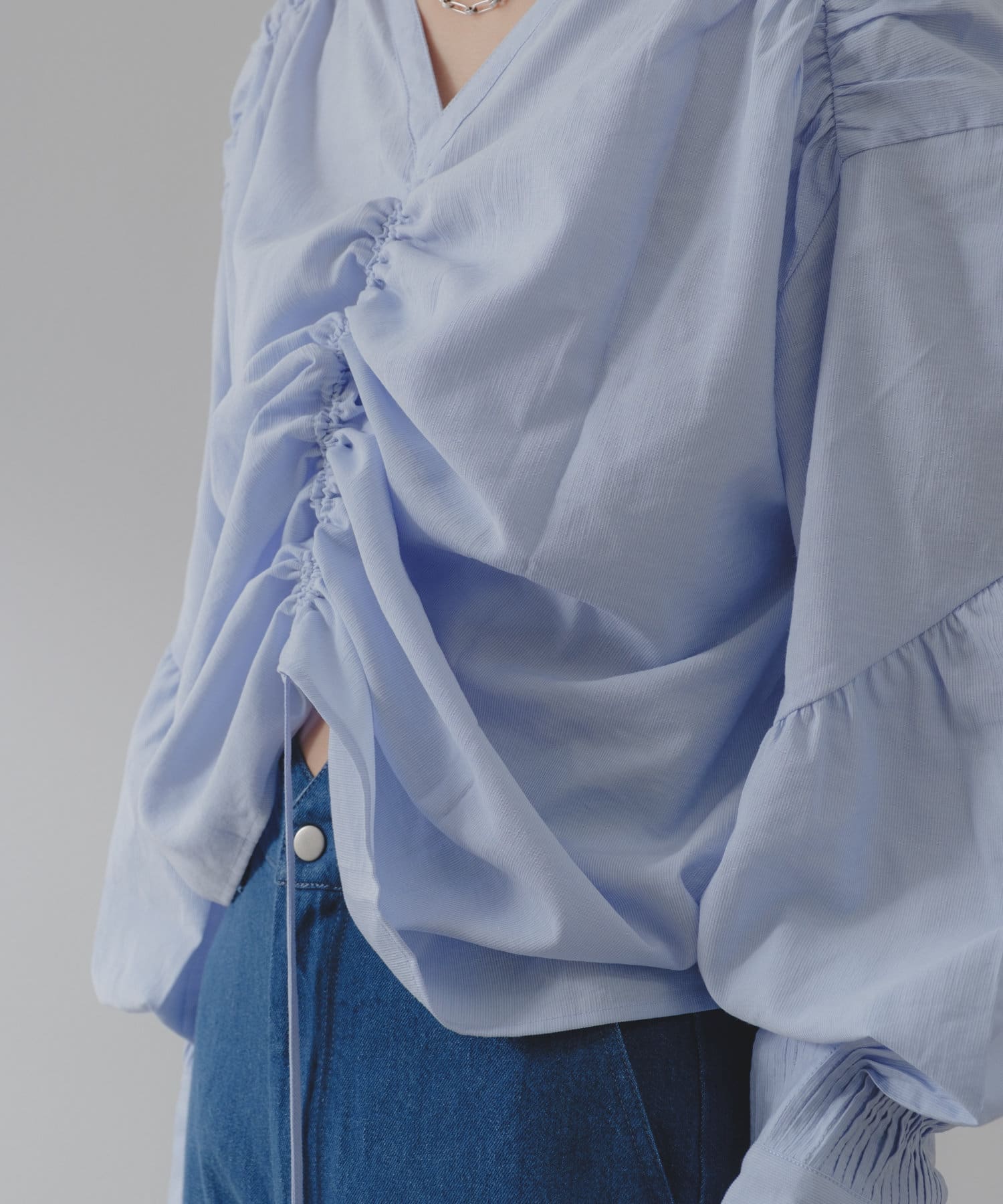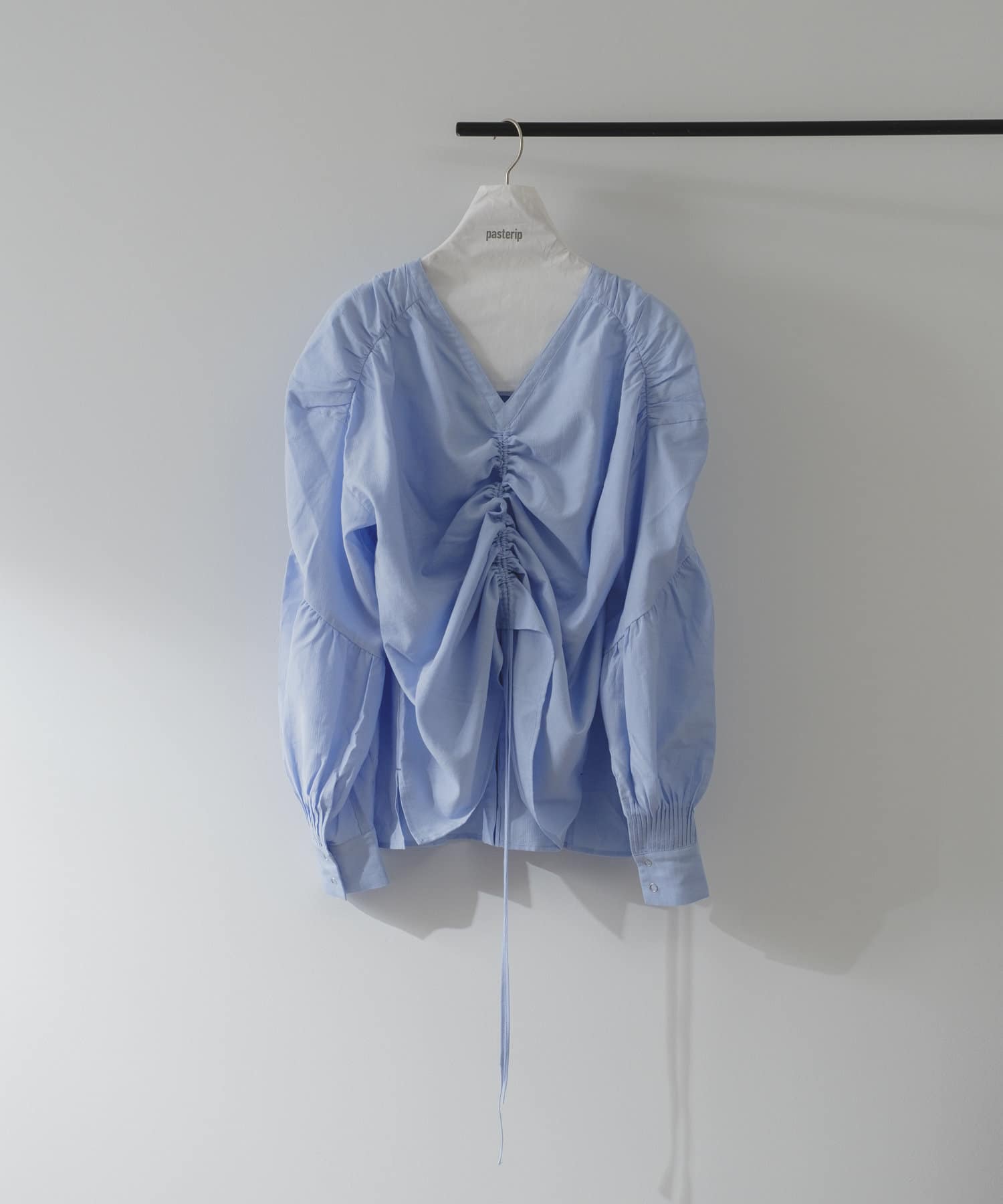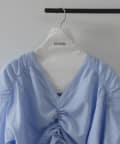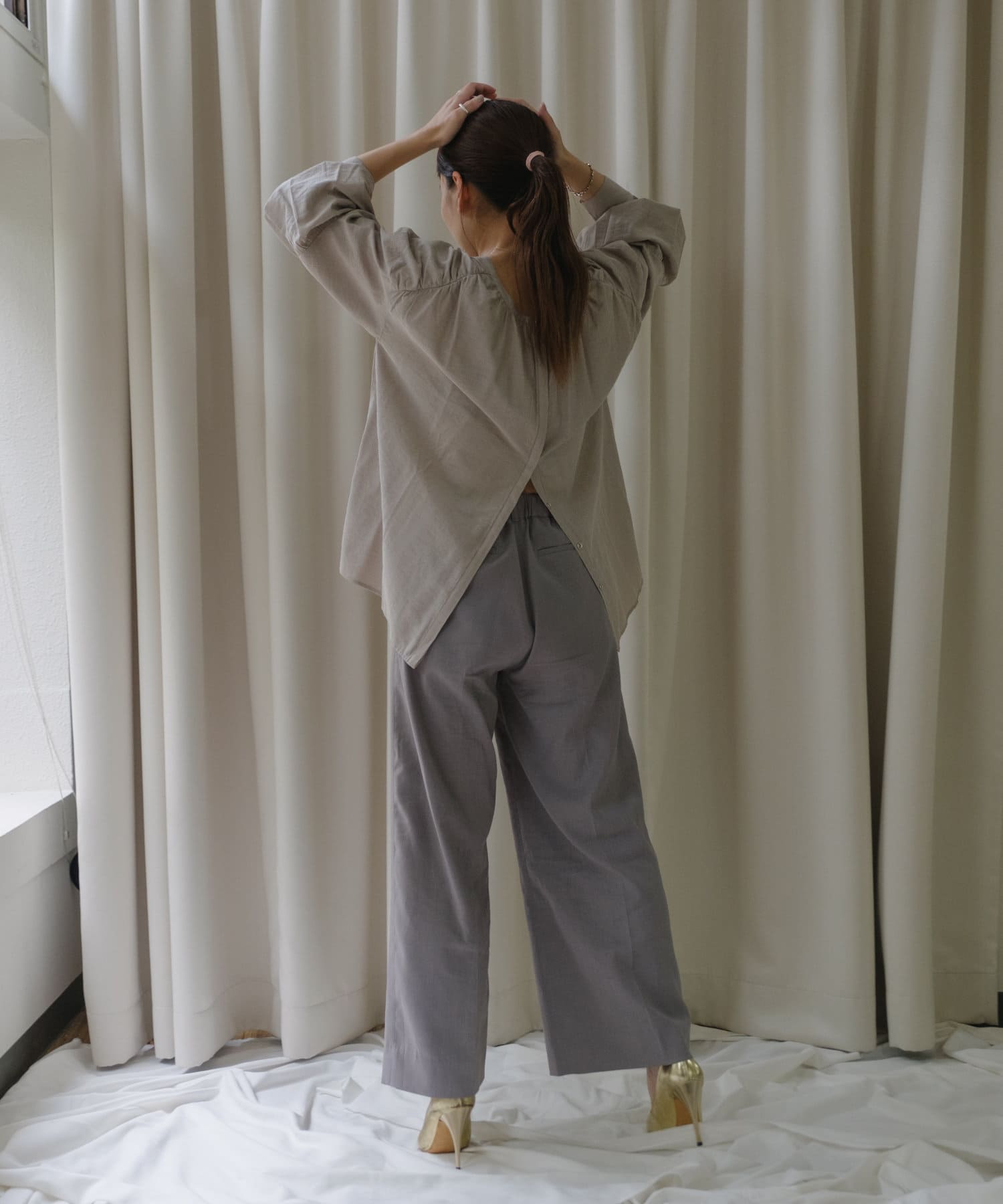 前後どちらでも着用が可能。シャーリングの入っている身頃は、中心の細紐でギャザーを寄せられ、自分好みの位置まで裾を持ち上げてウエスト又は背中を見せて着用いただけます。