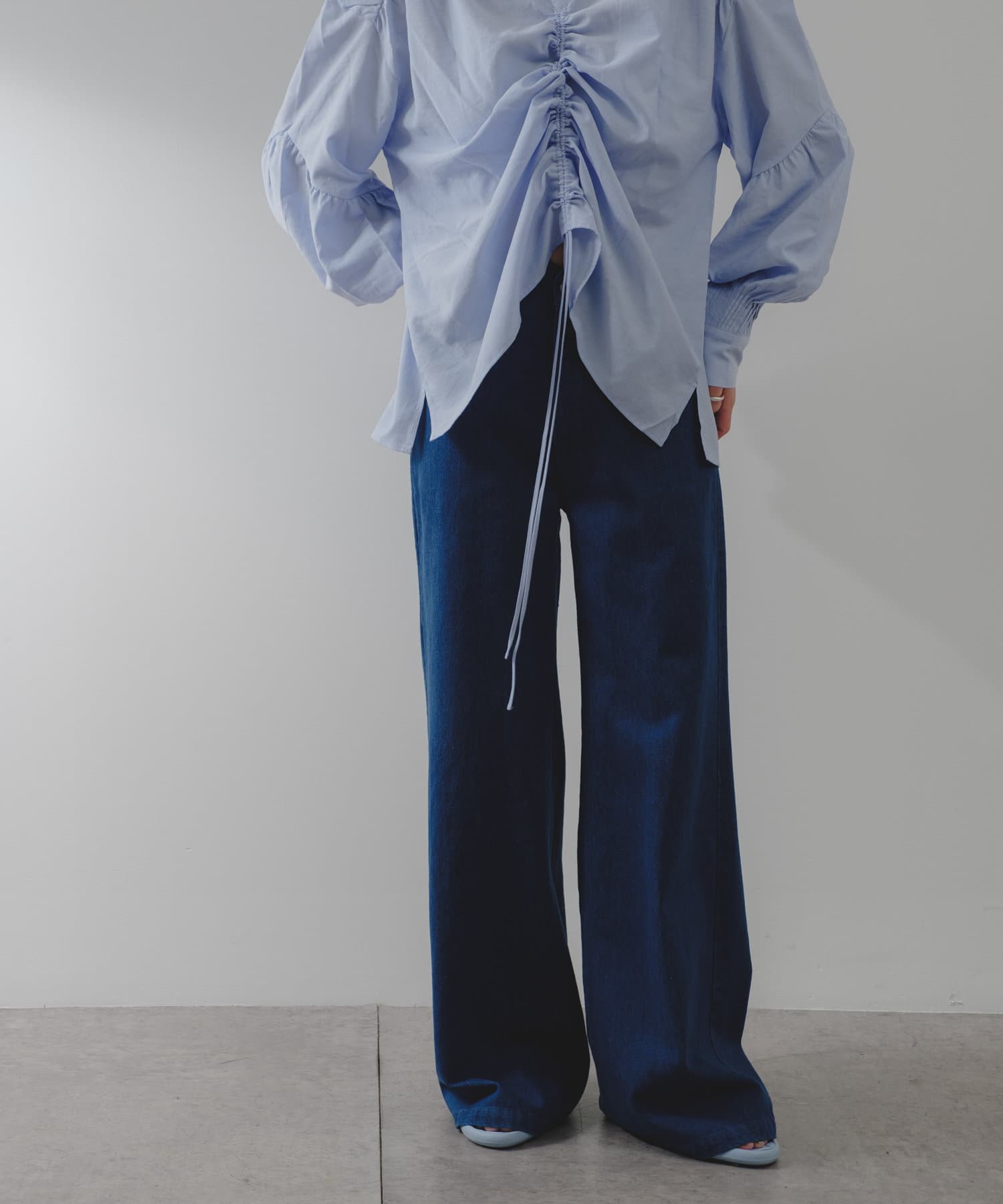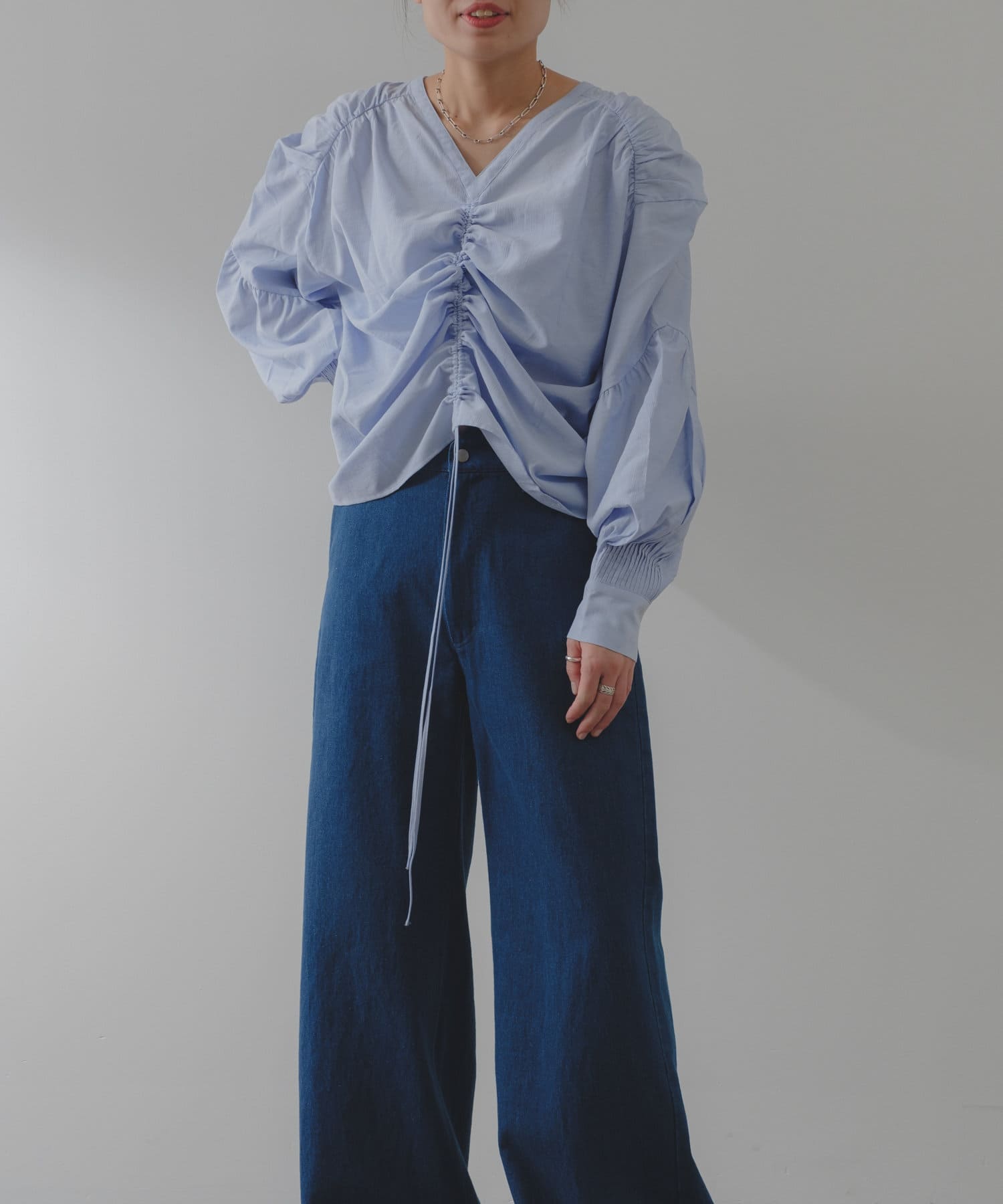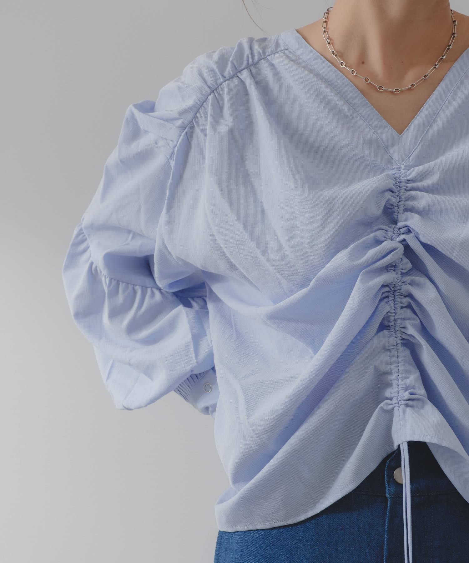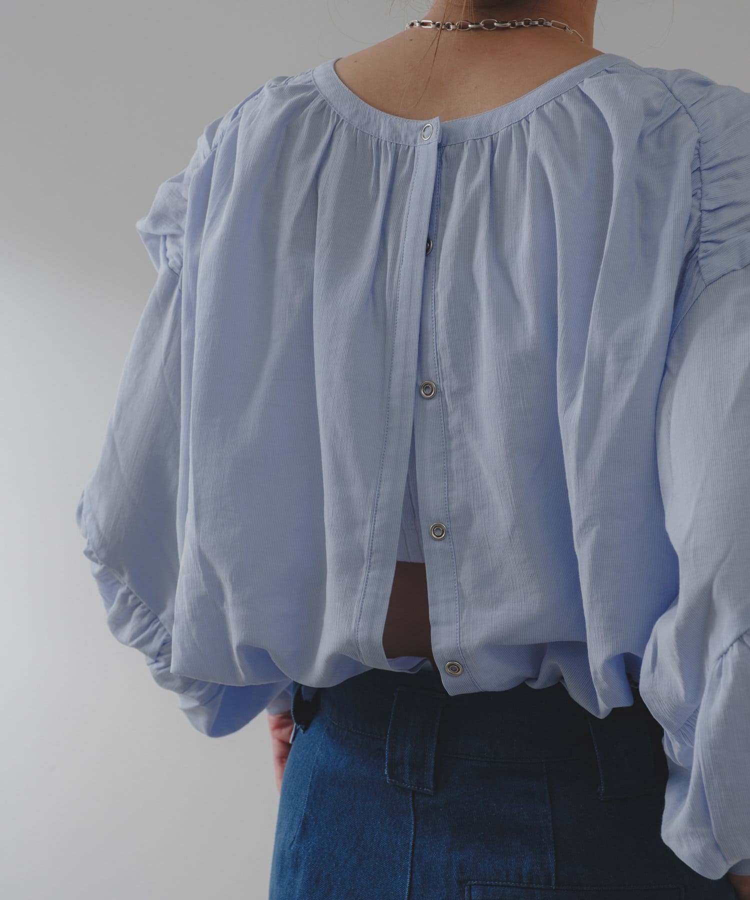 前後どちらでも着用が可能。シャーリングの入っている身頃は、中心の細紐でギャザーを寄せられ、自分好みの位置まで裾を持ち上げてウエスト又は背中を見せて着用いただけます。